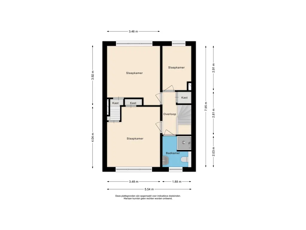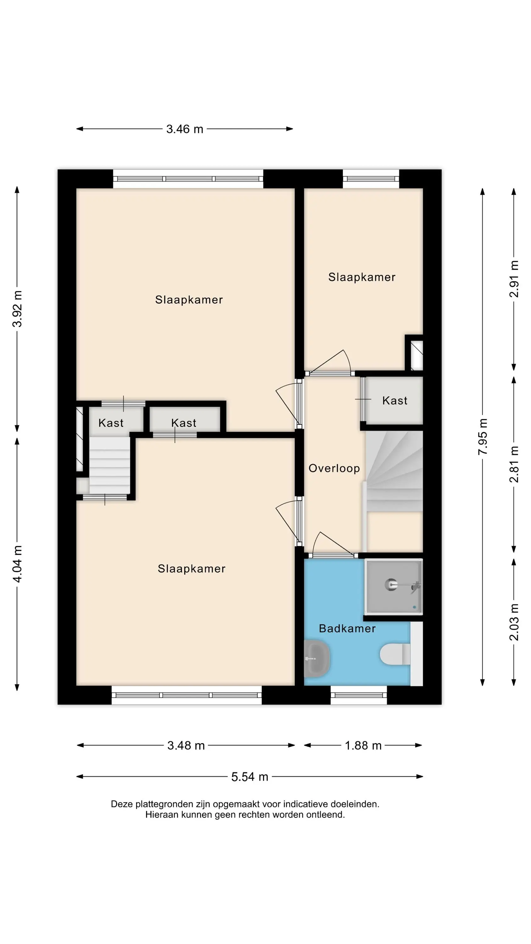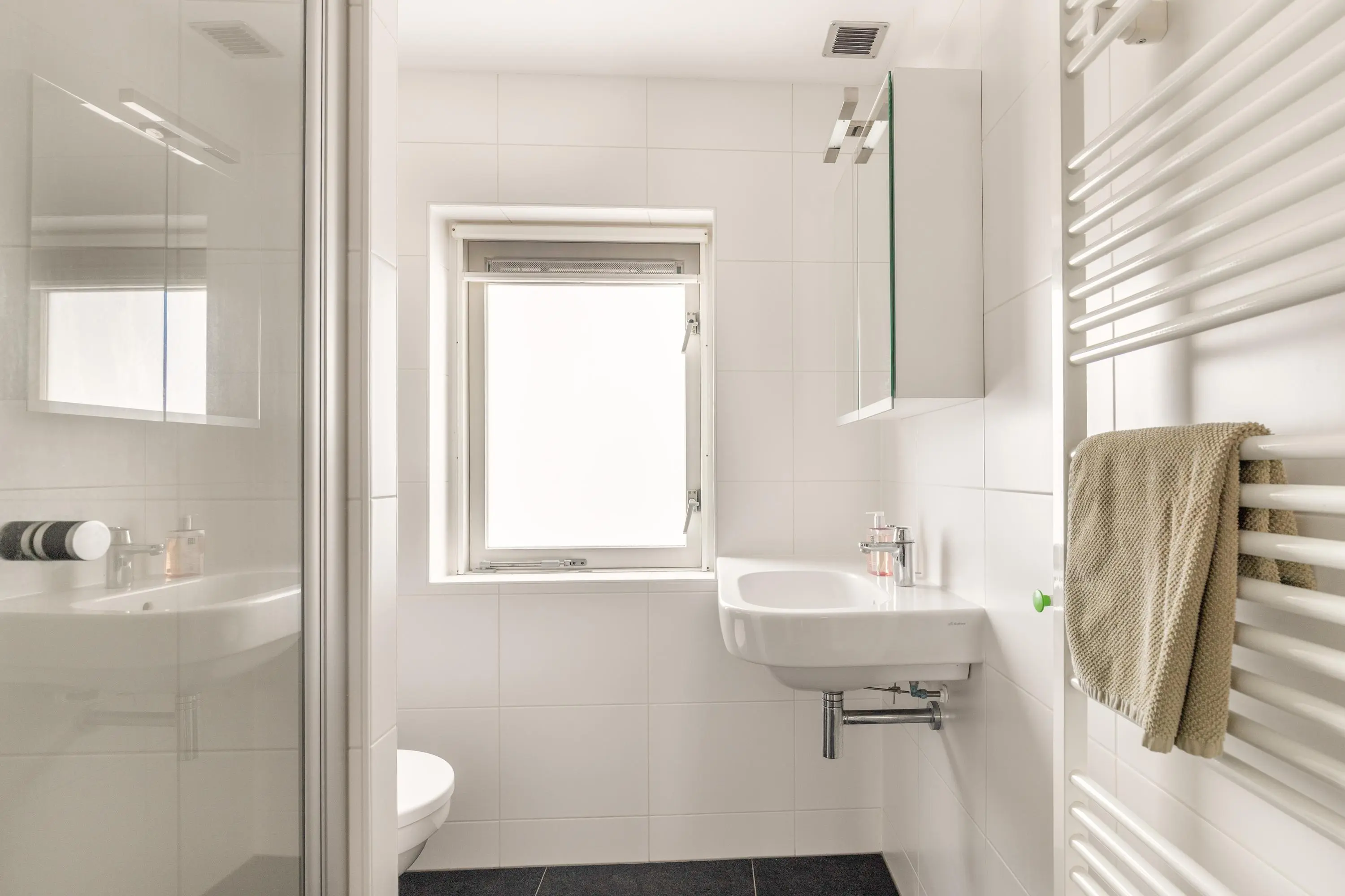 Op de eerste verdieping bevinden zich drie ruime slaapkamers, elk eenvoudig in te richten als slaap-, werk- of studeerkamer. De twee slaapkamers aan de linkerzijde van de woning zijn tevens voorzien van een handige inbouwkast. De nette badkamer is voorzien van een wastafel, douche en toilet. Op de overloop vind je tevens nog een kast voor extra opbergruimte.