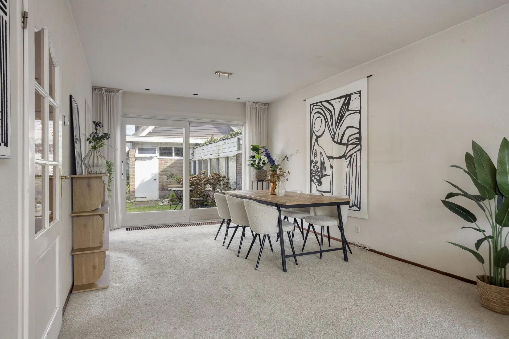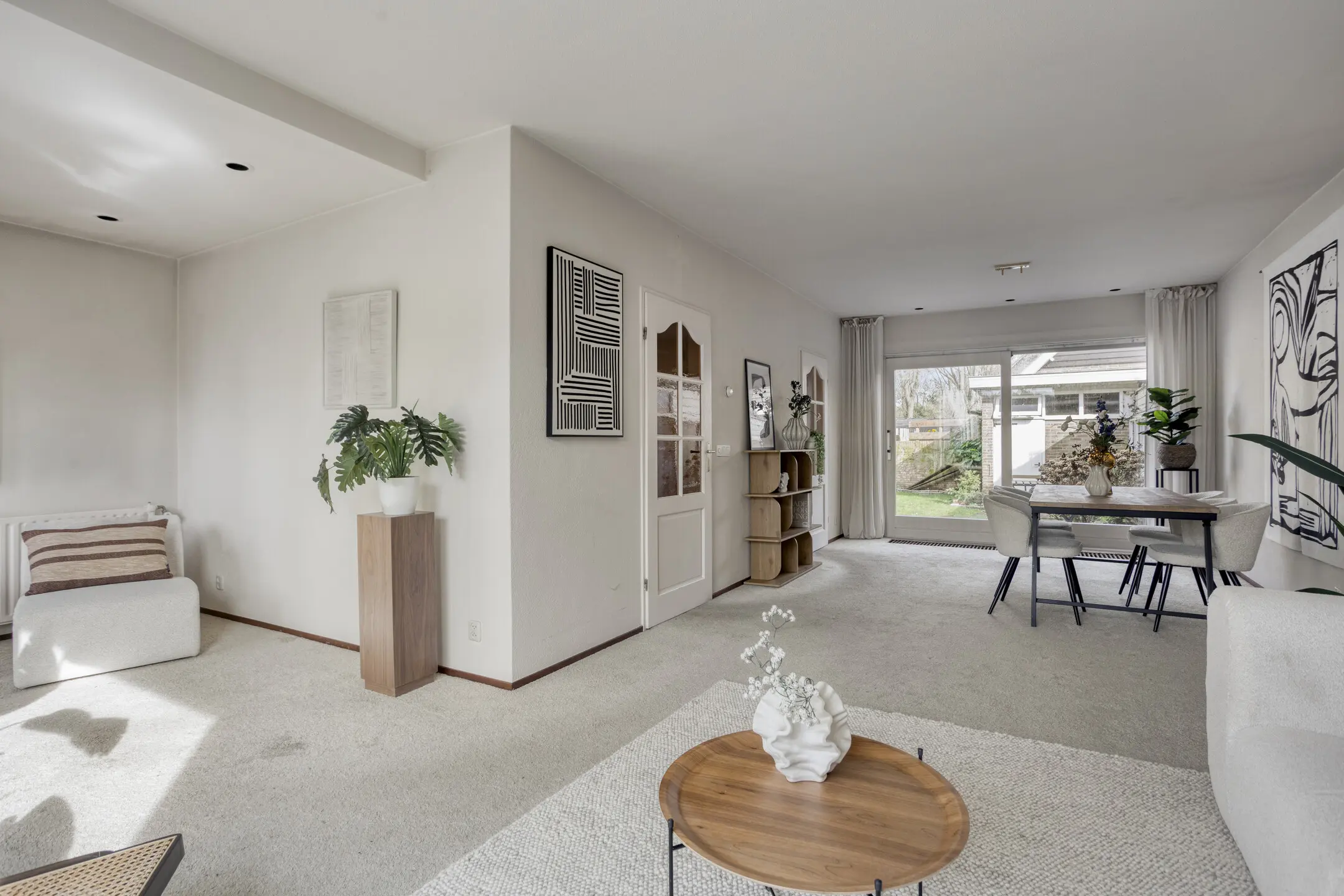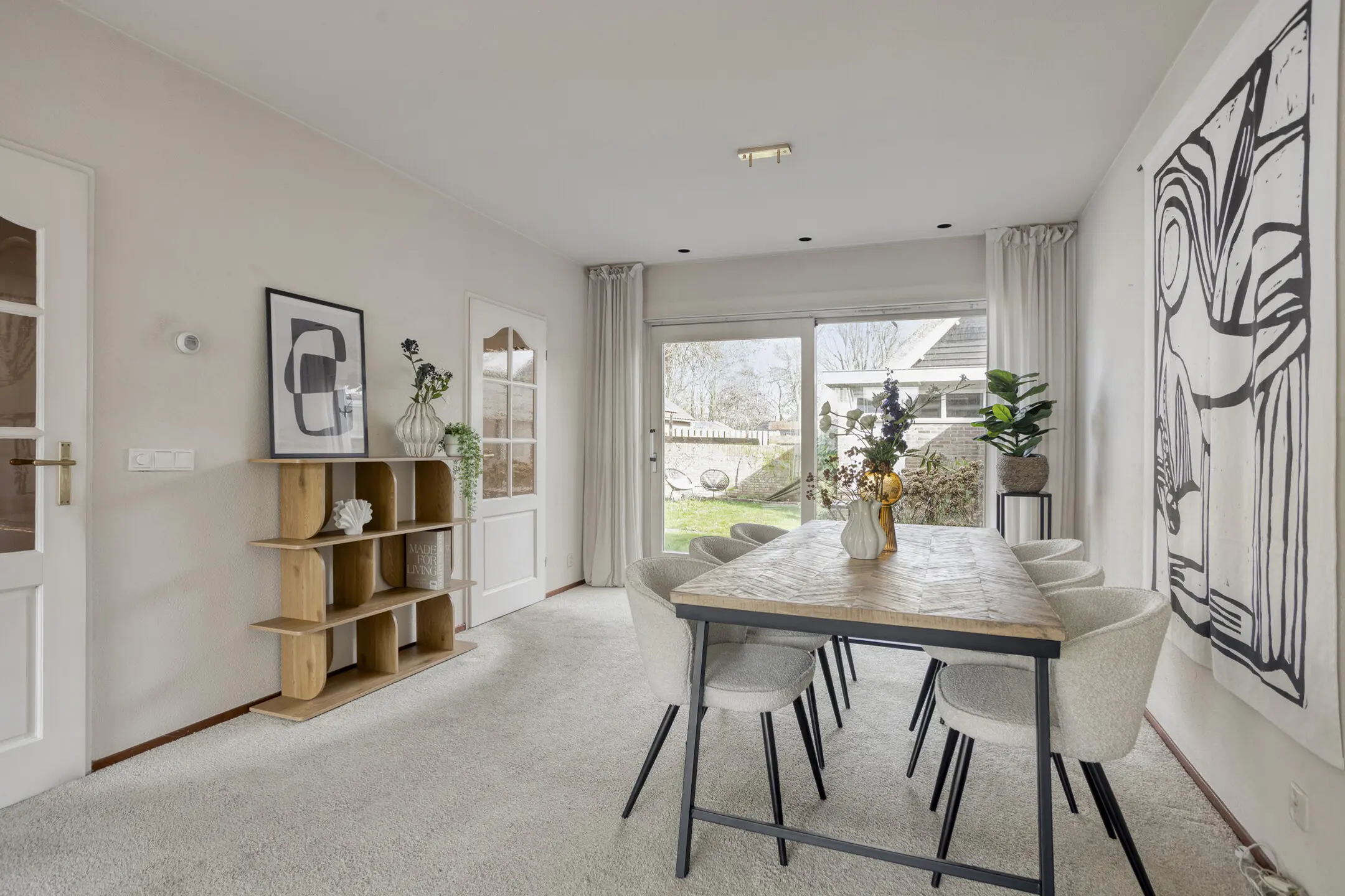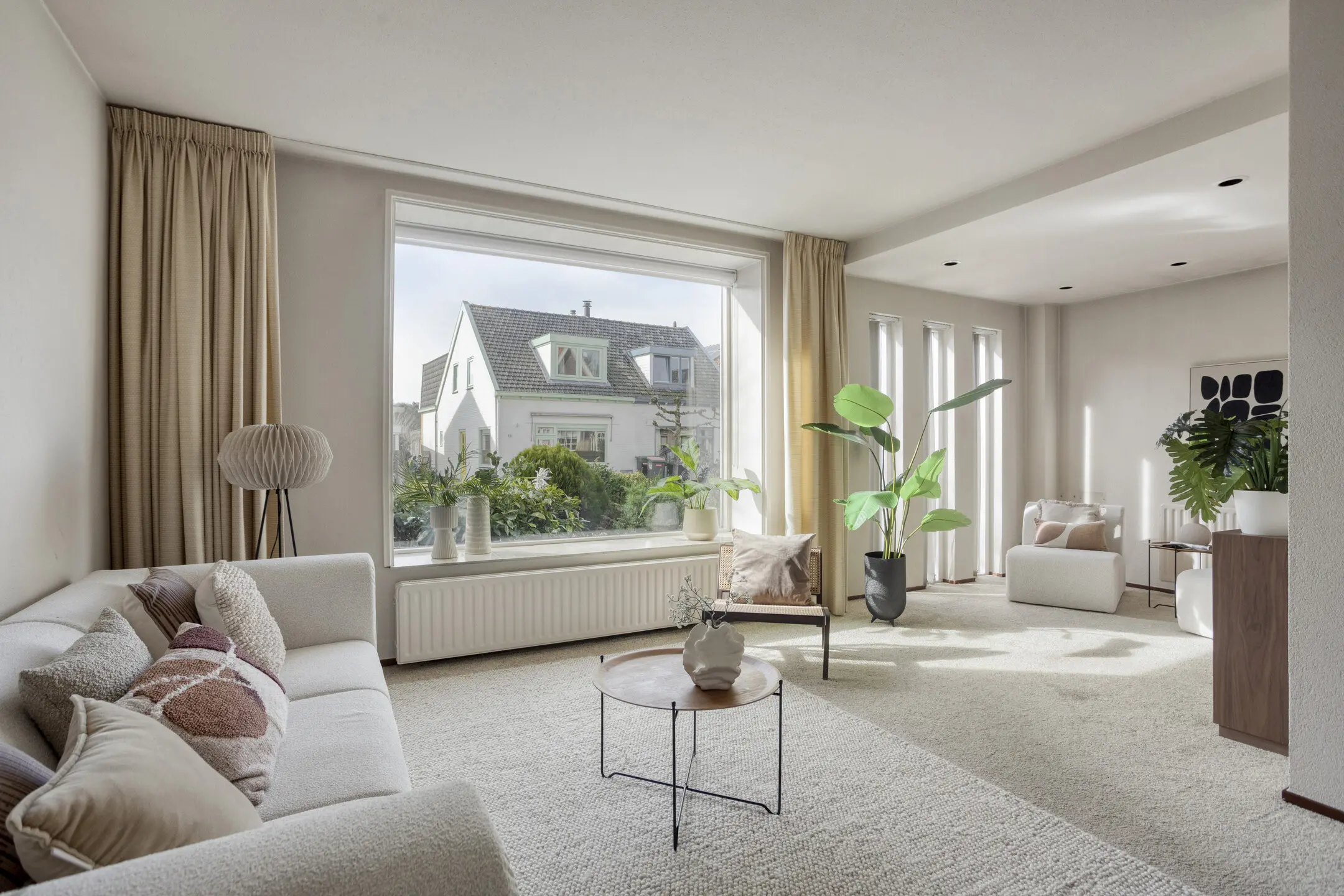 Op de begane grond vind je een ruime woonkamer met een speelse maar prettige indeling. Aan de voorzijde bevindt zich het zitgedeelte met grote raampartijen van vloer tot plafond, waardoor er veel natuurlijk licht binnenkomt. Aan de achterzijde, met uitzicht op de tuin, is het eetgedeelte met keuken. Via zowel de loopdeur als de schuifpui heb je direct toegang tot de privacy-volle achtertuin.