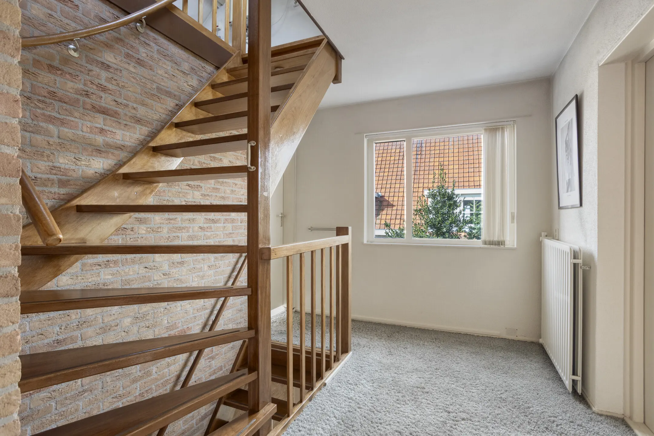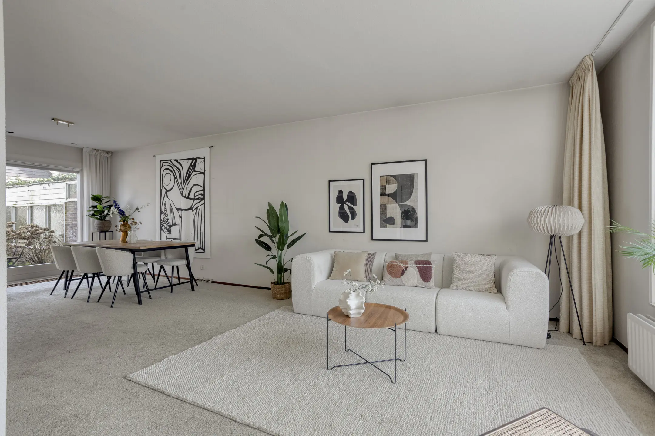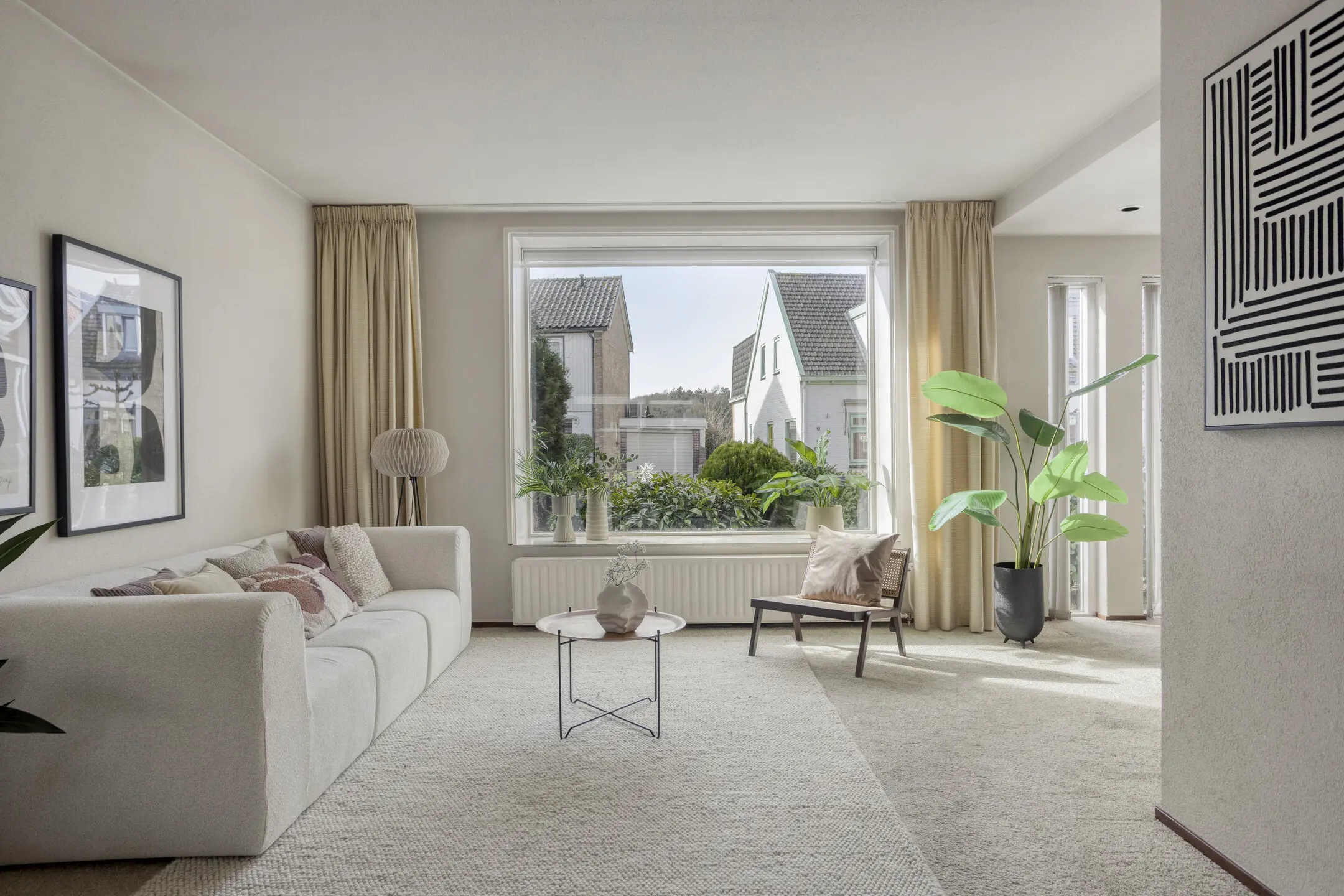 Op de begane grond vind je een ruime woonkamer met een speelse maar prettige indeling. Aan de voorzijde bevindt zich het zitgedeelte met grote raampartijen van vloer tot plafond, waardoor er veel natuurlijk licht binnenkomt. Aan de achterzijde, met uitzicht op de tuin, is het eetgedeelte met keuken. Via zowel de loopdeur als de schuifpui heb je direct toegang tot de privacy-volle achtertuin.