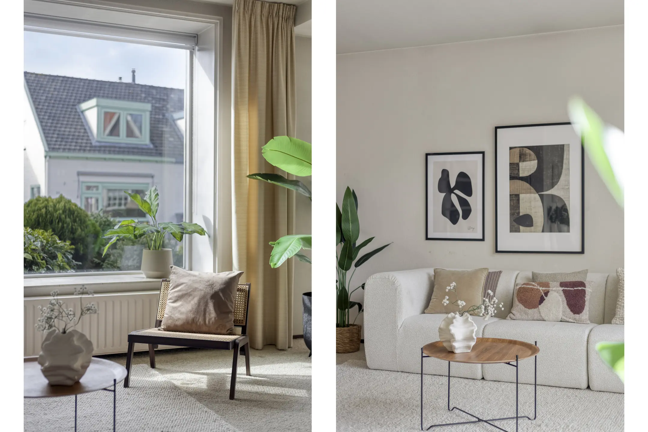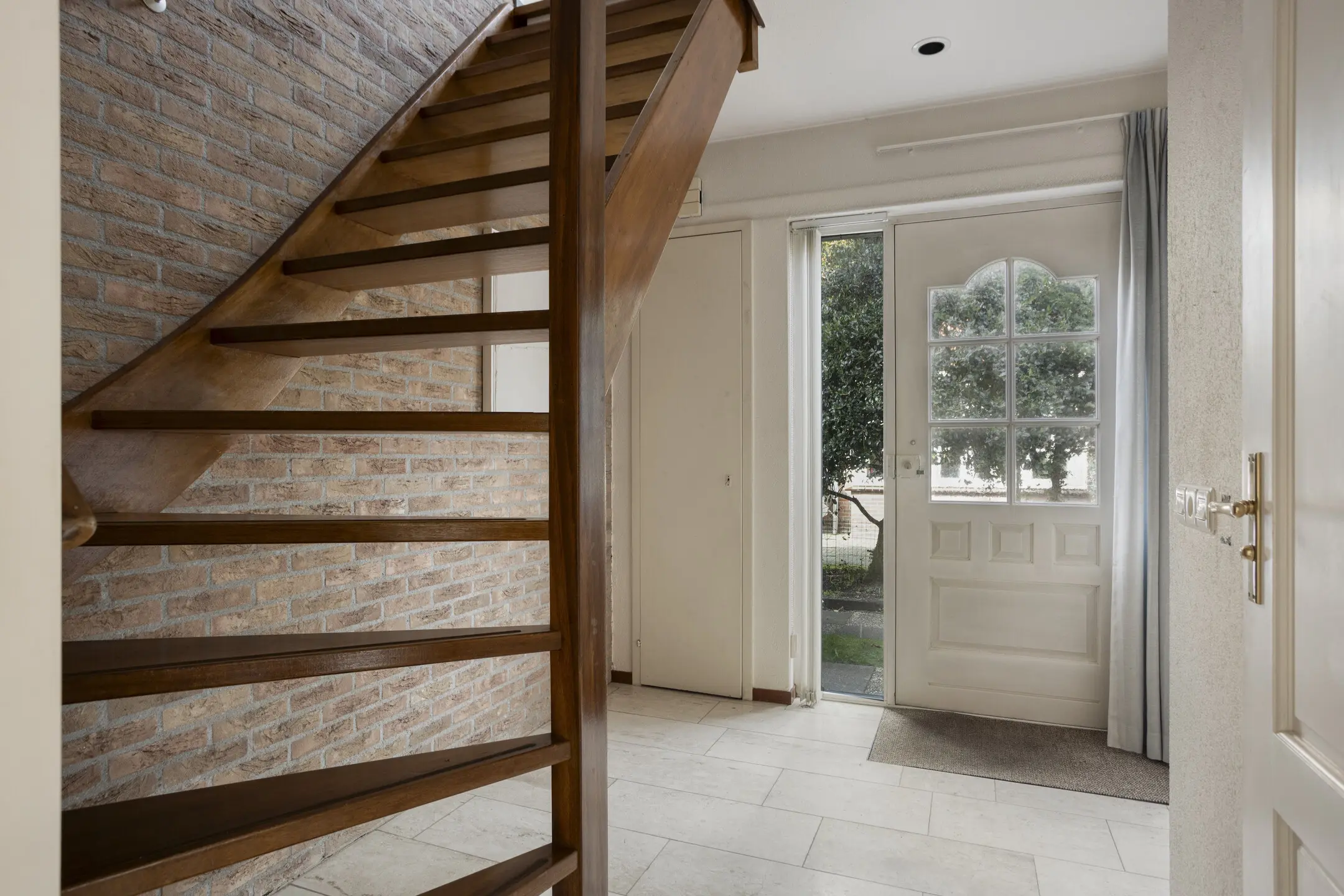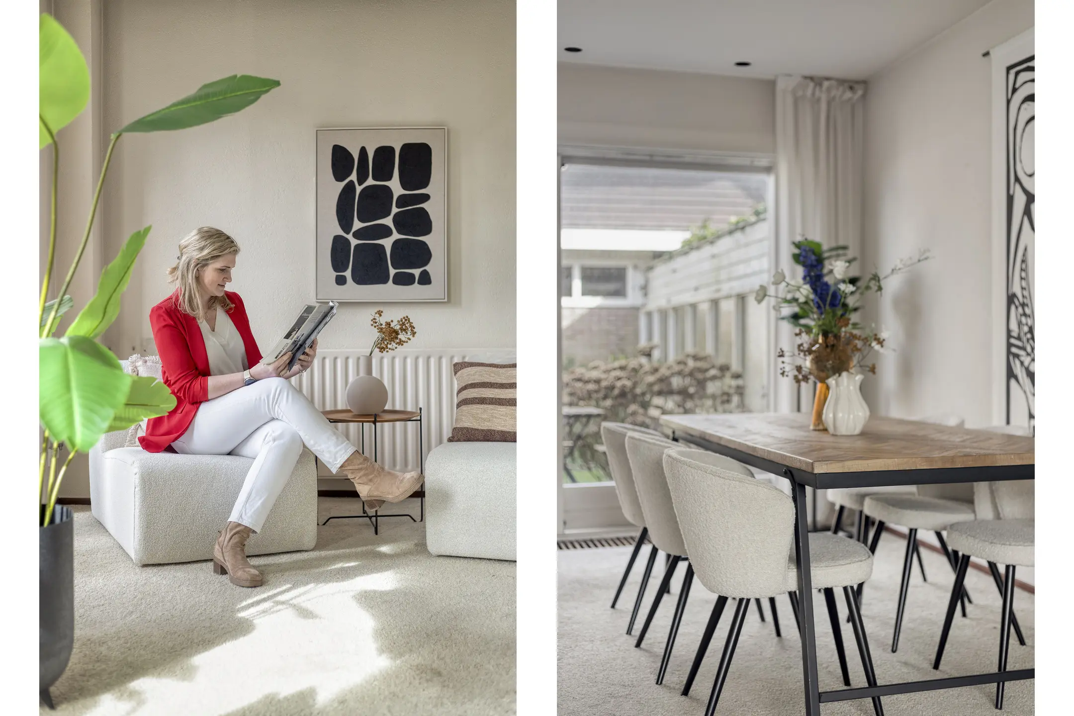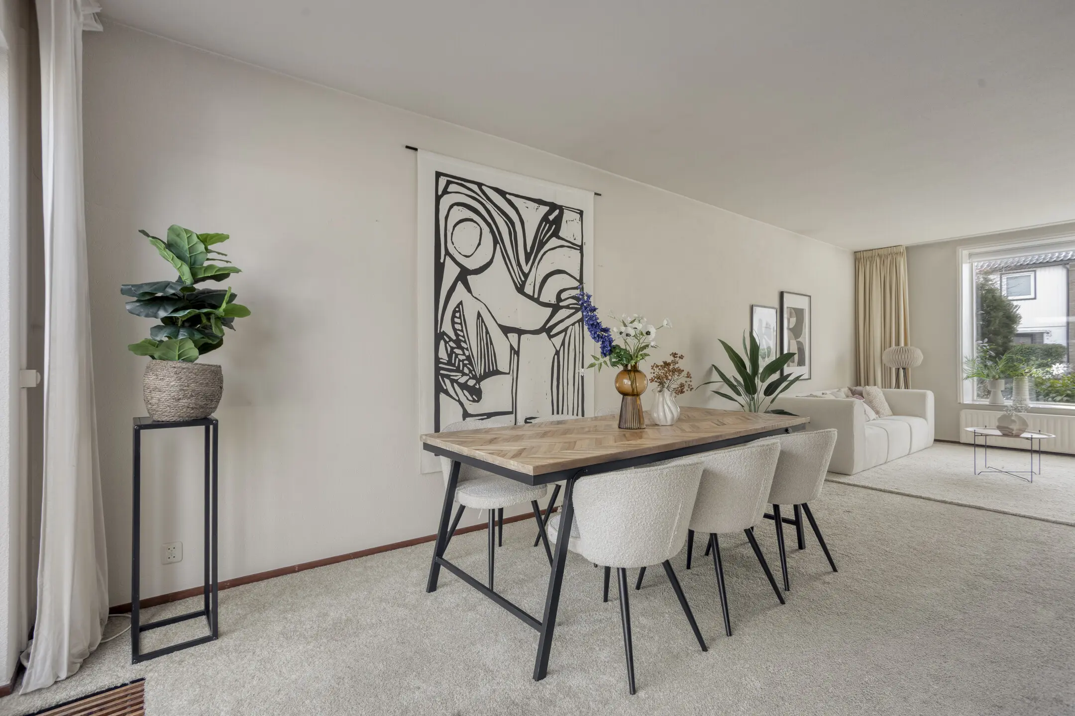 Op de begane grond vind je een ruime woonkamer met een speelse maar prettige indeling. Aan de voorzijde bevindt zich het zitgedeelte met grote raampartijen van vloer tot plafond, waardoor er veel natuurlijk licht binnenkomt. Aan de achterzijde, met uitzicht op de tuin, is het eetgedeelte met keuken. Via zowel de loopdeur als de schuifpui heb je direct toegang tot de privacy-volle achtertuin.