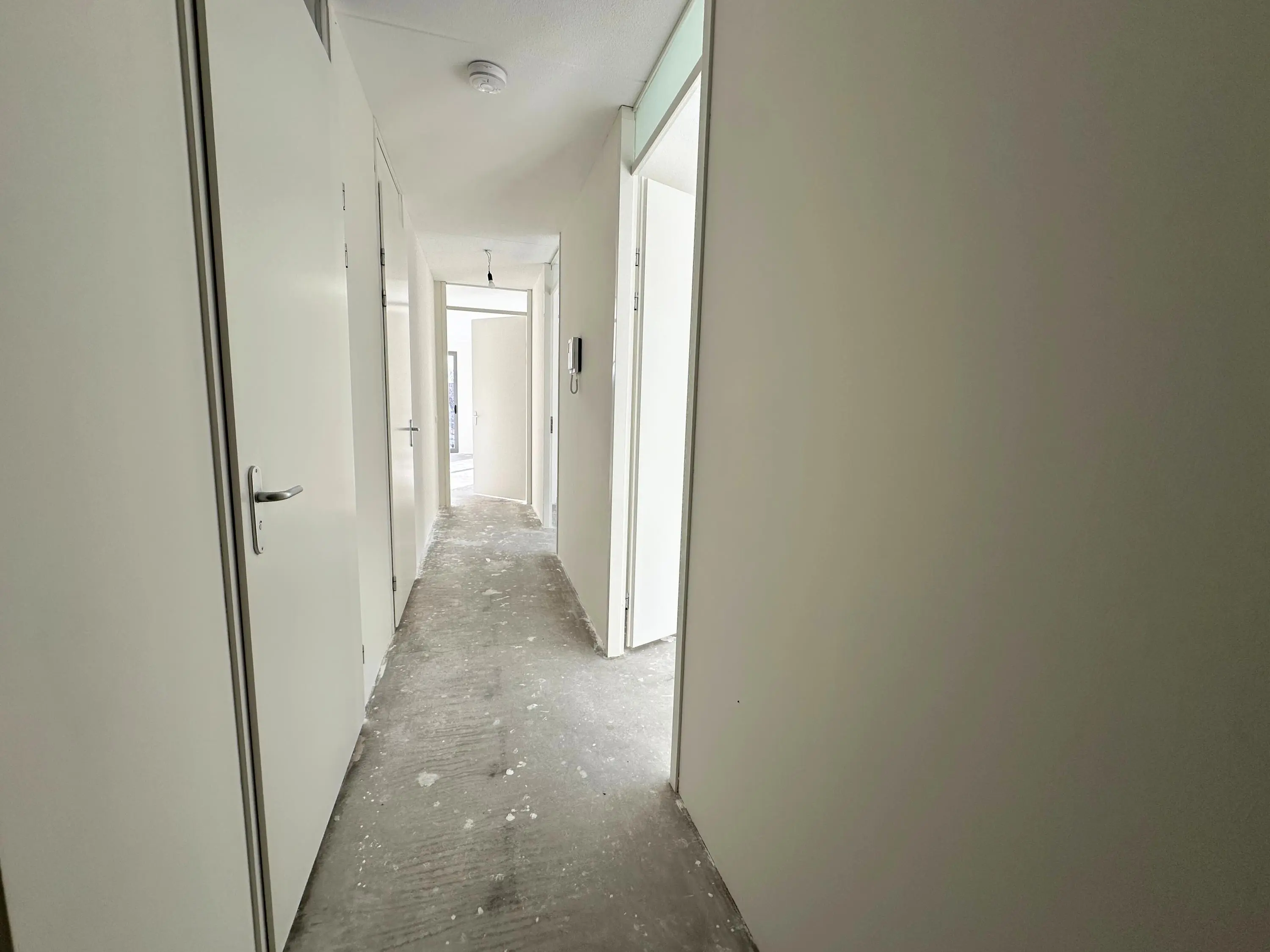Via de centrale entree met lift en trappenhuis bereik je het appartement op de eerste verdieping. Je komt binnen in een ruime hal die toegang geeft tot alle vertrekken.