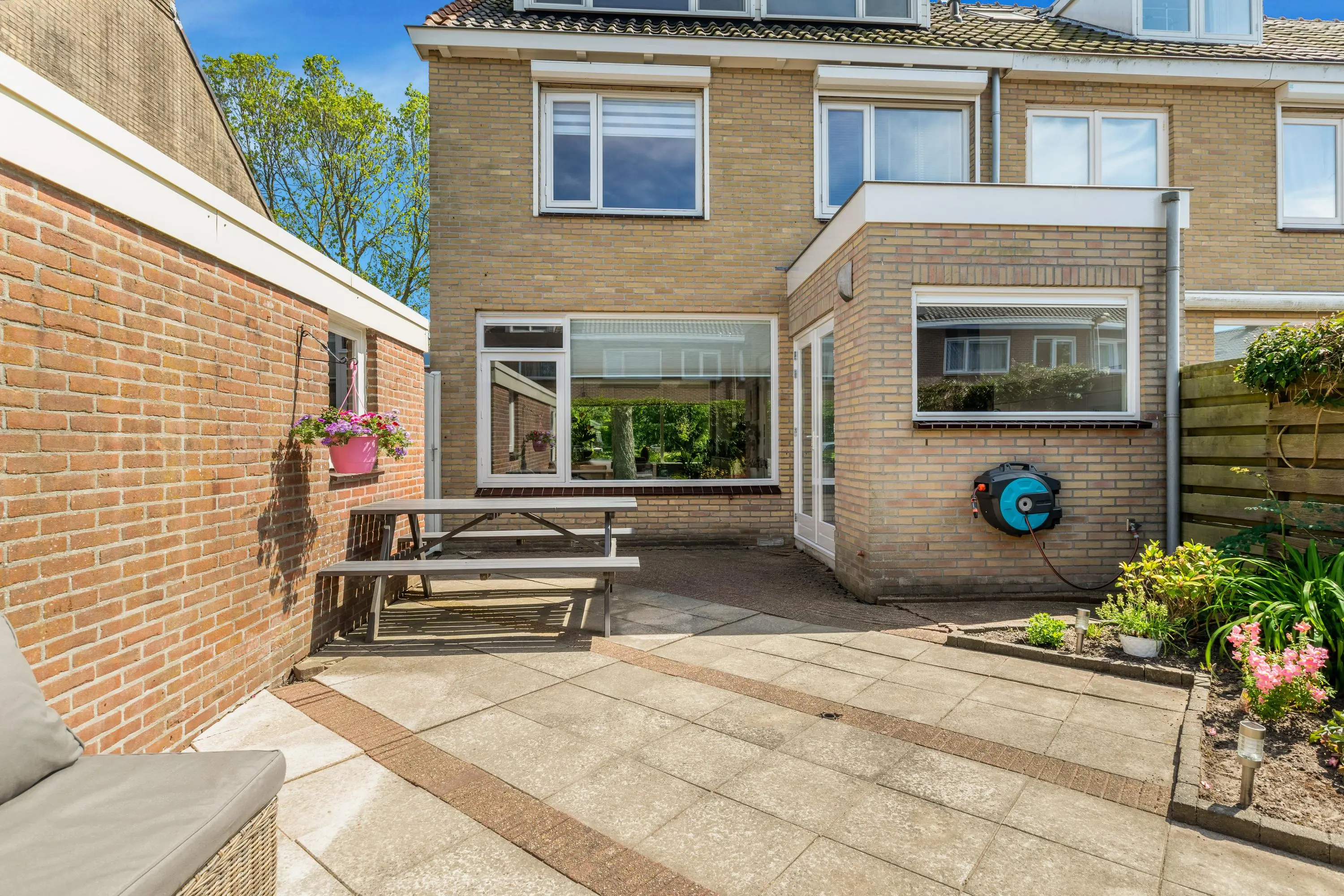 In de zonnige achtertuin is het op elk moment van de dag genieten. Ontbijten, lunchen of barbecueën? Zeg het maar, je zit hier altijd goed! In de zeer grote vrijstaande stenen garage parkeer je je auto en de fietsen. Of maak gebruik van de oprit, hier is genoeg plek om meerdere auto's te parkeren.