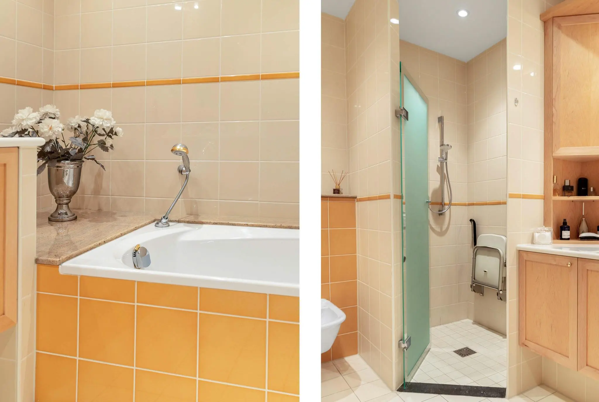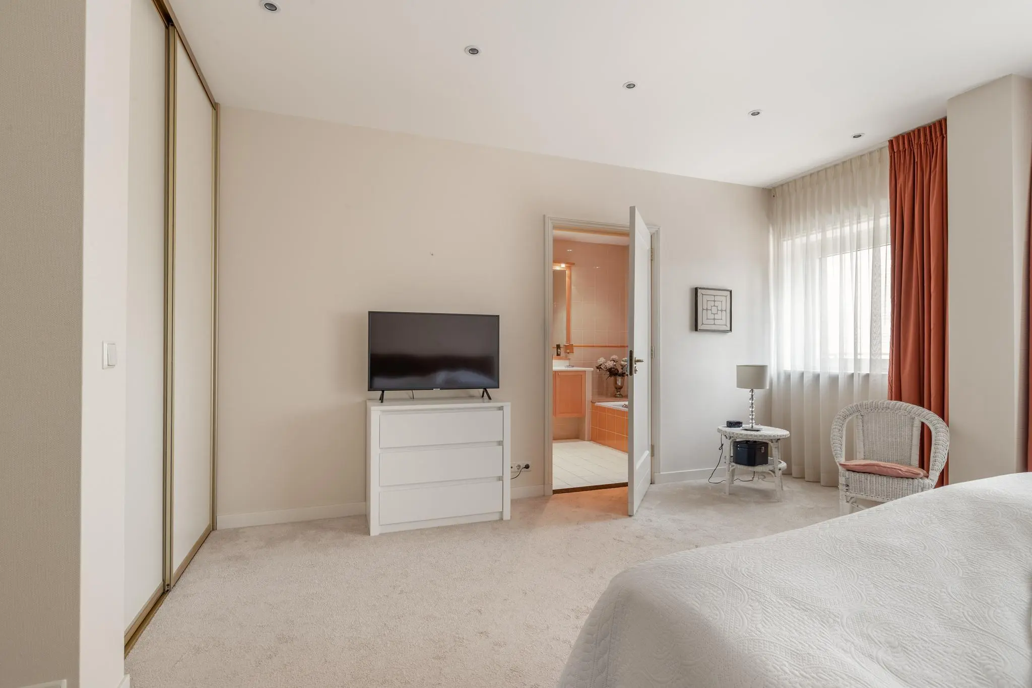 Het appartement beschikt over twee ruime slaapkamers, elk met een eigen en suite badkamer. De hoofdslaapkamer heeft een luxe badkamer met zowel een ligbad als een inloopdouche. De tweede slaapkamer heeft een en suite badkamer met inloopdouche en wastafel. Deze indeling garandeert optimale privacy en comfort voor zowel bewoners als gasten. Bovendien is er een aparte inpandige berging met aansluiting voor wasmachine en droger. De woning is volledig geïsoleerd en deels voorzien van vloerverwarming.