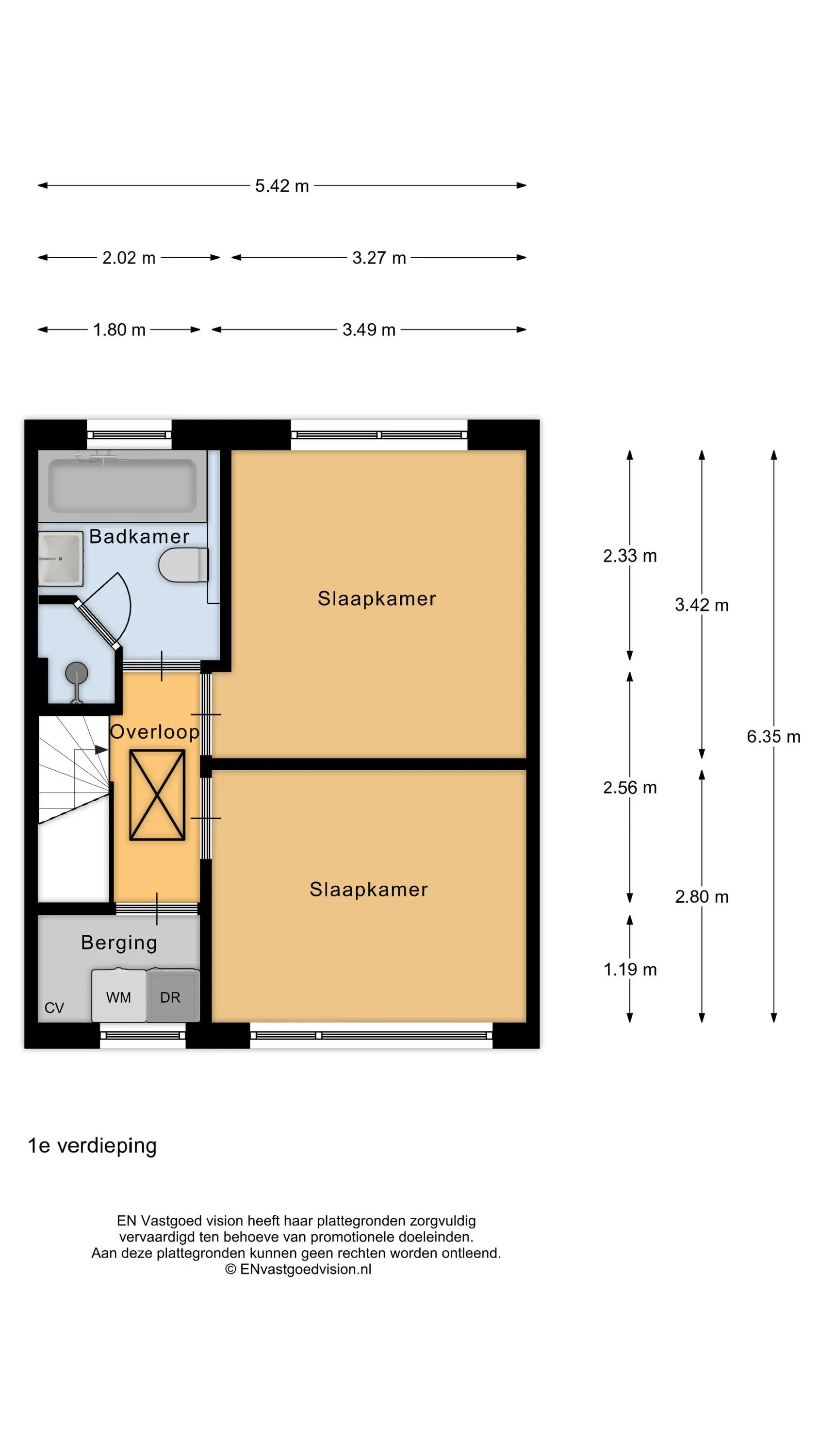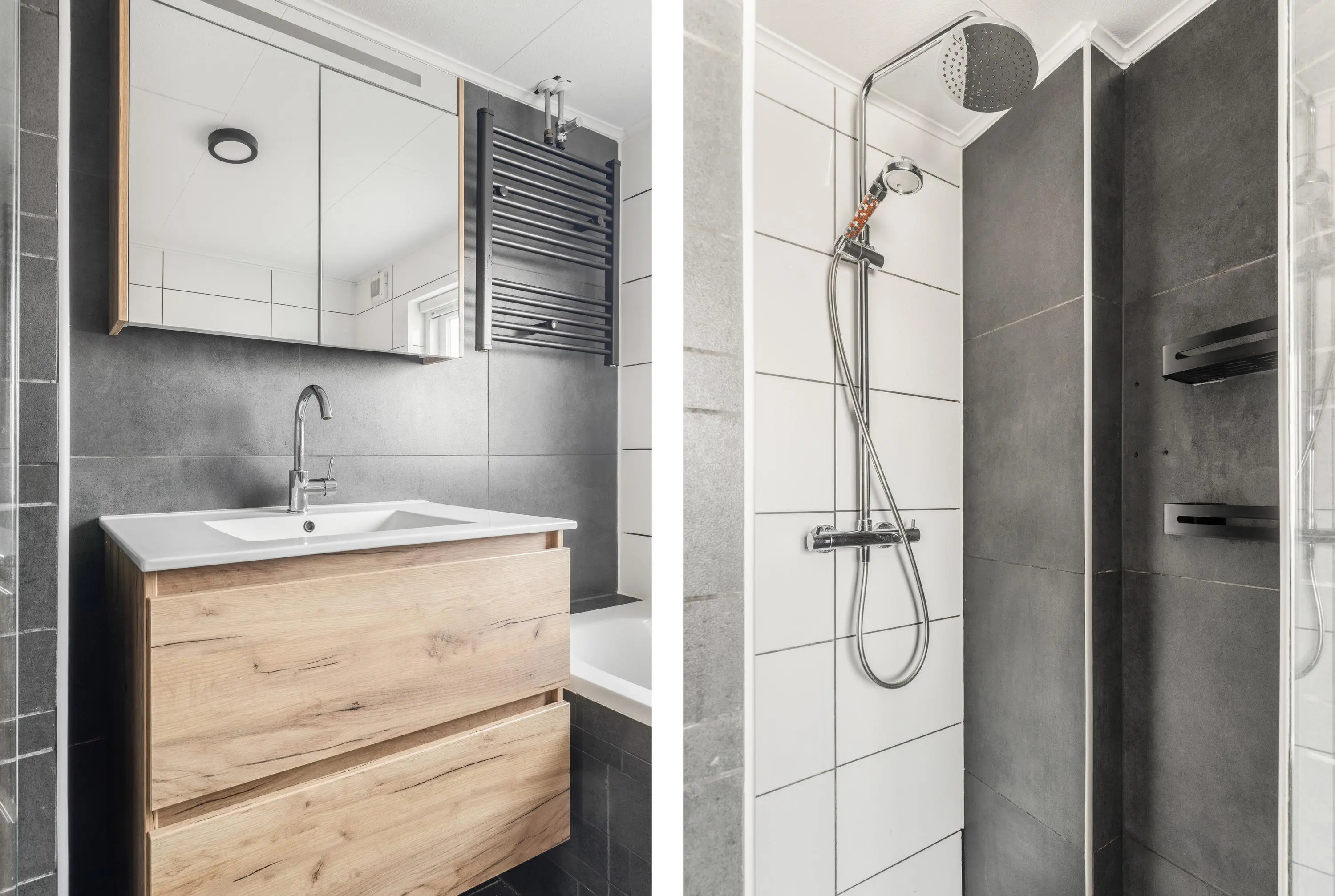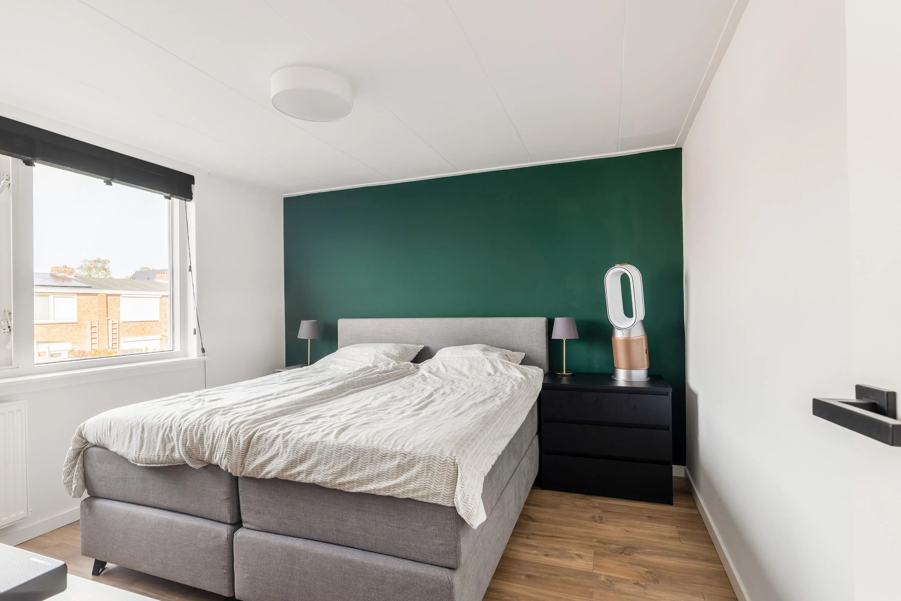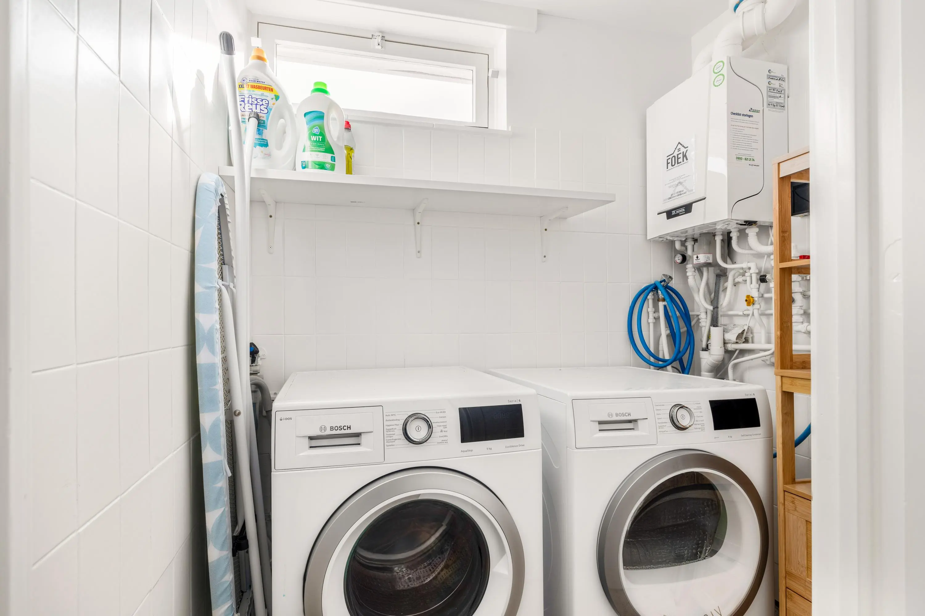 Boven tref je twee ruime, lichte slaapkamers. De derde 'mini' kamer is omgetoverd tot een praktische wasruimte met plek voor zowel de wasmachine, droger als de cv-ketel. Slim, netjes en efficiënt.