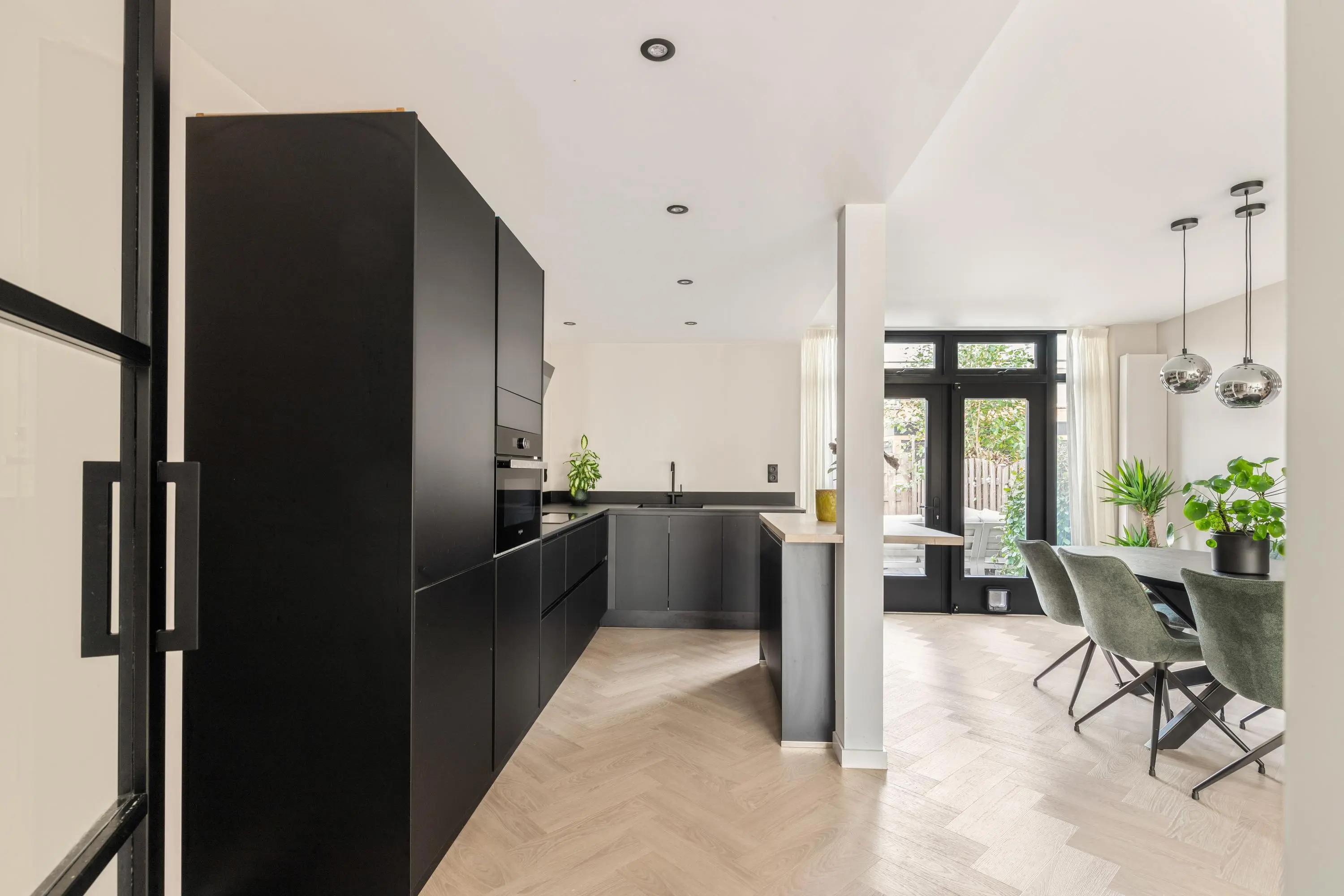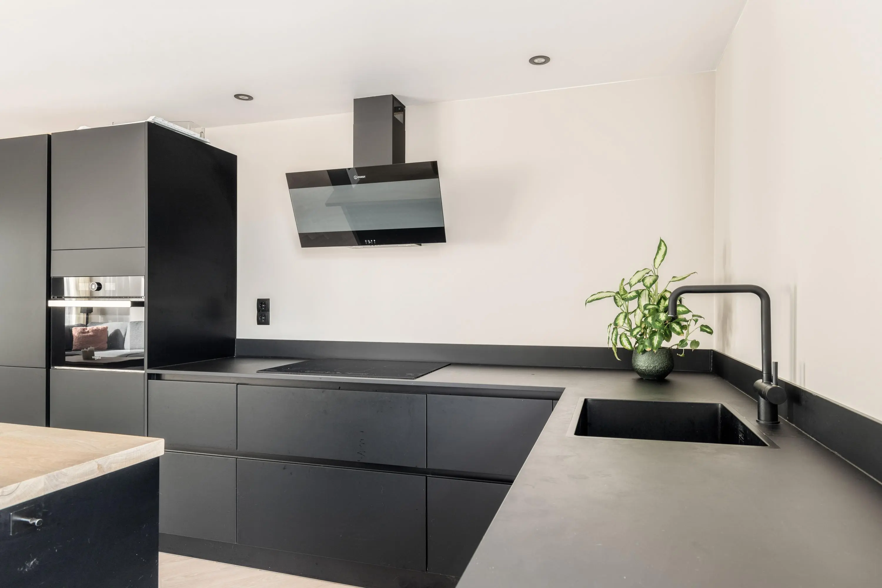 De fraaie moderne open keuken is een plaatje op zich. Een modern schiereiland vormt het hart van de ruimte en perfect om gezellig bij te praten tijdens het koken. De inbouwapparatuur in dezelfde zwarte lijn als de fronten en alles is slim ingedeeld. Van het strakke dunne werkblad tot lades met soft-close: hier is aan comfort gedacht.