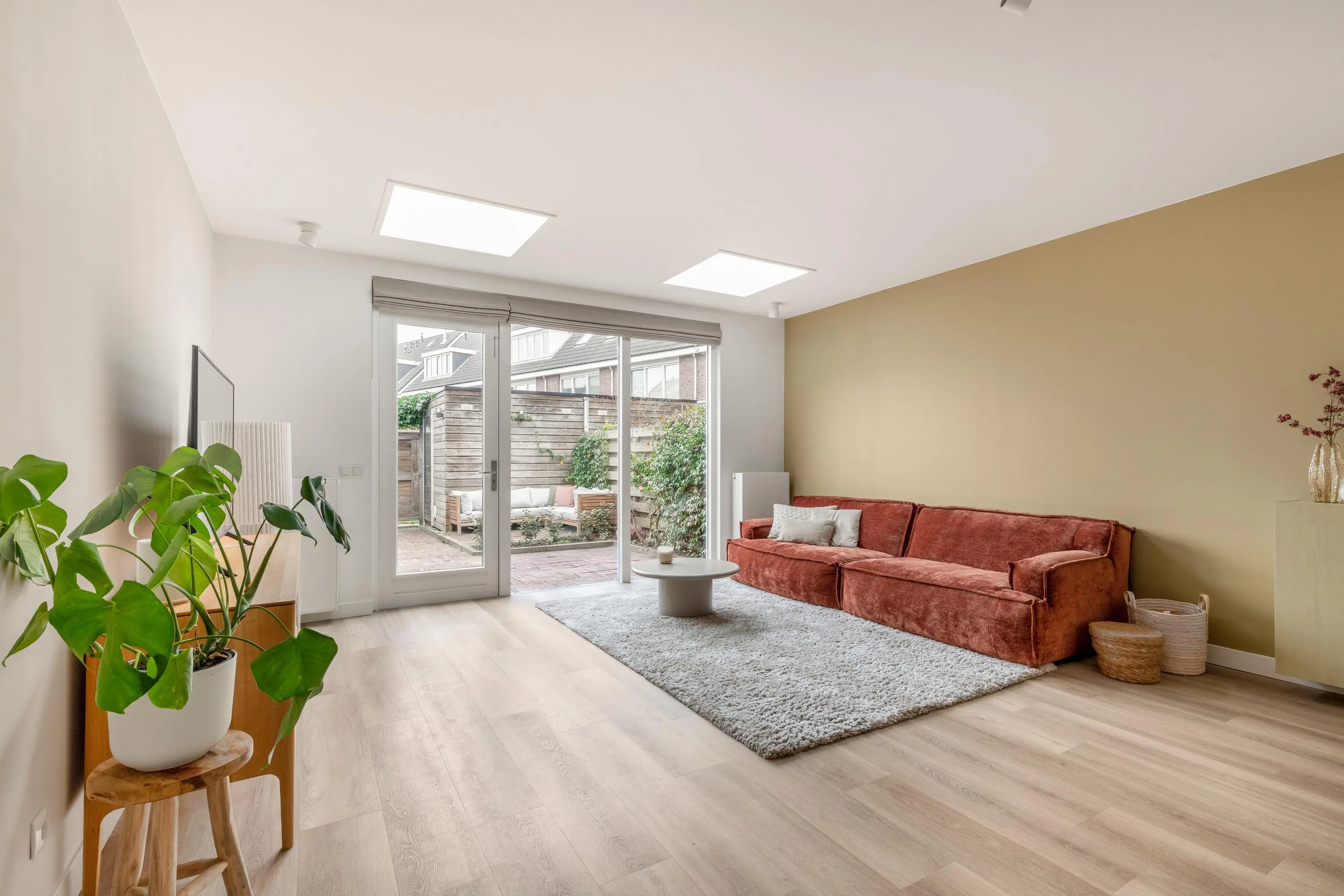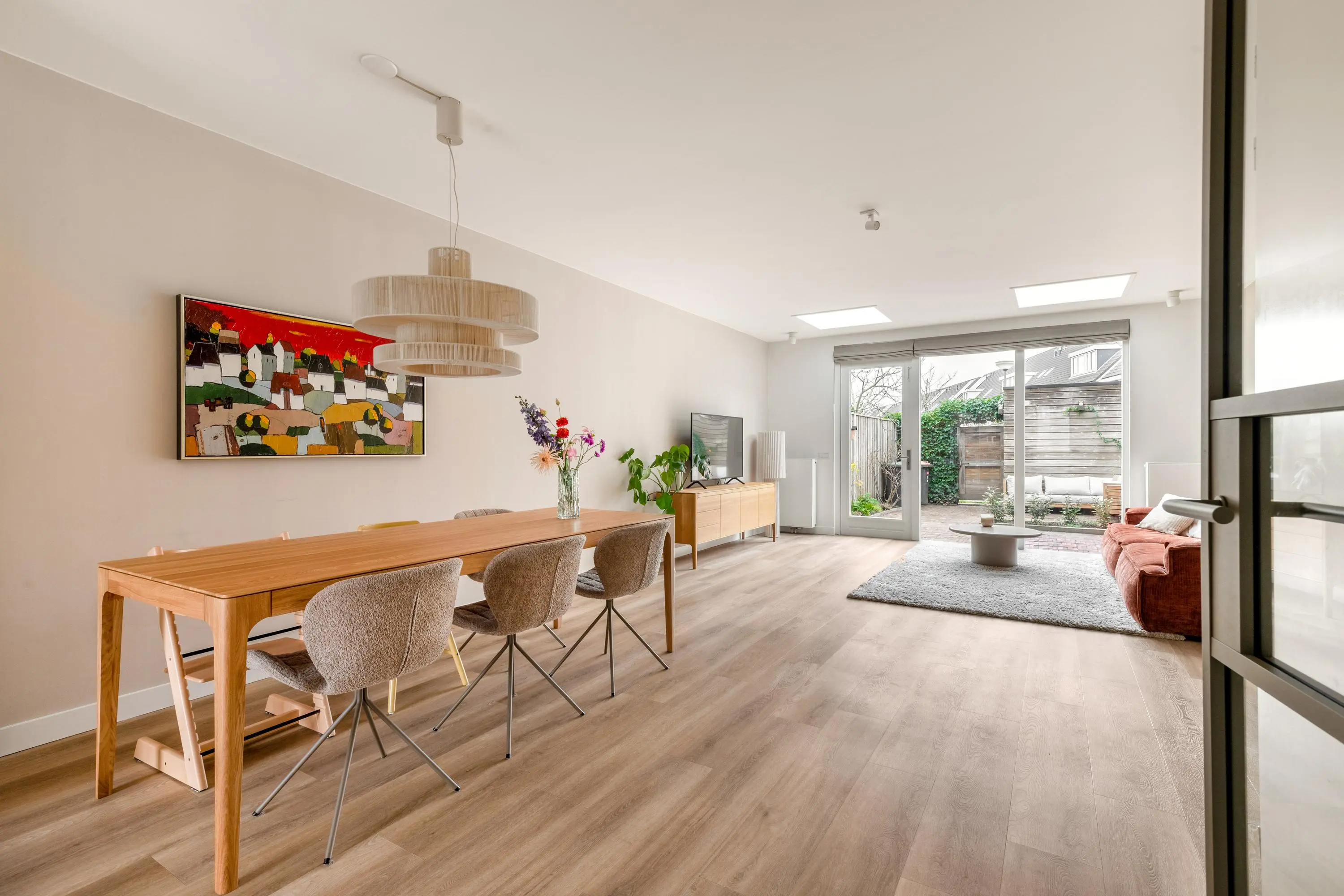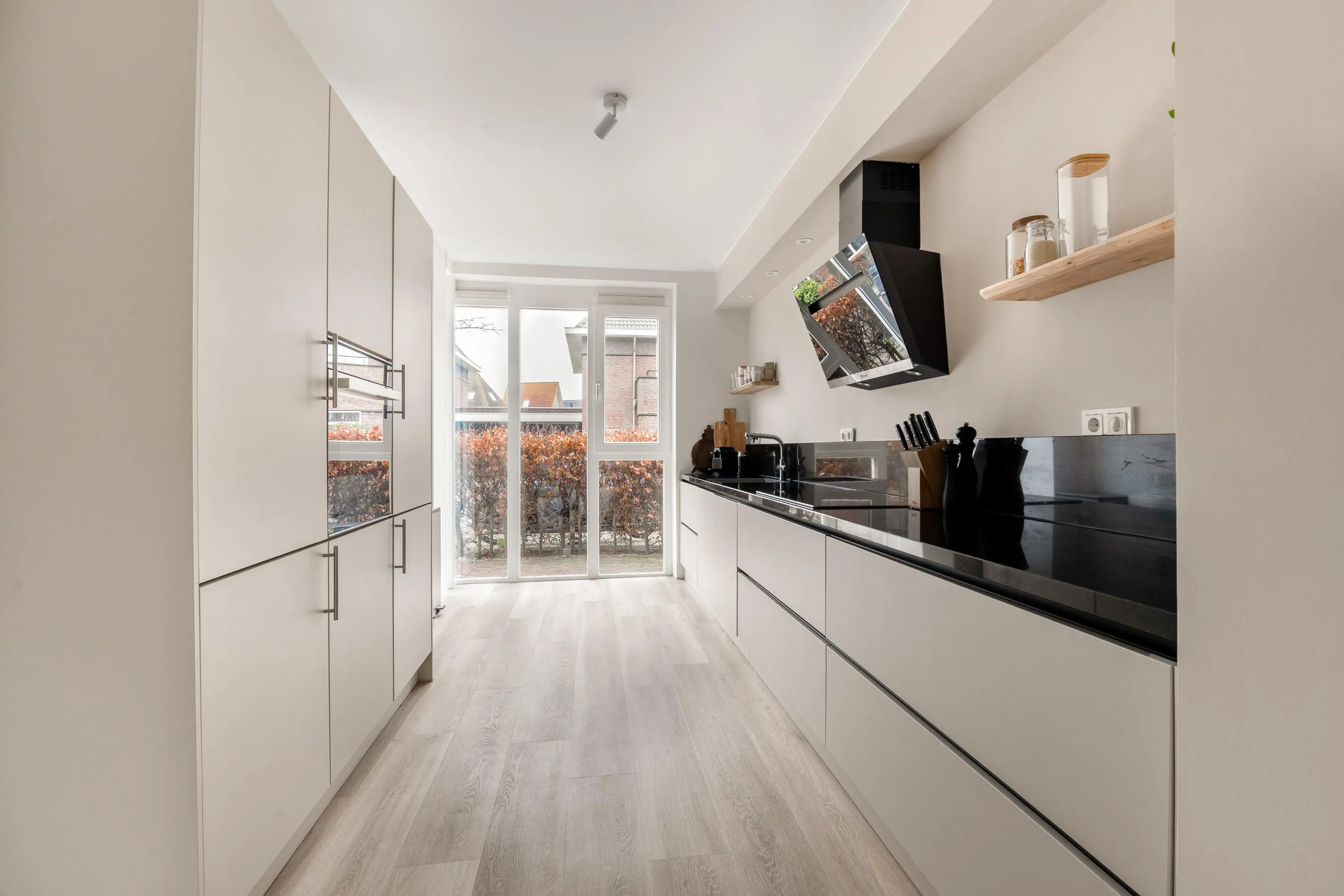 De woning is aan de achterzijde uitgebouwd en kenmerkt zich door de grote raampartijen en een dakraam, wat zorgt voor een heerlijke lichtinval. De gehele woning is met zorg en smaak ingericht, waardoor je hier als nieuwe bewoner direct kunt genieten van comfort en ruimte. Aan de voorzijde van de woning bevindt zich de moderne keuken, compleet uitgerust met een inductiekookplaat, afzuigkap, combi-oven, koelkast, vriezer, vaatwasser en een Quooker.