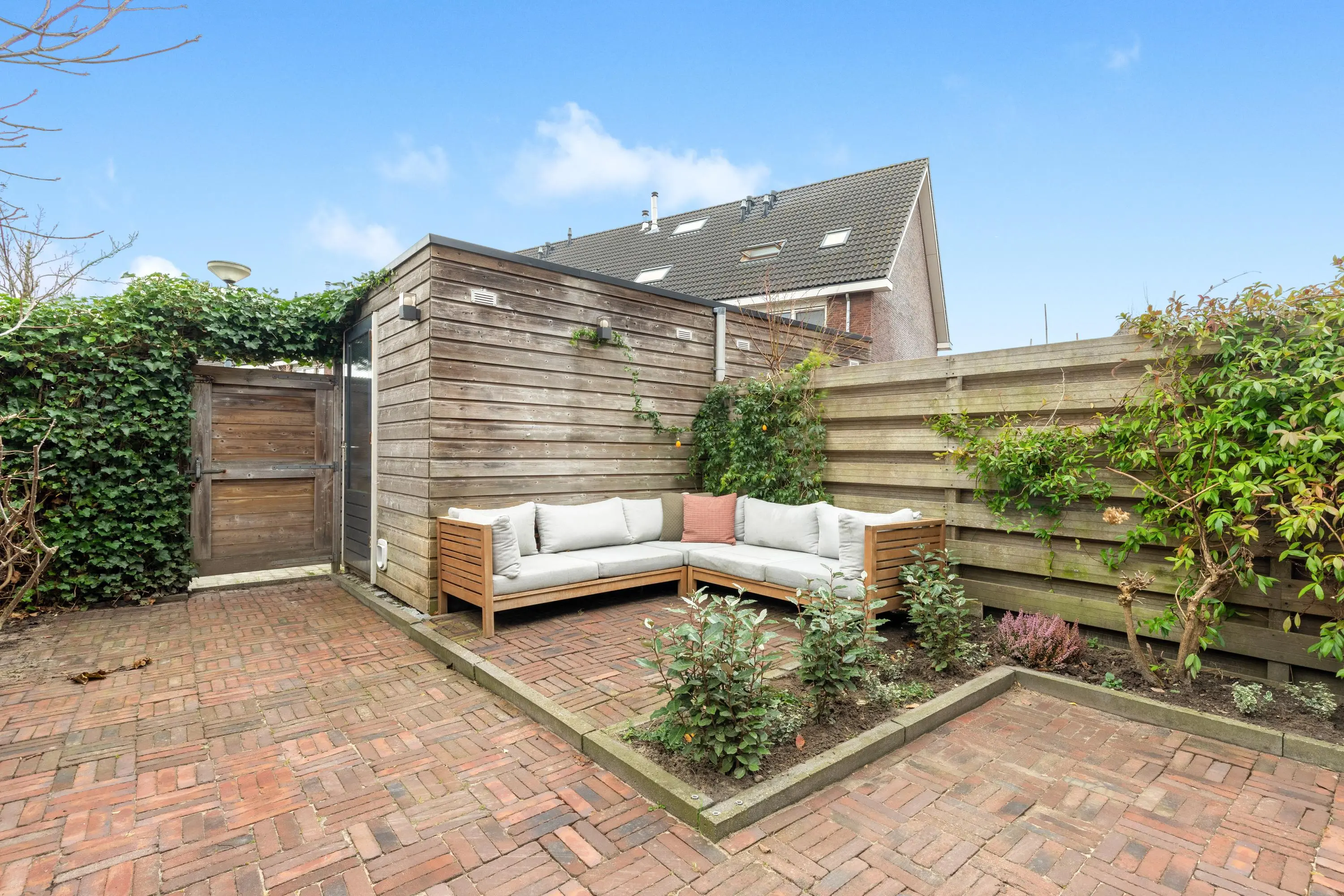 De achtertuin is onderhoudsvriendelijk aangelegd en grotendeels bestraat, met beplanting langs de zijkanten. Achter in de tuin staat een houten berging en er is een achterom aanwezig. Direct achter de woning ligt een speeltuintje waar kinderen veilig en dichtbij huis kunnen spelen.