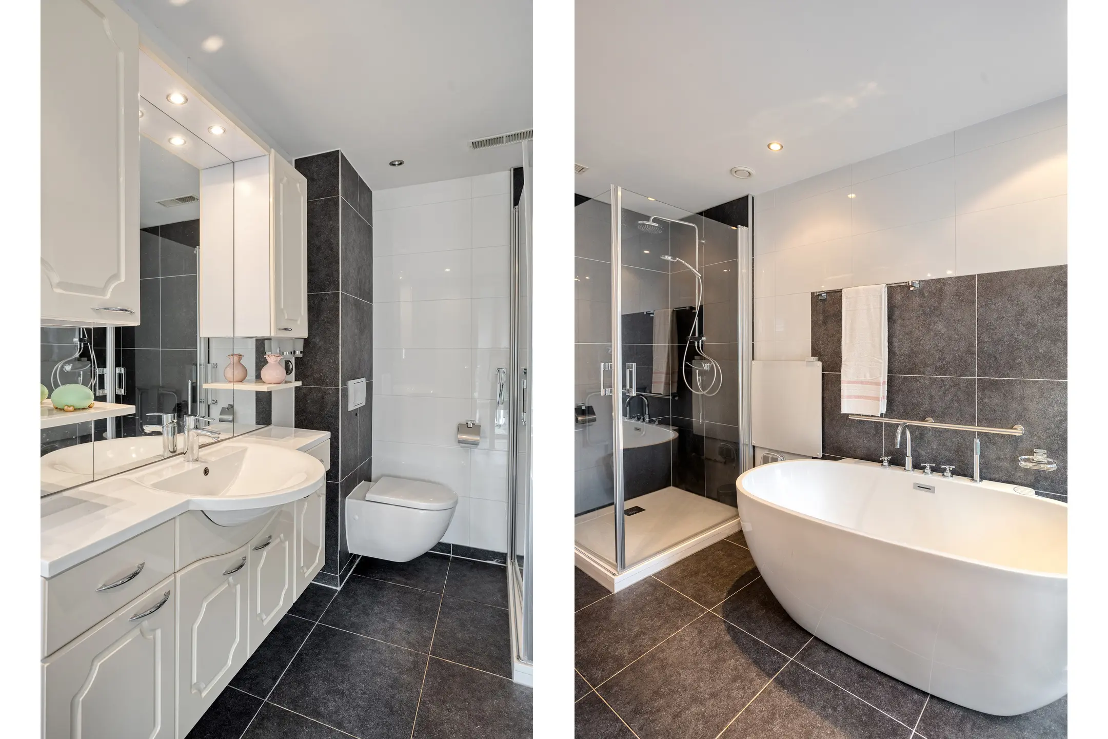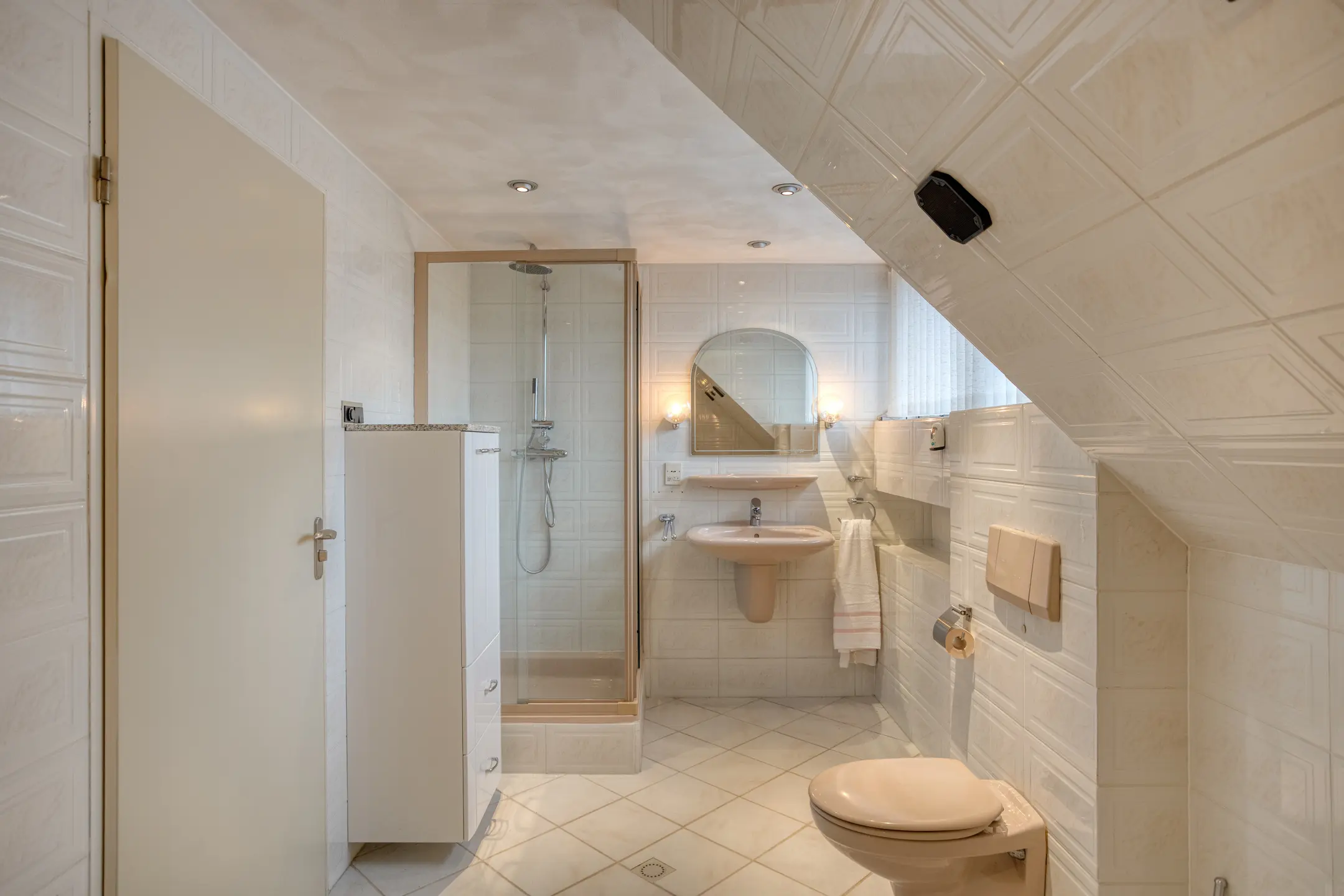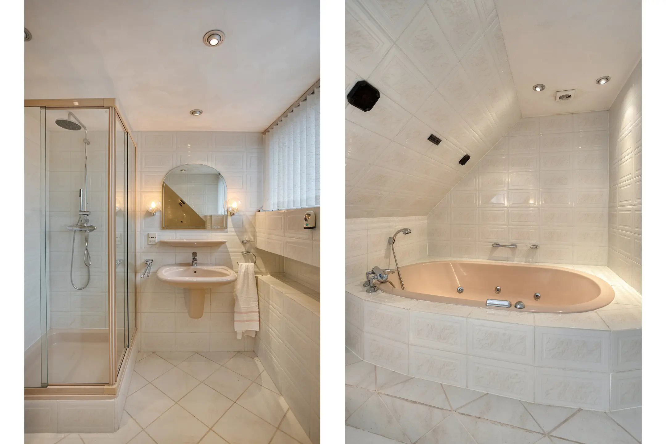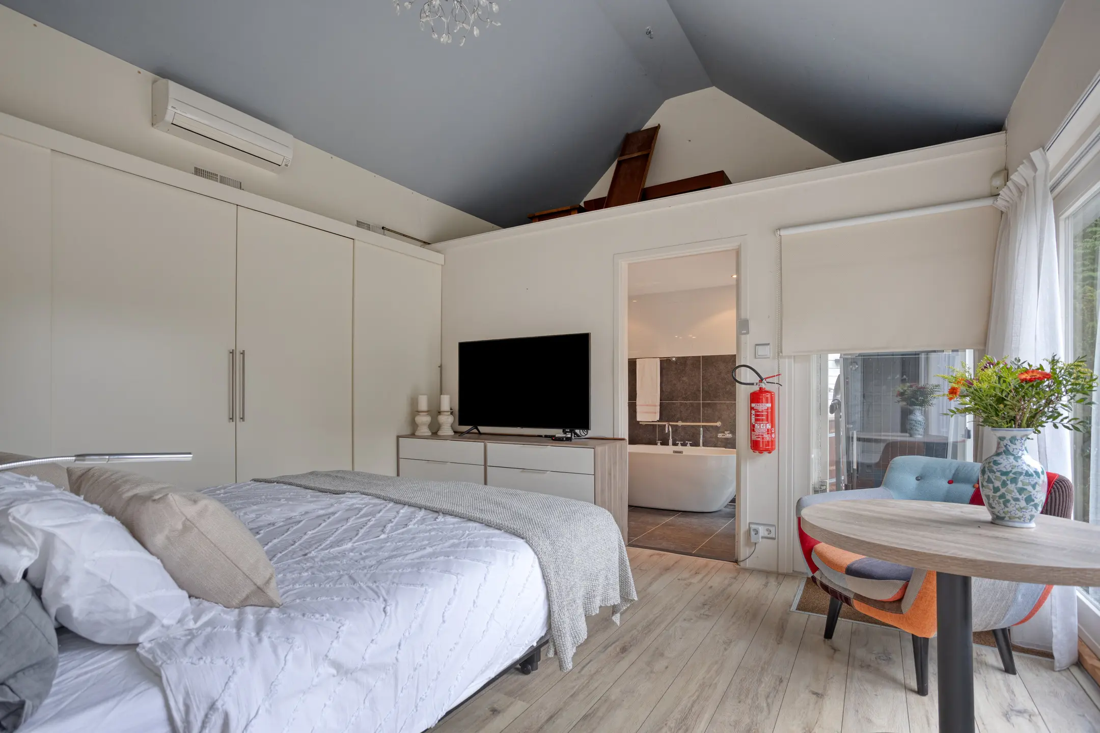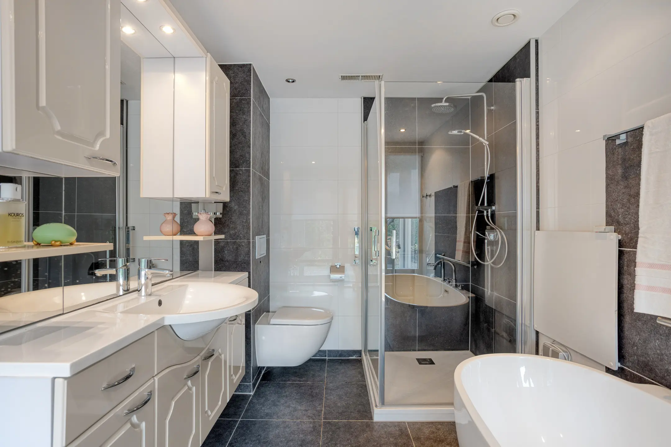 De royale badkamer heeft een douche, ligbad, toilet en wastafel.