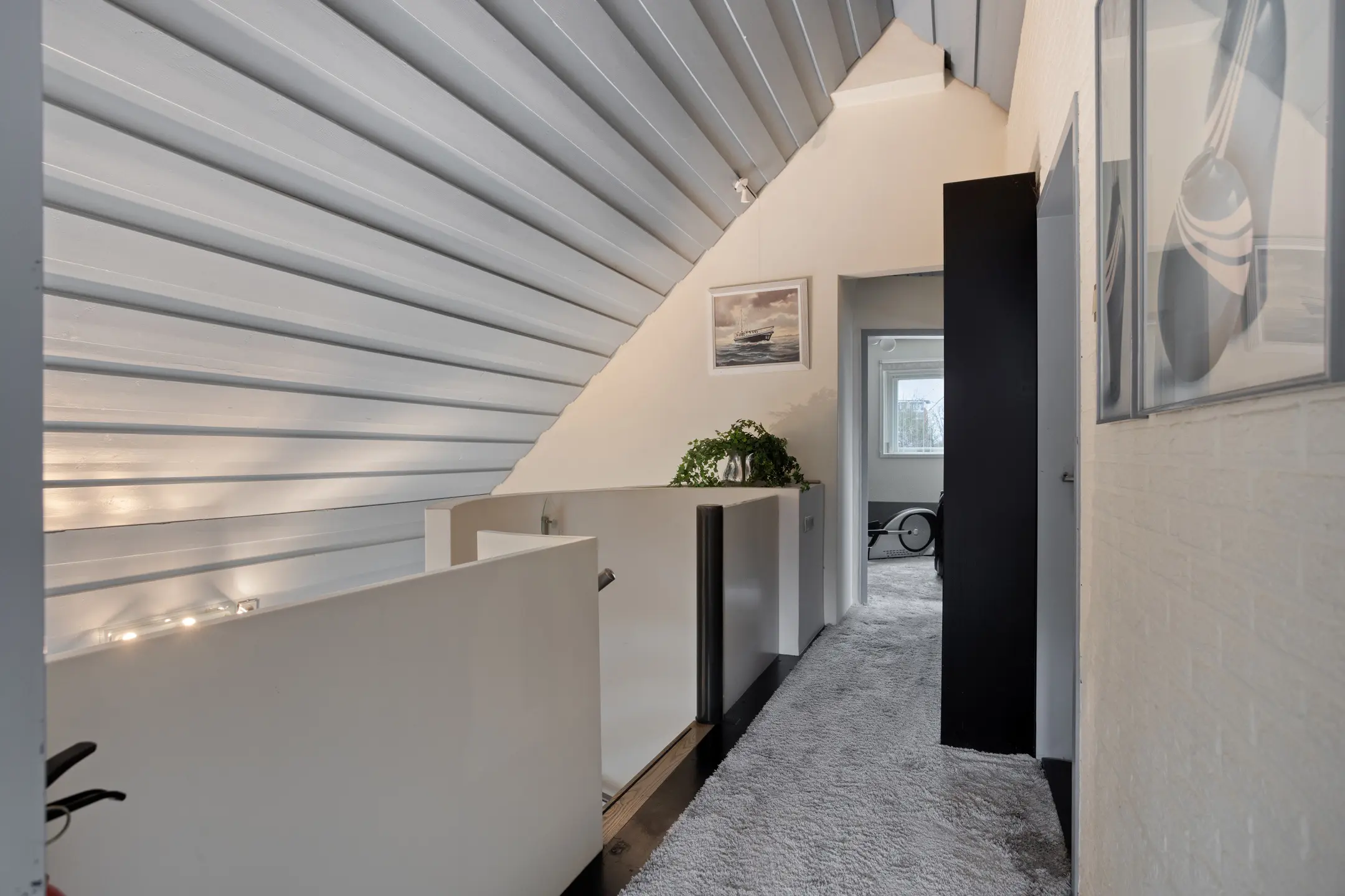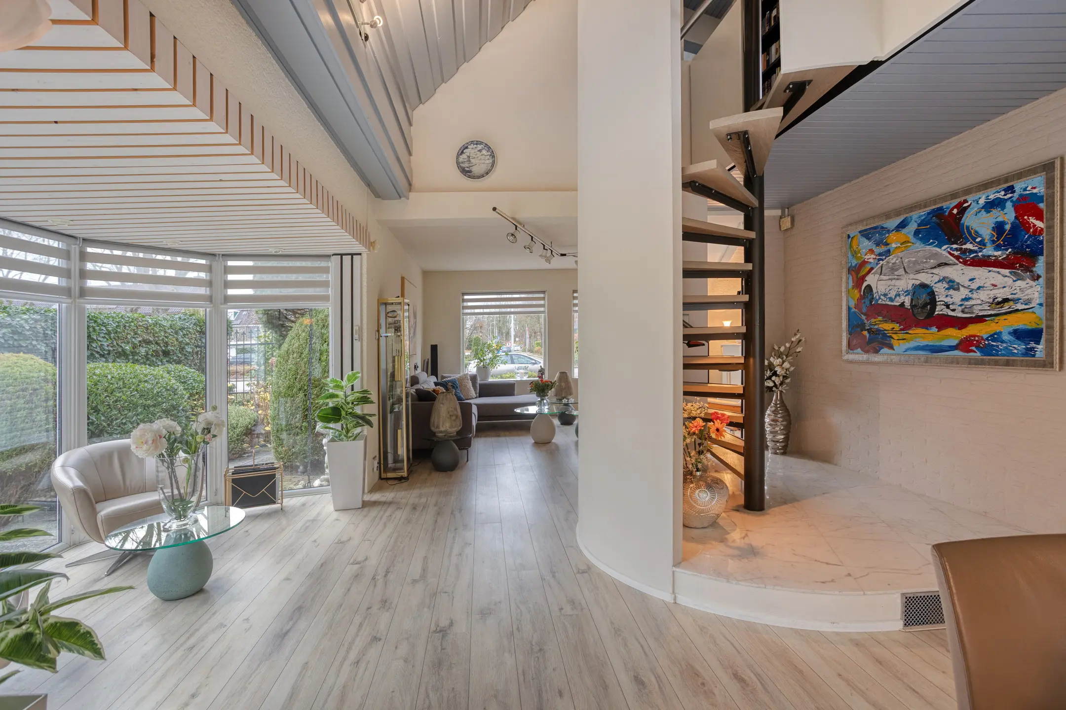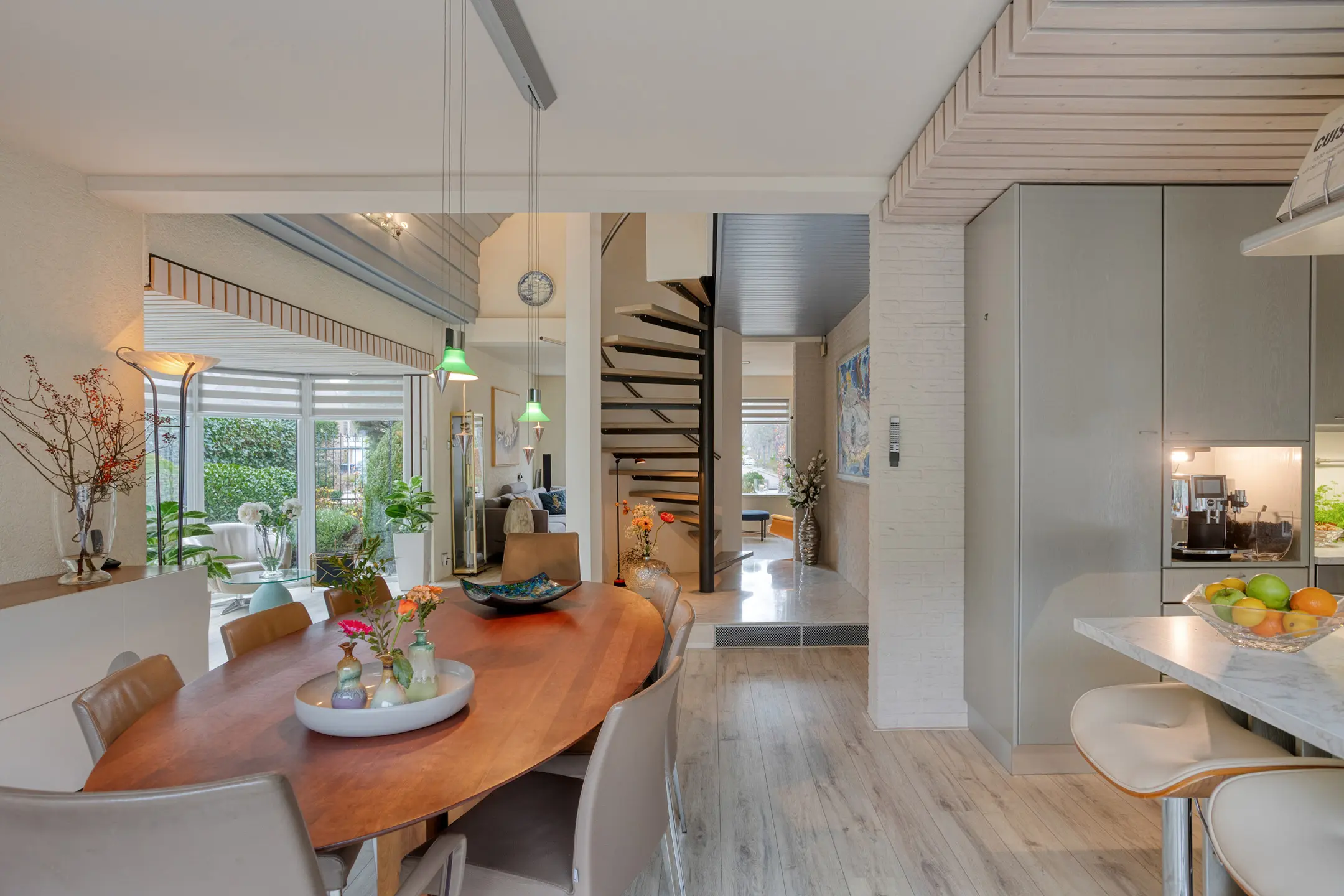 De ruimtes worden visueel verbonden door de moderne open zweeftrap.