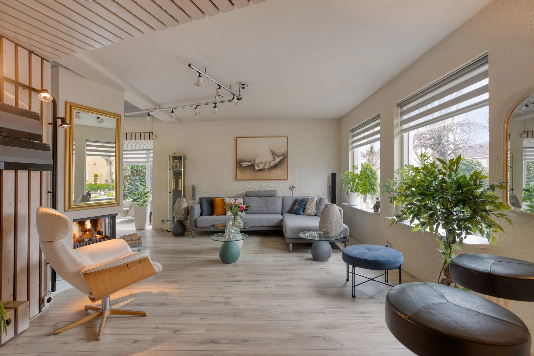 In de hal zet je letterlijk en figuurlijk de eerste stap naar de woonkamer. Dit is een sfeervol vertrek met open haard waar direct opvalt dat er is gedacht aan details zoals het verlaagde plafond. Aan de zijkant bevindt zich een hoogwaardige kunststof erker, onderhoudsarm en mooi vormgegeven.