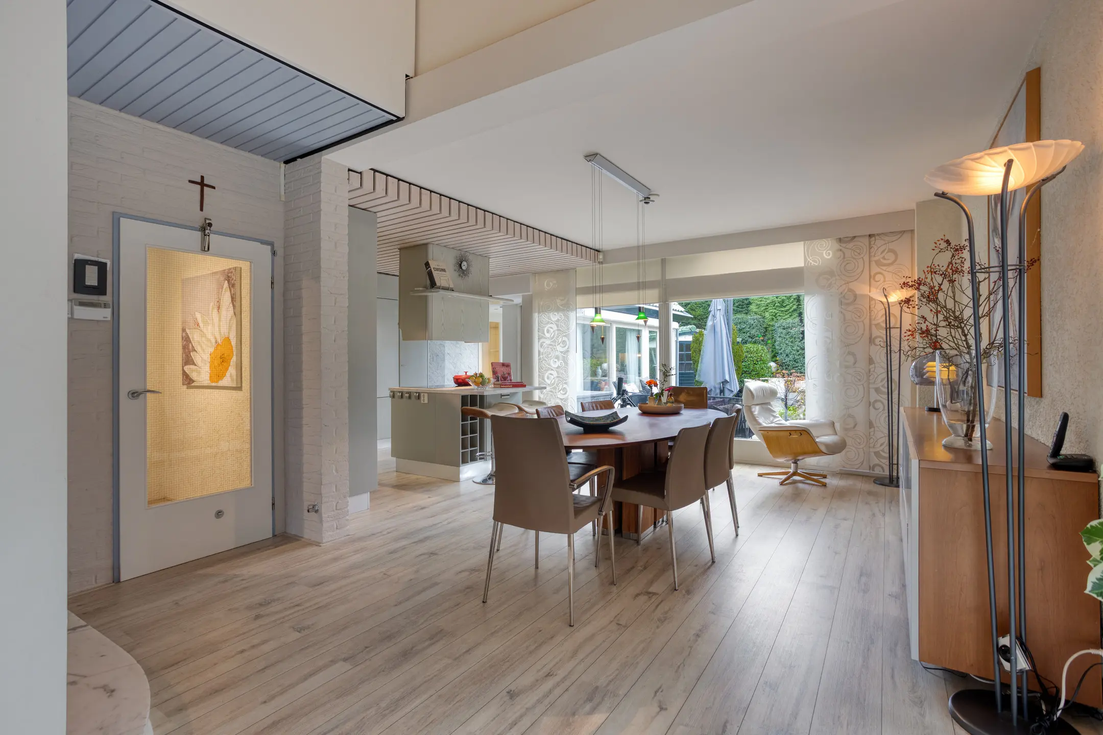 Aan de achterzijde van de woning vind je de ruime open keuken met kookeiland. De inbouwapparatuur waaronder een quooker is in 2022 vernieuwd. Vanuit het eetgedeelte, door de schuifpui, bereik je zo het terras, waar je heerlijk van het zonnetje kunt genieten. De tuin is namelijk op het zuiden gelegen.