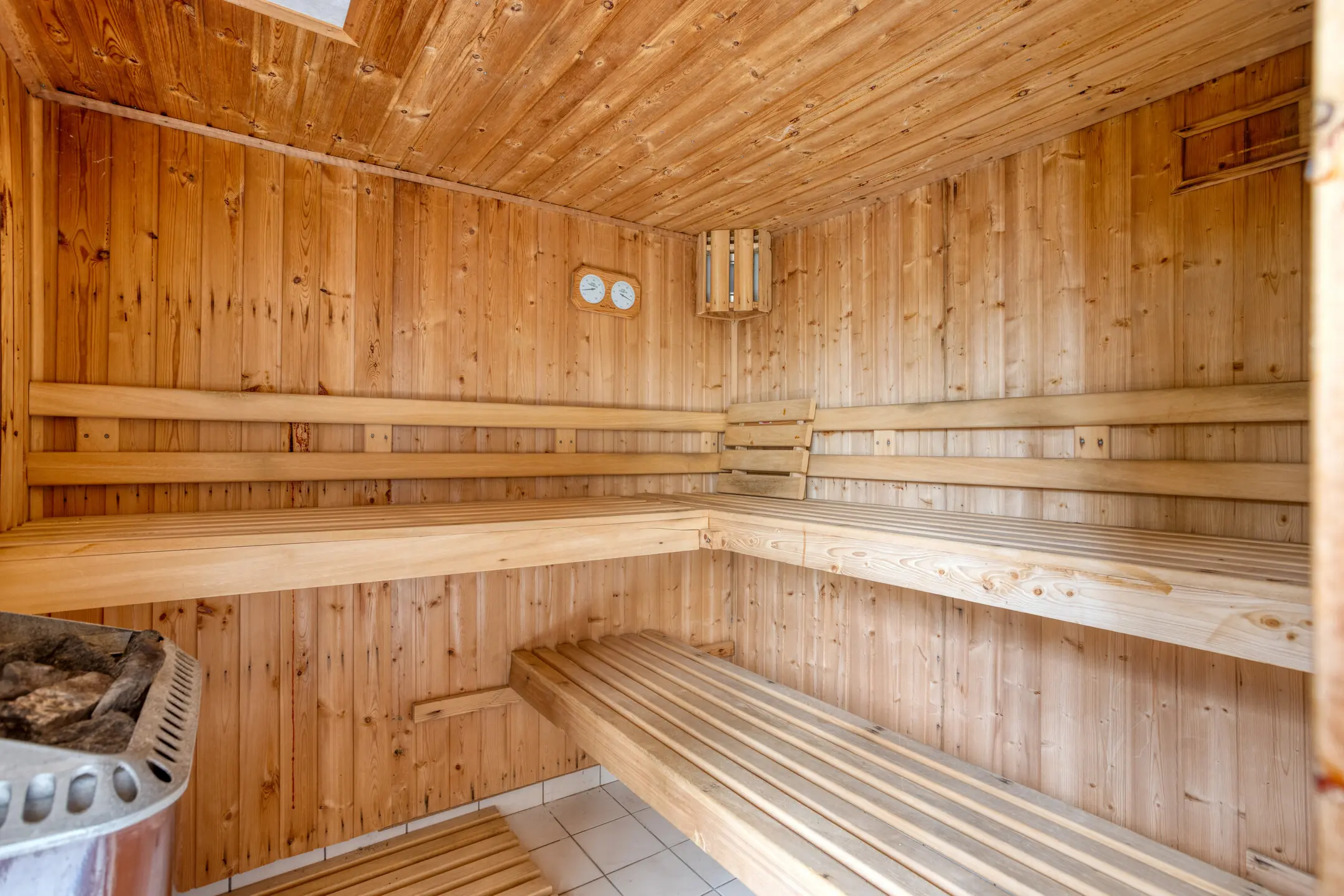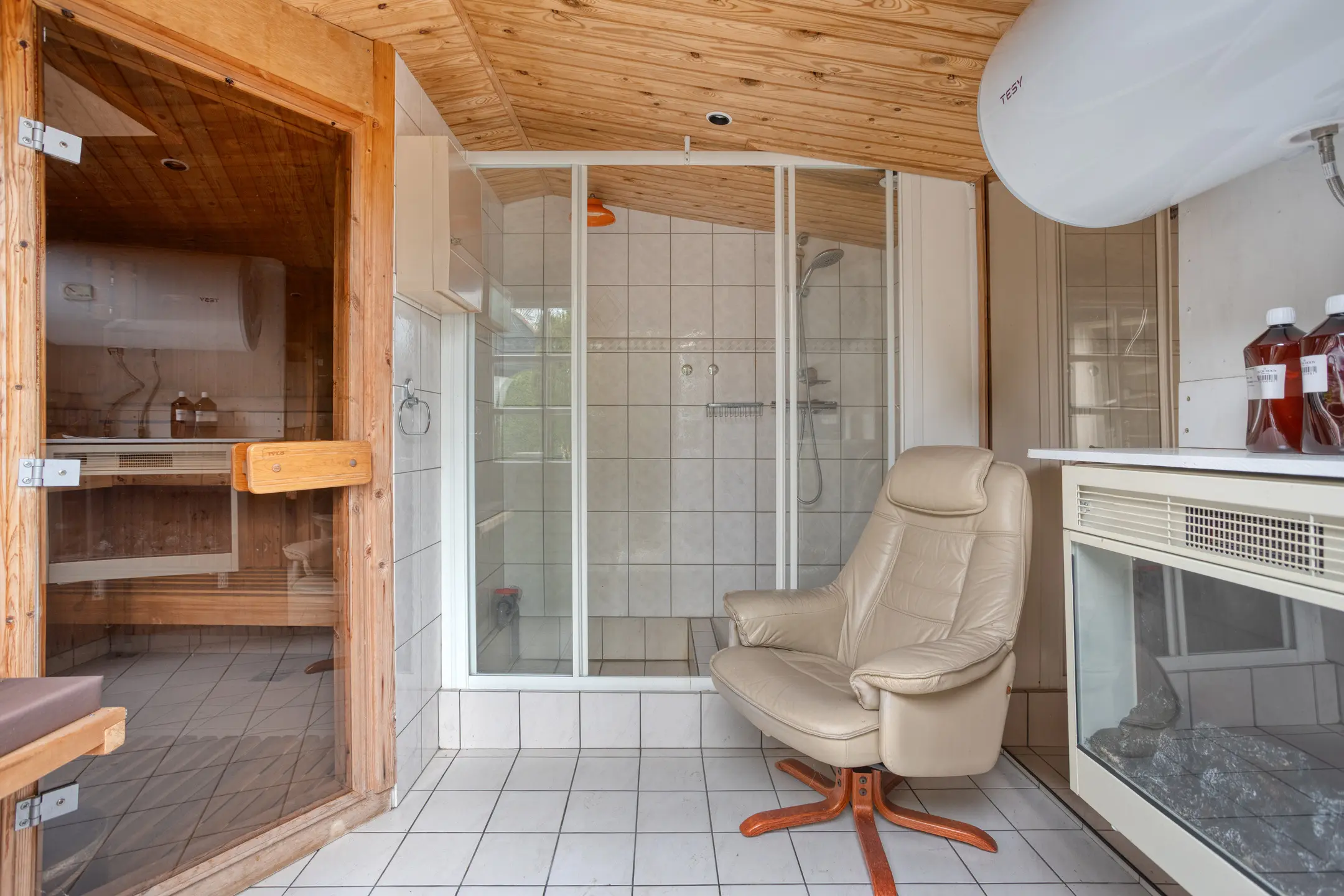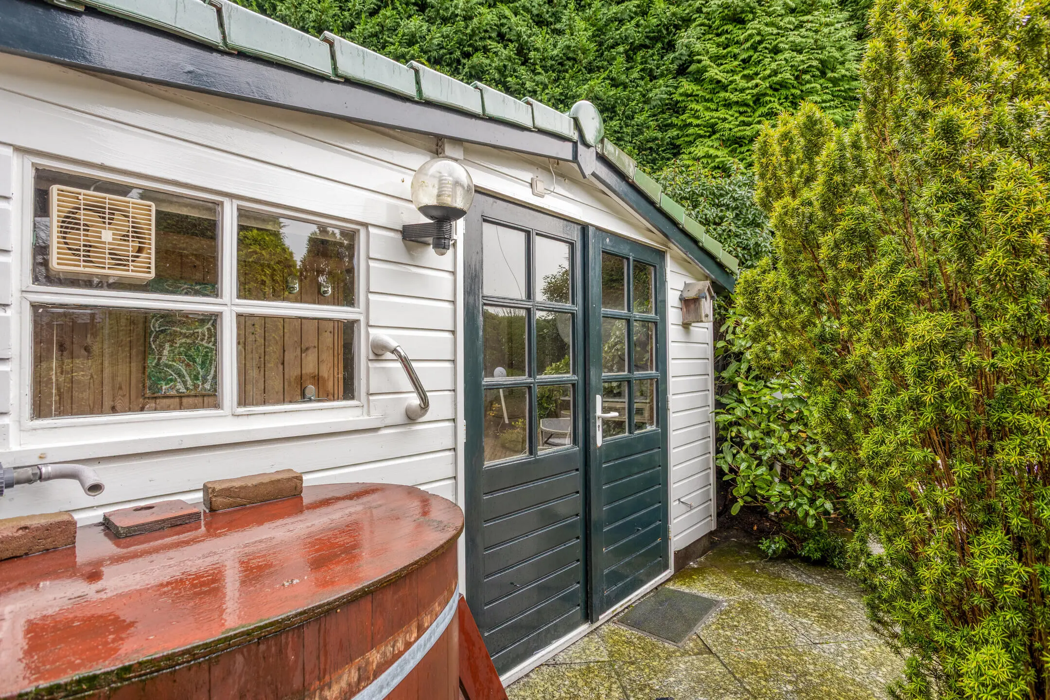 Achter de woning ligt nog een vrijstaande houten berging met sauna, relaxruimte en douche.