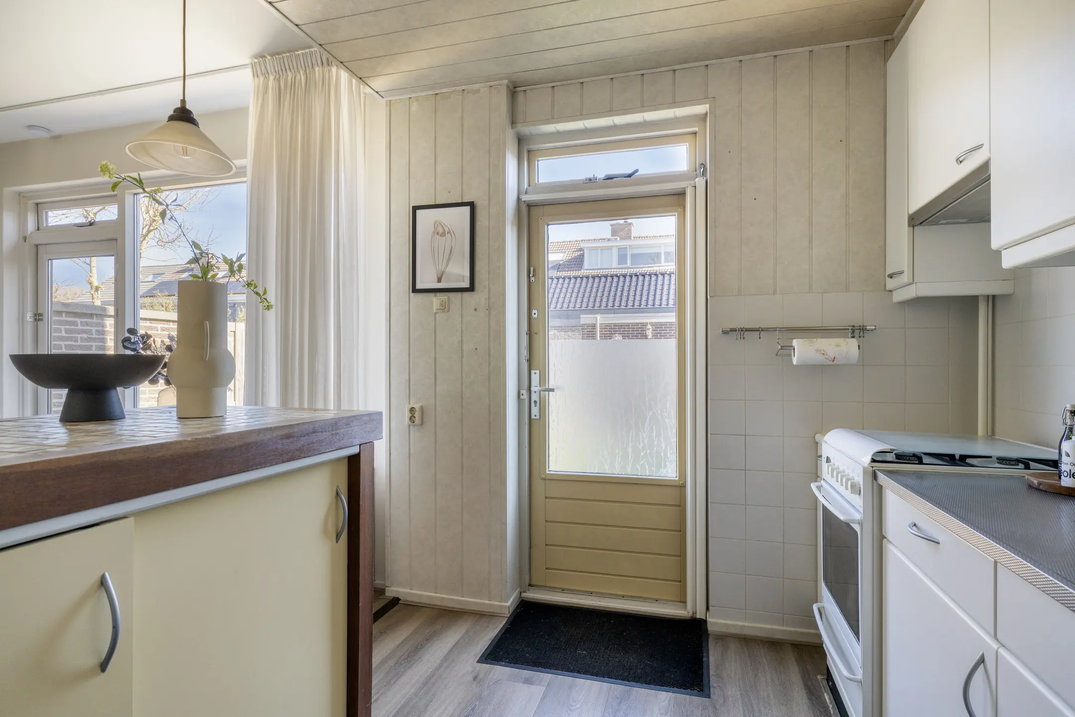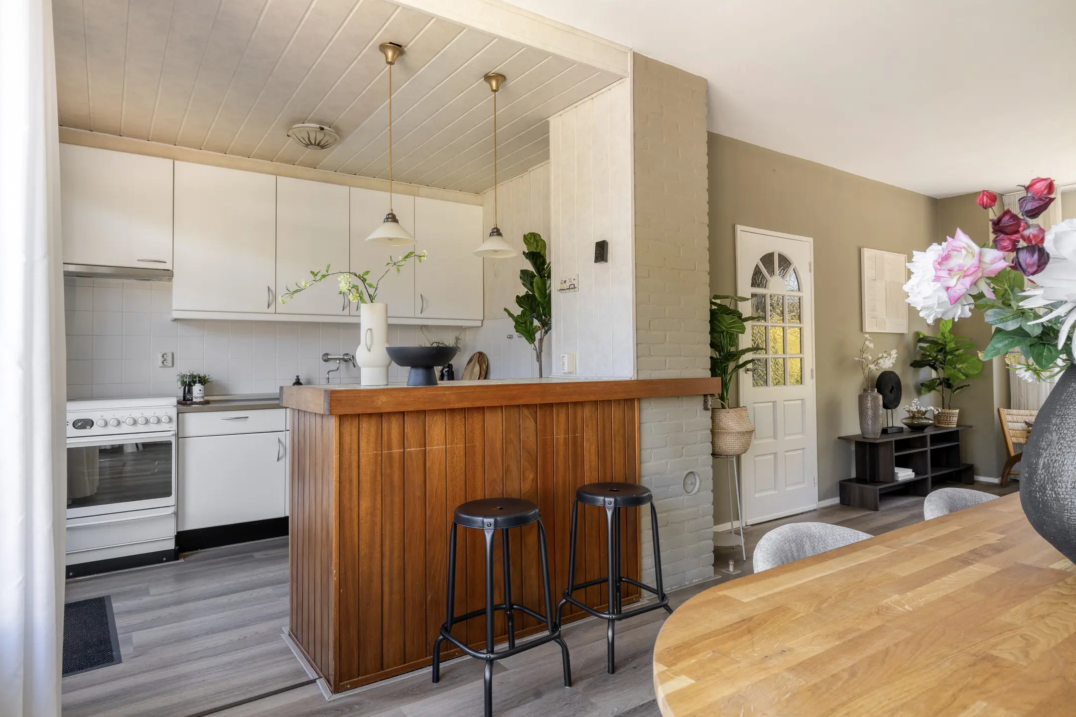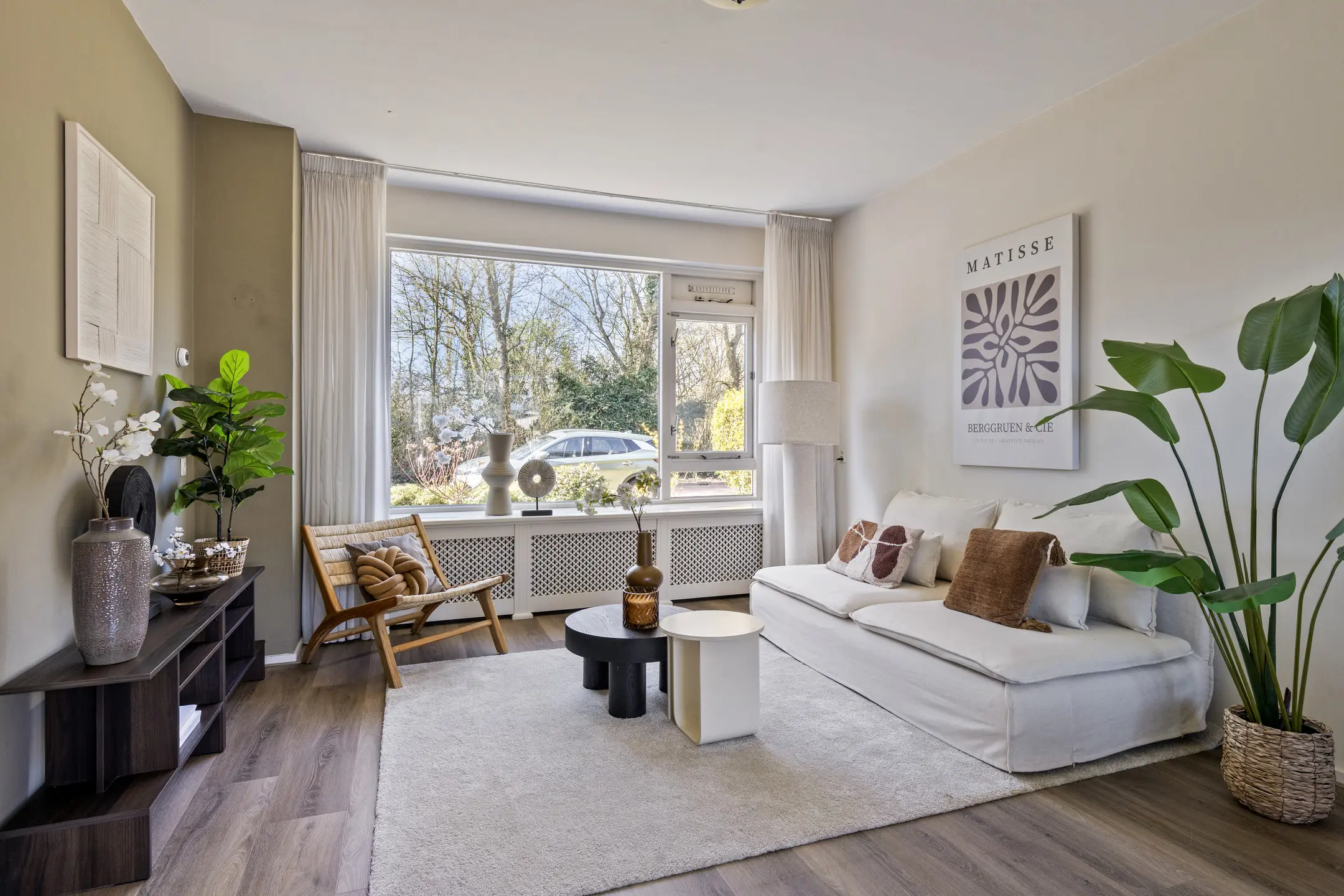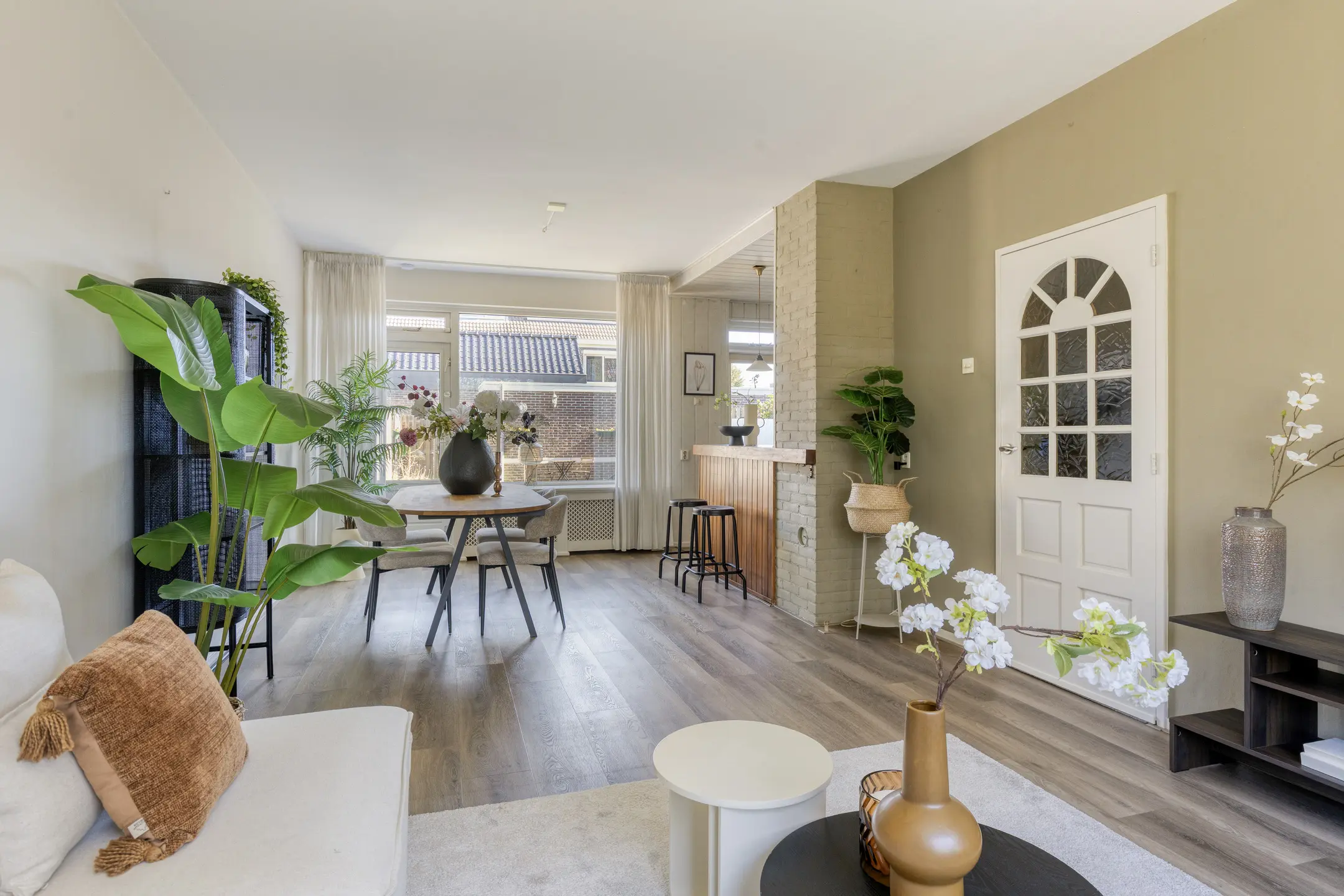 De woonkamer ademt ruimte en openheid, met grote raampartijen die het daglicht gul naar binnen trekken. De donkere vloer geeft de kamer nog een extra warme uitstraling. Met uitzicht op een groen plantsoen zit je hier heerlijk rustig. De open keuken sluit naadloos aan op de leefruimte. Denk aan lange avonden tafelen, samen, koken, leven, lachen. Het is een plek waar herinneringen ontstaan zonder dat je het doorhebt.