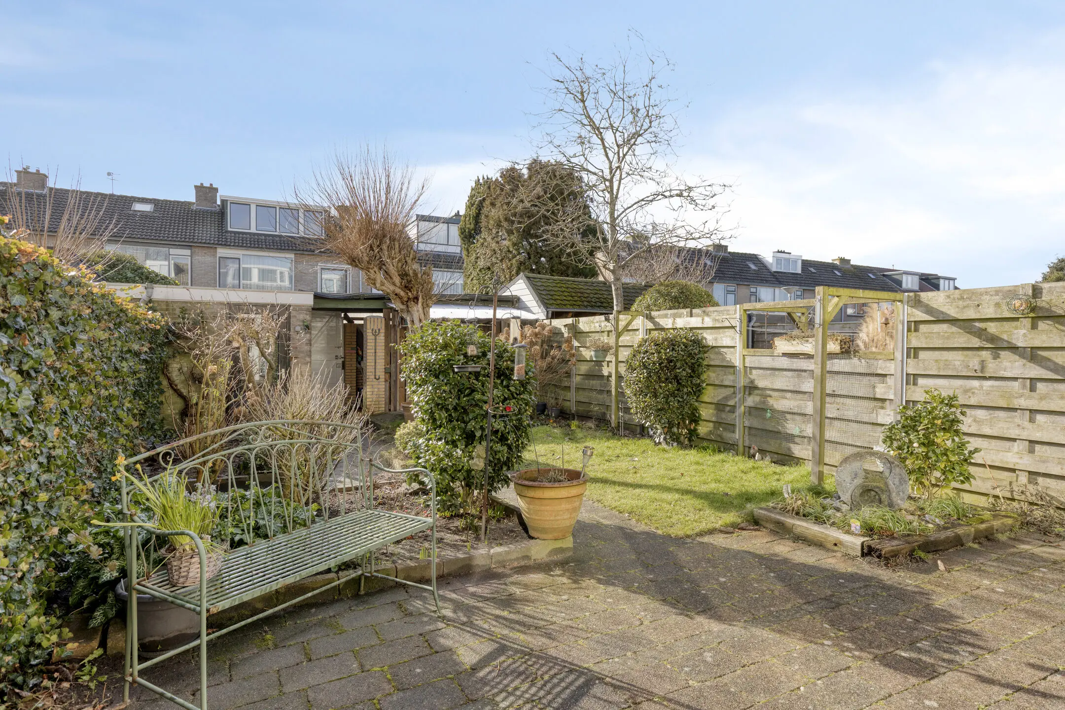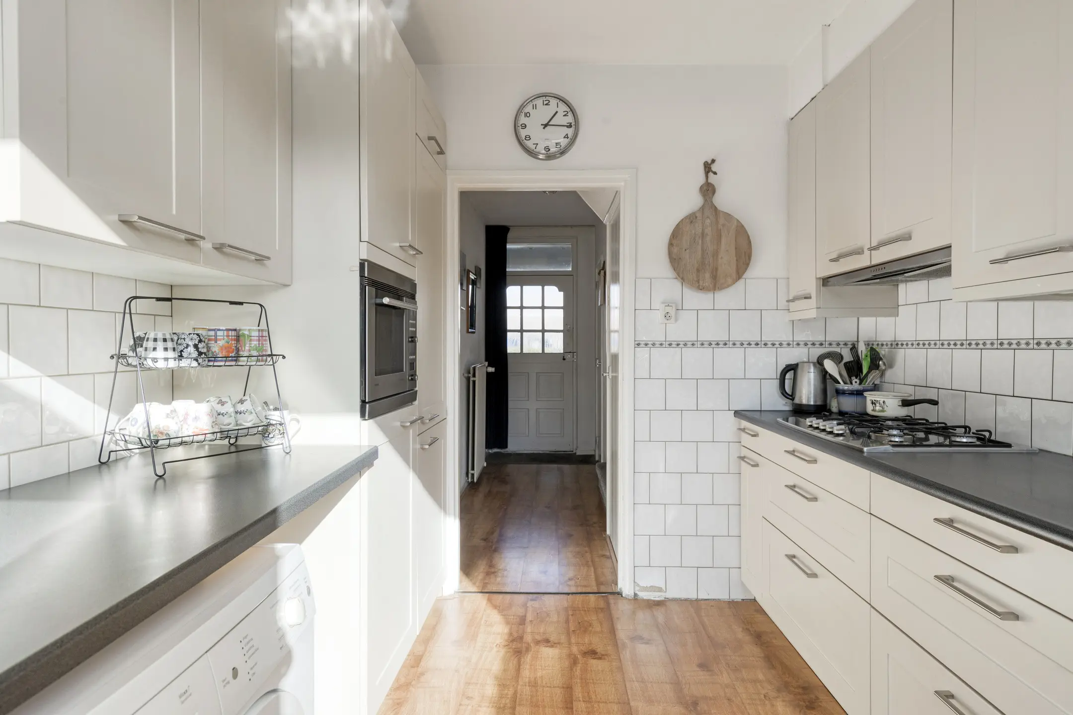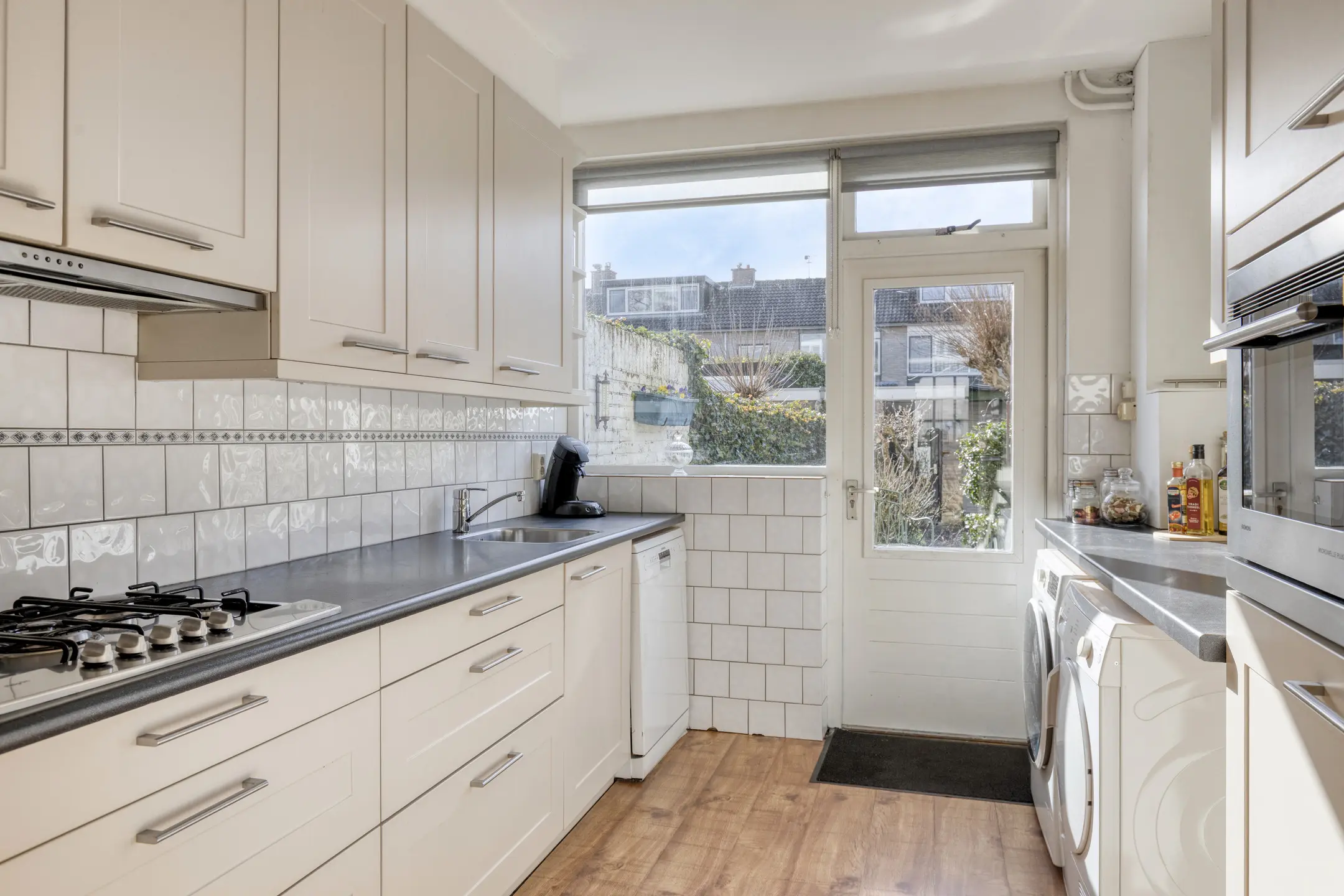De gesloten keuken is vrij compleet uitgevoerd en voorzien van een 5-pits gasfornuis, combimagnetron, koel-/vriescombinatie en een losse vaatwasser. Daarnaast is er een aansluiting voor zowel een wasmachine als een droger. Vanuit de keuken heb je direct toegang tot de zonnige achtertuin. De tuin is circa 15 meter diep, gunstig gelegen op het zuiden en beschikt over een berging en een praktische achterom.