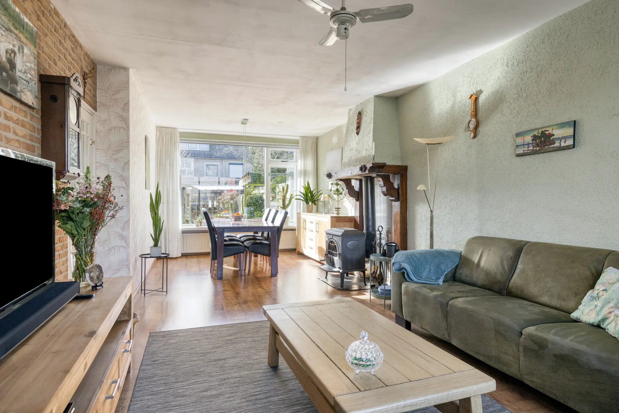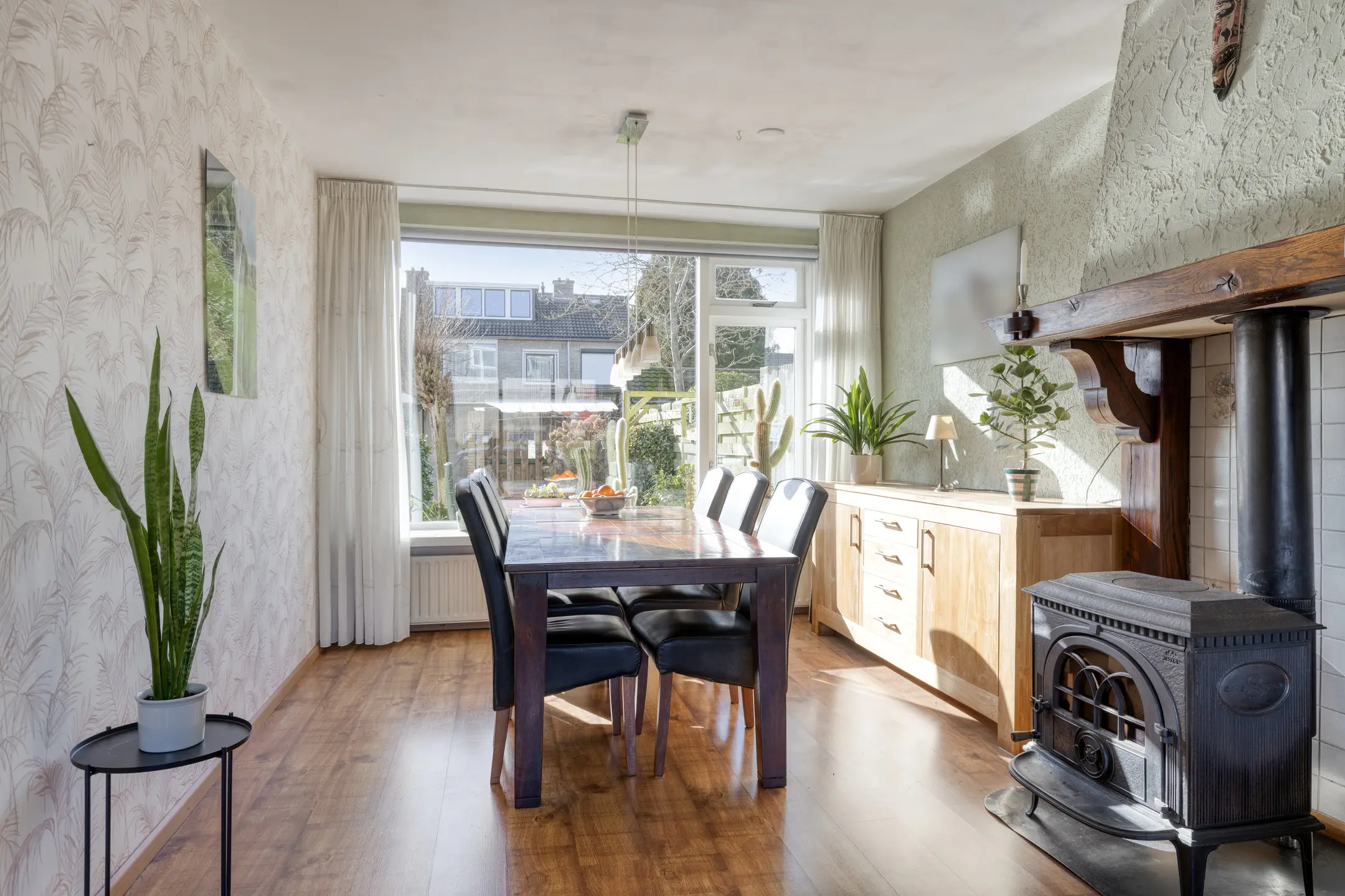 Via de hal met garderoberuimte betreed je de sfeervolle woonkamer. De erker aan de voorzijde zorgt voor extra leefruimte, een prachtige lichtinval en een warme uitstraling. Centraal in de woonkamer staat de houtkachel, die tijdens de koude maanden voor extra comfort zorgt en klaar is voor gebruik door de nieuwe bewoners.