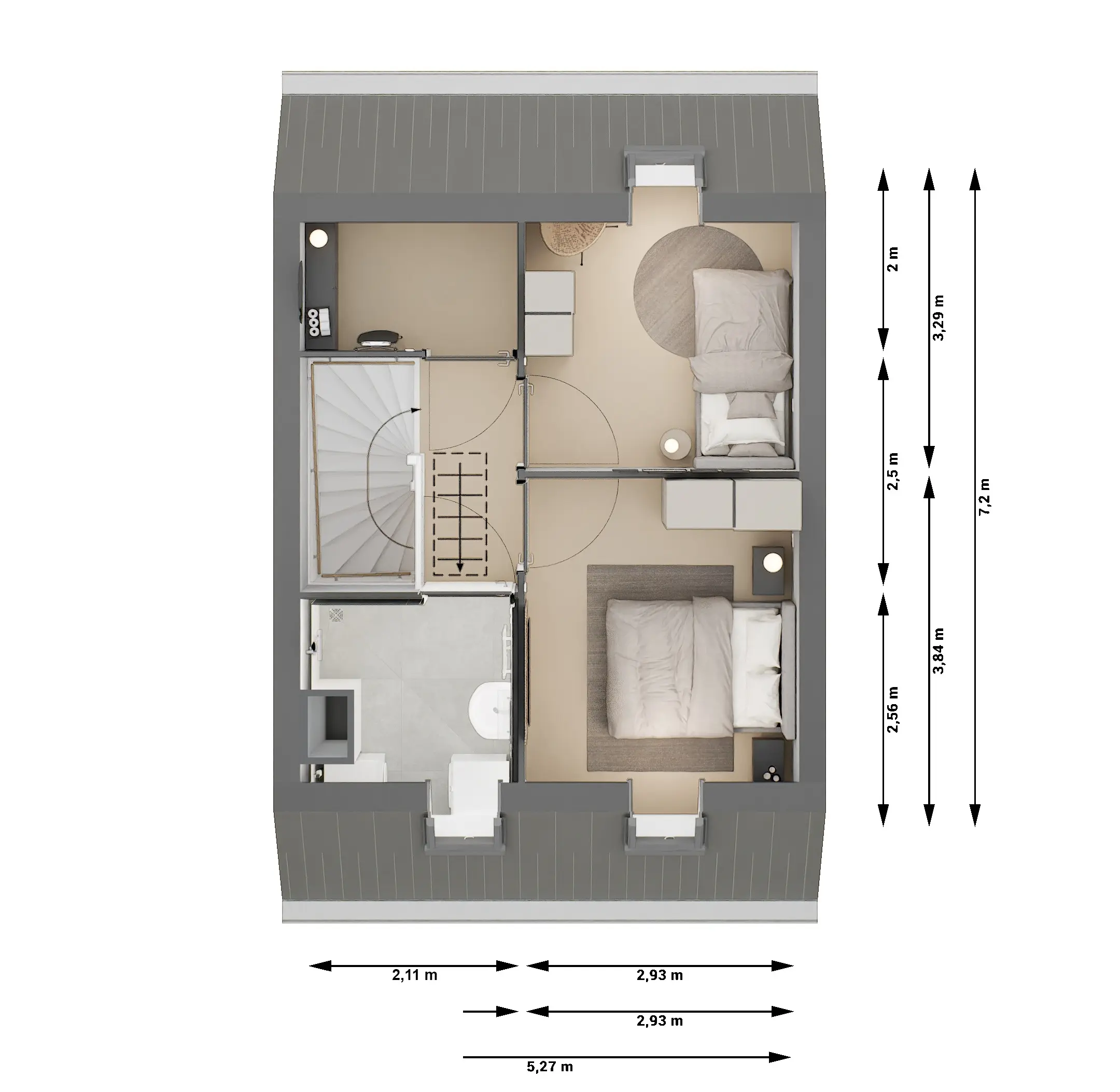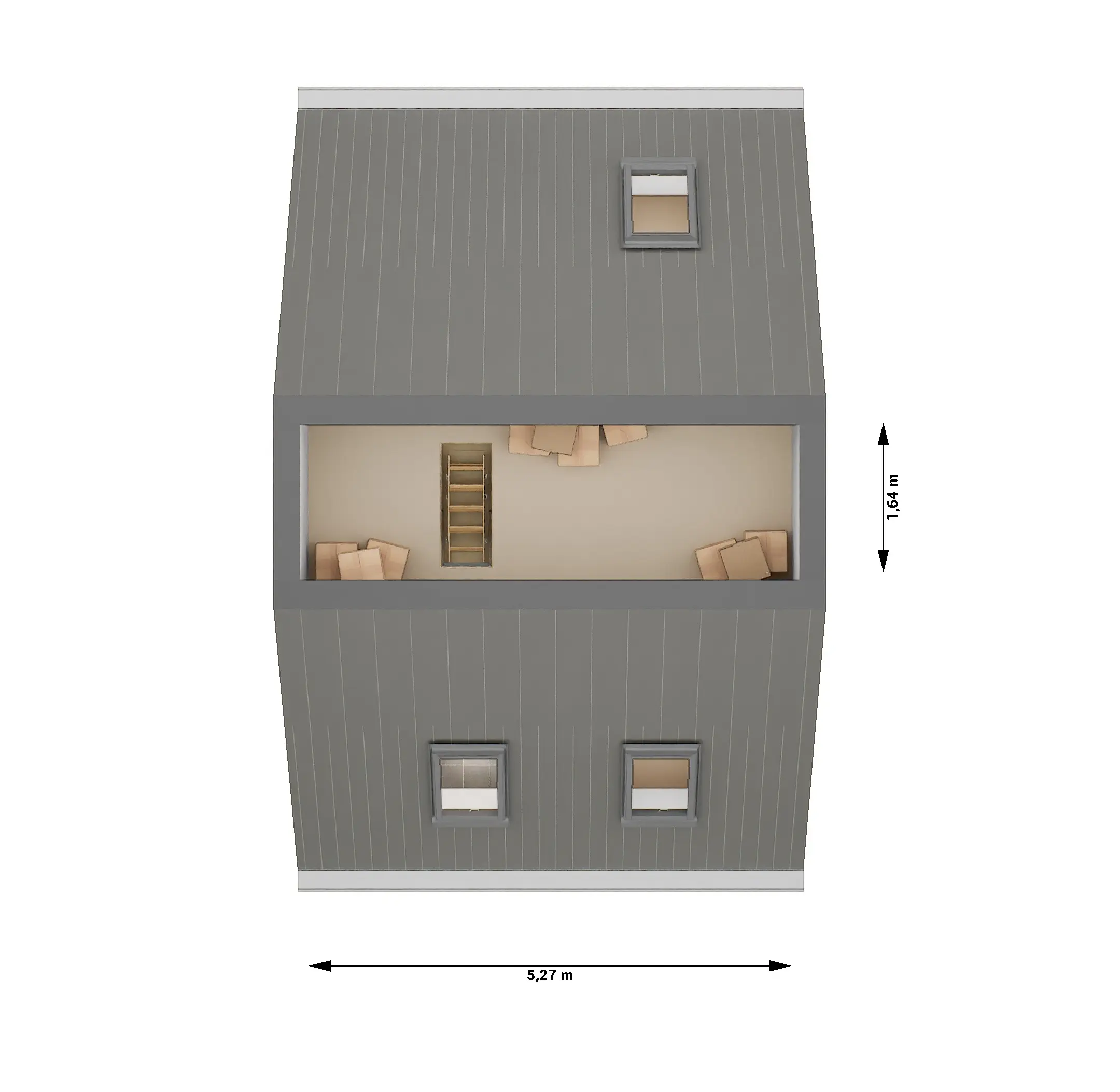 Op de begane grond bevindt zich de leefruimte met open keuken. De eerste verdieping biedt plaats aan twee slaapkamers en de badkamer. De vliering is geschikt als bergruimte.