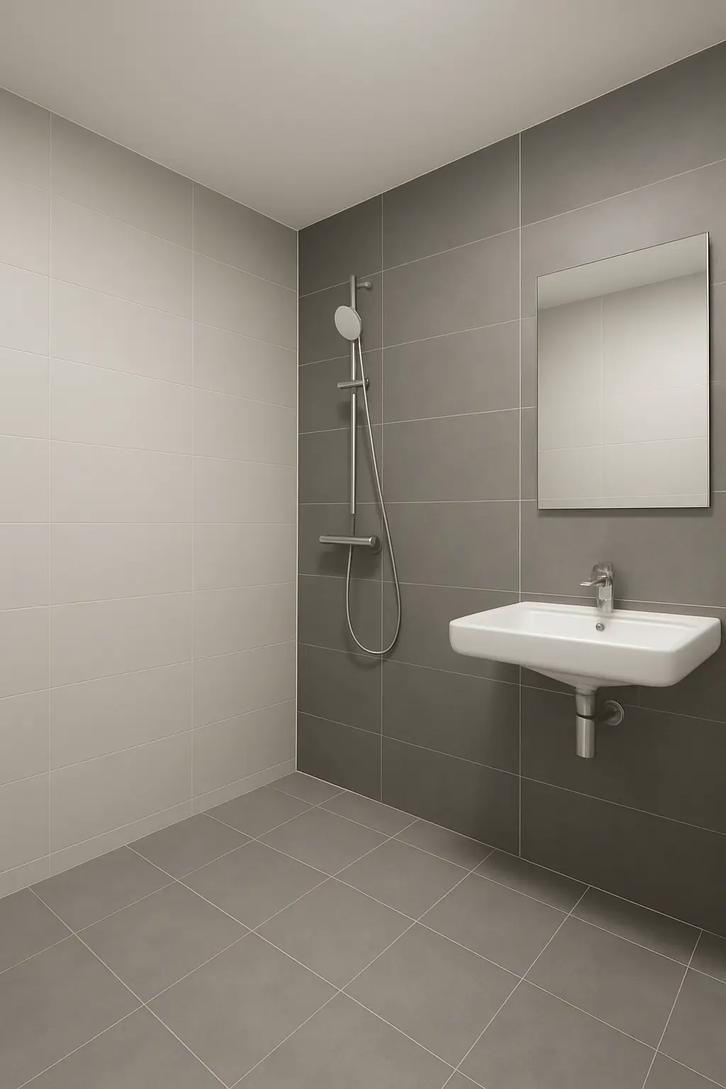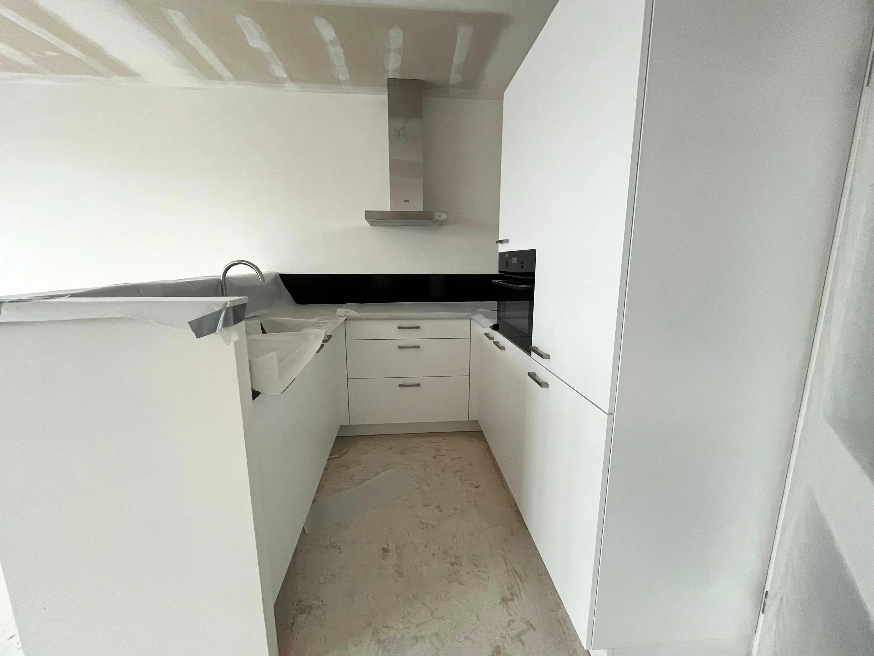 The apartment features one spacious bedroom and a modern bathroom with walk-in shower and washbasin. The hallway includes a separate space for a washing machine and dryer. The apartment is delivered in shell condition with paint-ready walls, giving you full freedom to finish it according to your wishes.