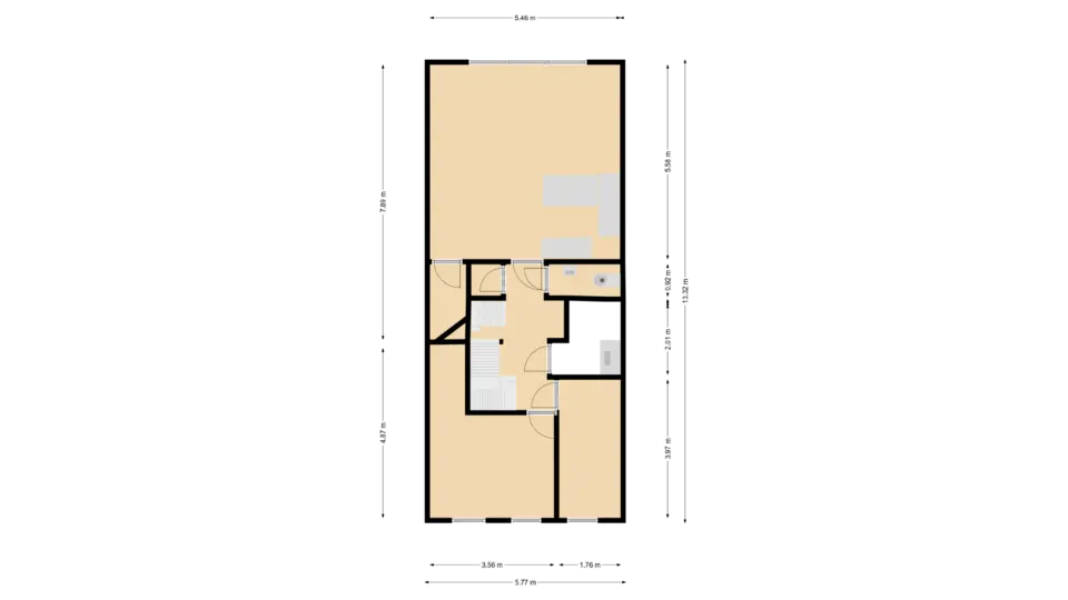 Via de centrale hal bereik je dit appartement op de eerste verdieping. De lichte en ruime living vormt samen met de open keuken het hart van de woning. De keukenruimte is naar eigen smaak in te richten, ideaal voor wie zijn eigen stijl wil doorvoeren. Aan de andere zijde van het appartement vind je twee goed bemeten slaapkamers, perfect voor slapen, werken of logees.