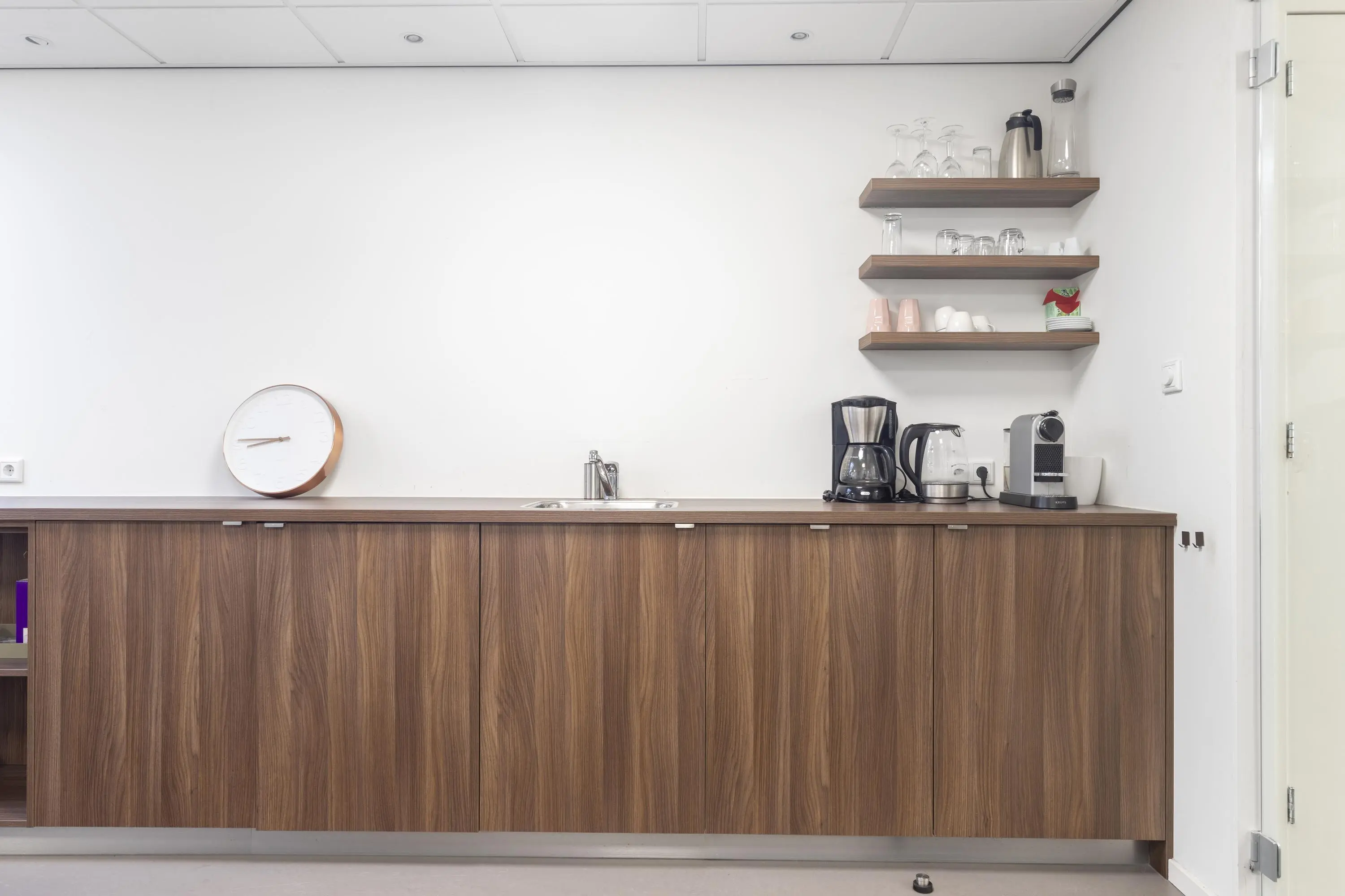 Deze beschikt ook over een maatwerk wandmeubel: niet alleen geeft deze veel bergruimte, ook de pantry is hierin weggewerkt.
