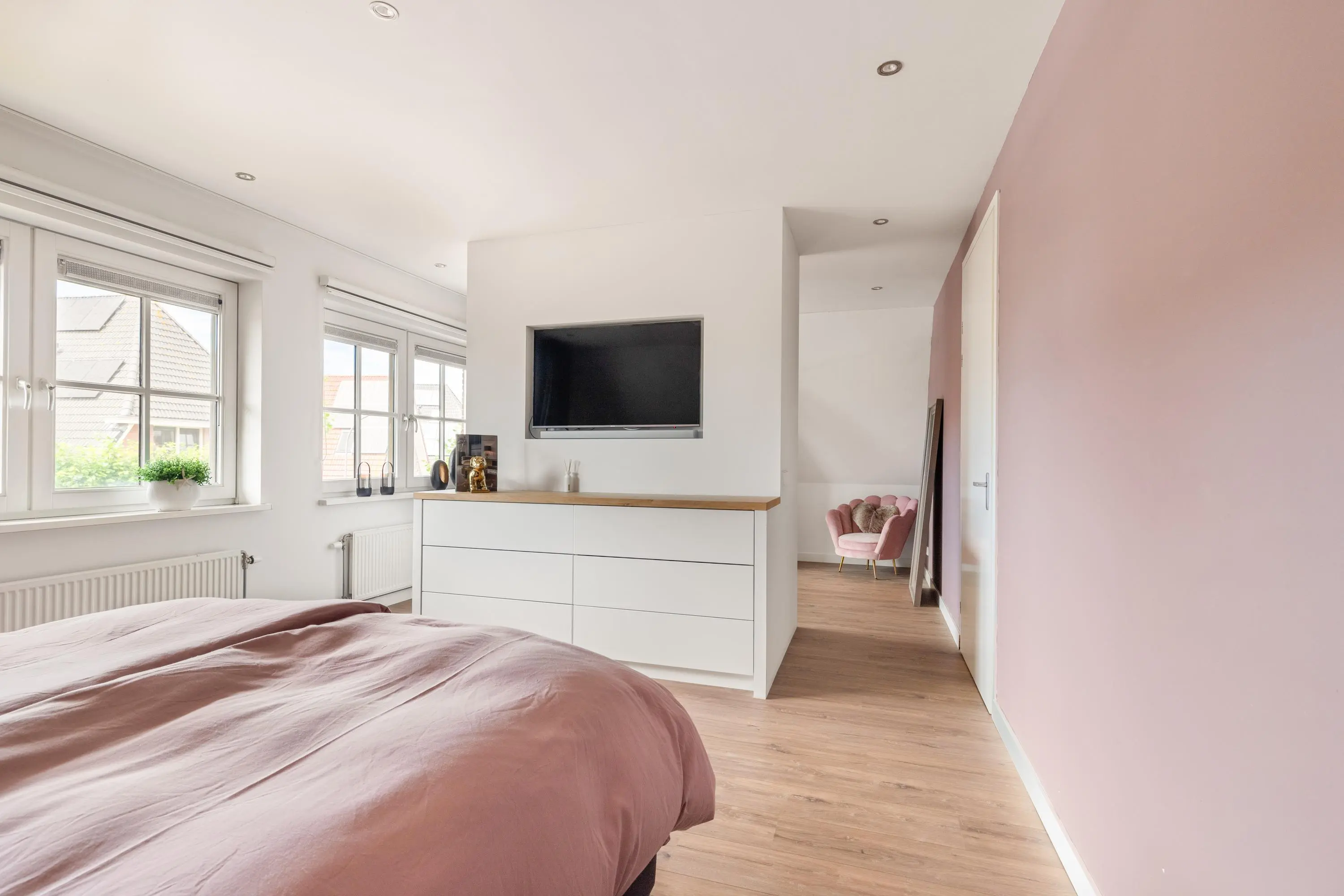 Op de eerste verdieping bevindt zich aan de voorzijde de royale master bedroom met ingebouwde kast, die de kamer op een stijlvolle manier verdeelt in een slaapgedeelte en kleedruimte. Dankzij de raampartij over de volle breedte voelt de kamer ruim en licht aan. Verder biedt de overloop toegang tot drie keurige slaapkamers, waarvan twee met prachtig uitzicht op de tuin en het water. De nette badkamer is uitgerust met een ligbad, inloopdouche, dubbele wastafel en toilet.