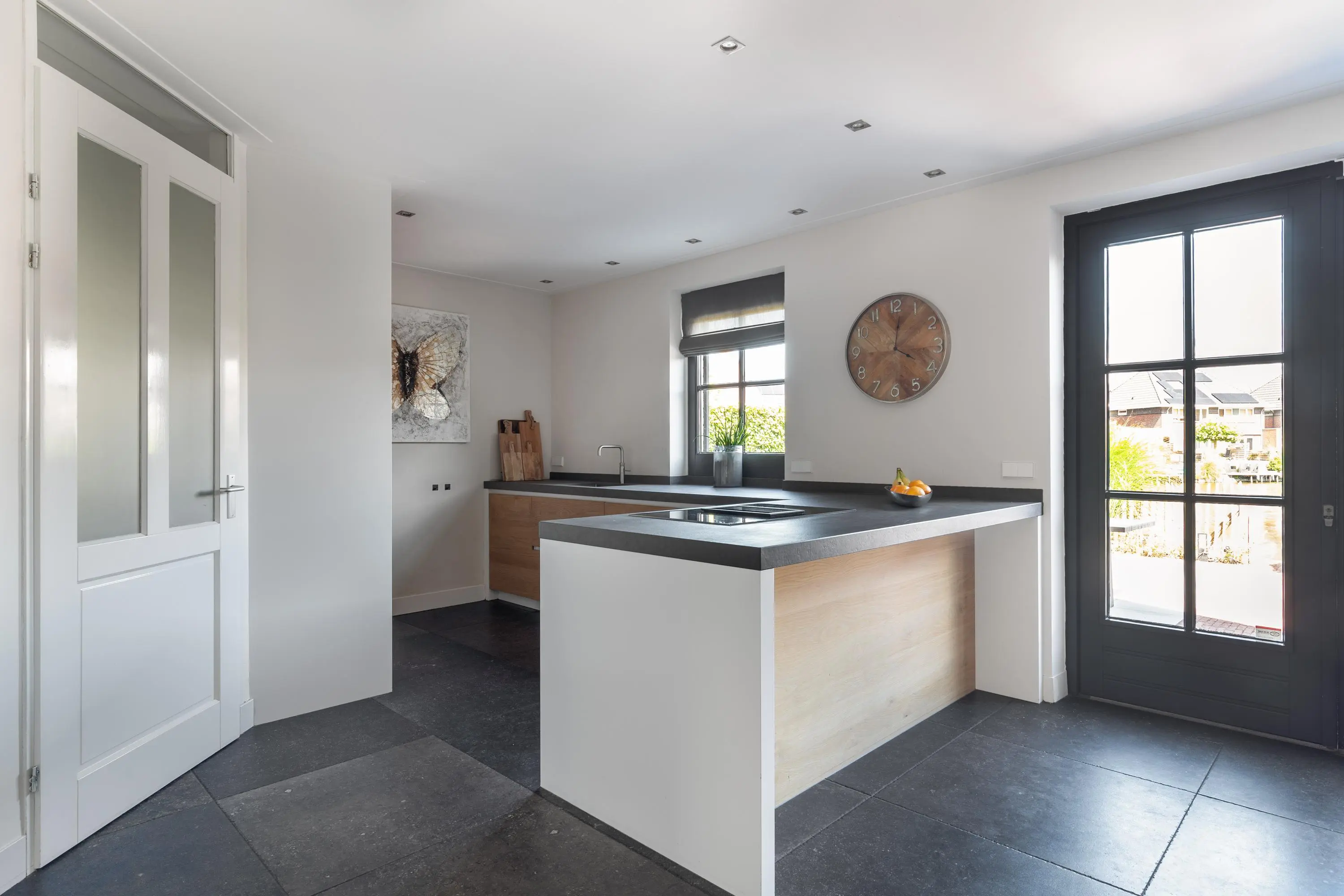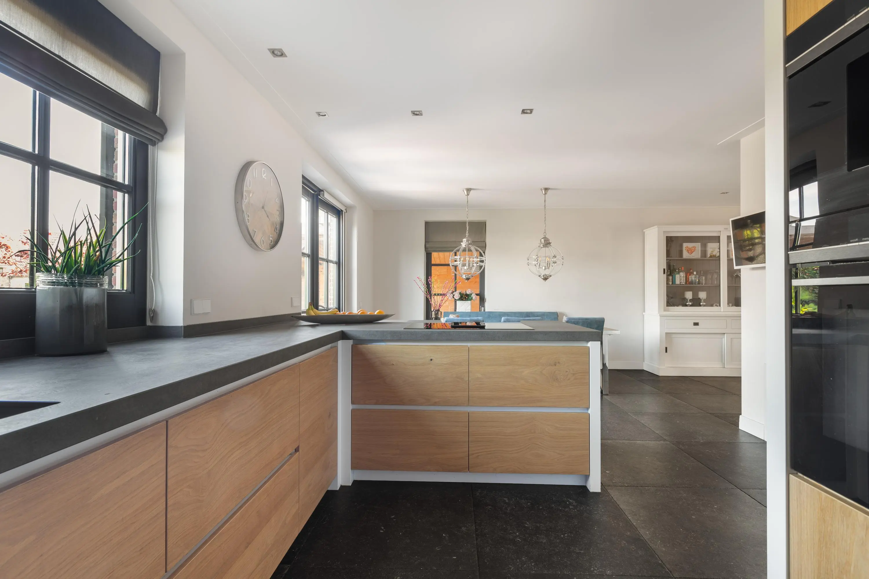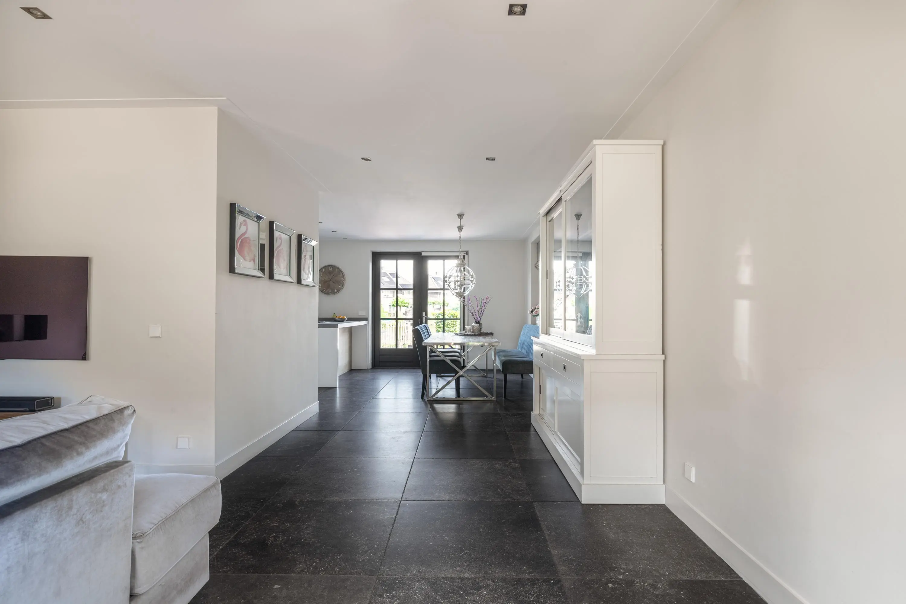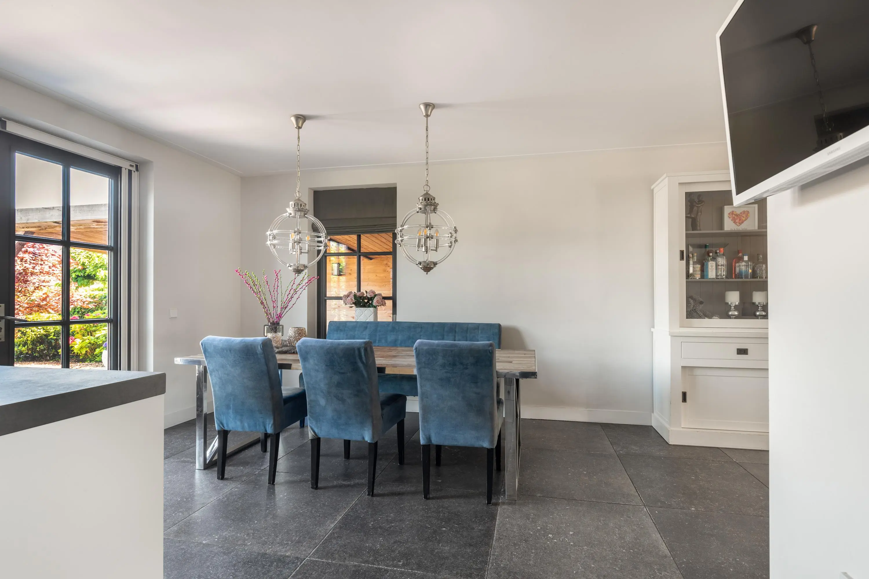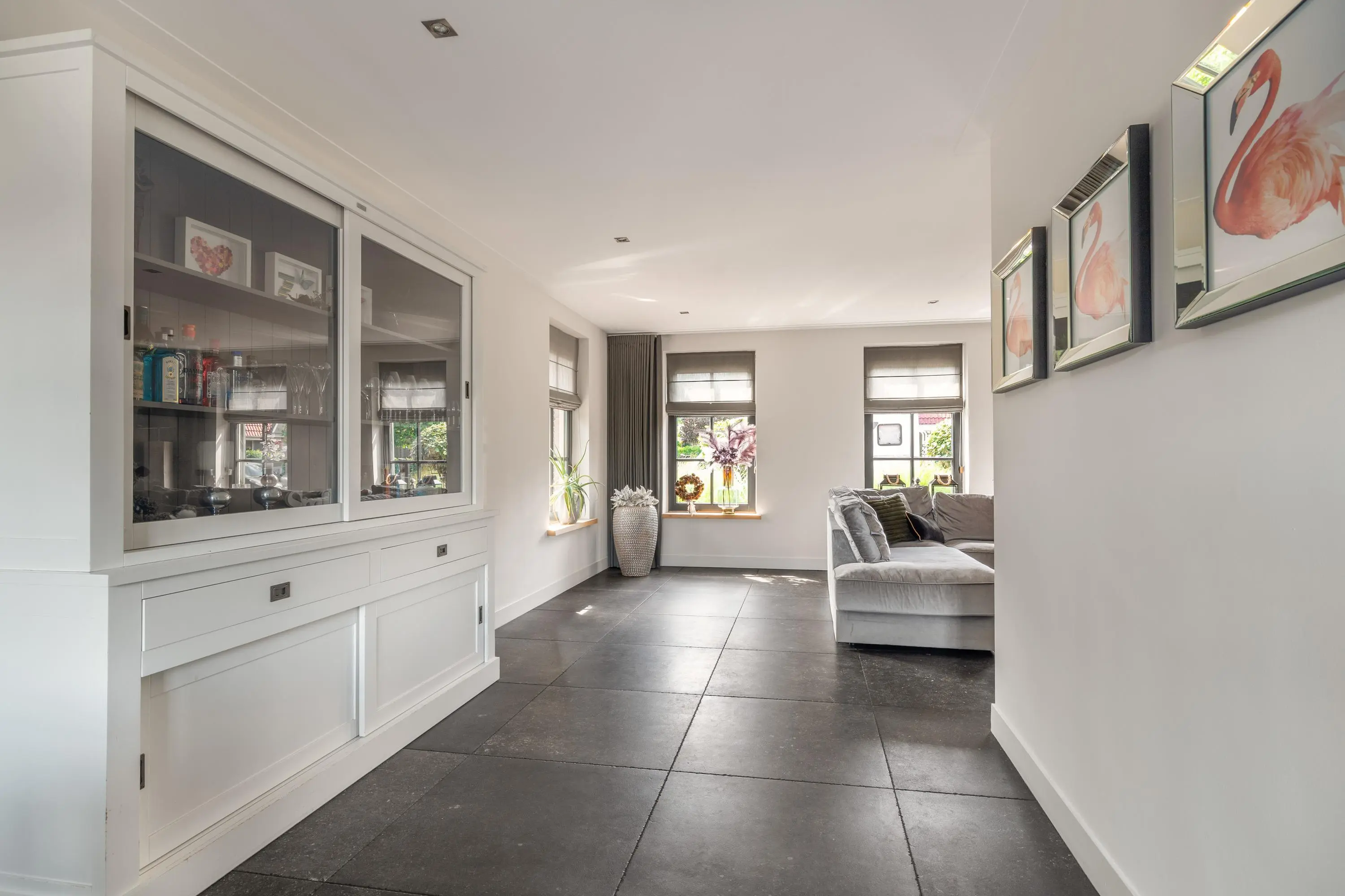 Bij binnenkomst stap je in een nette hal met toegang tot het toilet, het kantoor en de garage. Vanuit de hal loop je door naar de moderne open keuken, voorzien van luxe inbouwapparatuur en een Quooker. De keuken biedt uitzicht op de tuin en loopt naadloos over in de eetkamer met openslaande deuren naar buiten, perfect om het binnen- en buitenleven te combineren. De woonkamer ligt aan de voorzijde van de woning en geniet veel natuurlijk licht dankzij de vele raampartijen. De gehele begane grond is voorzien van vloerverwarming, wat zorgt voor optimaal comfort.