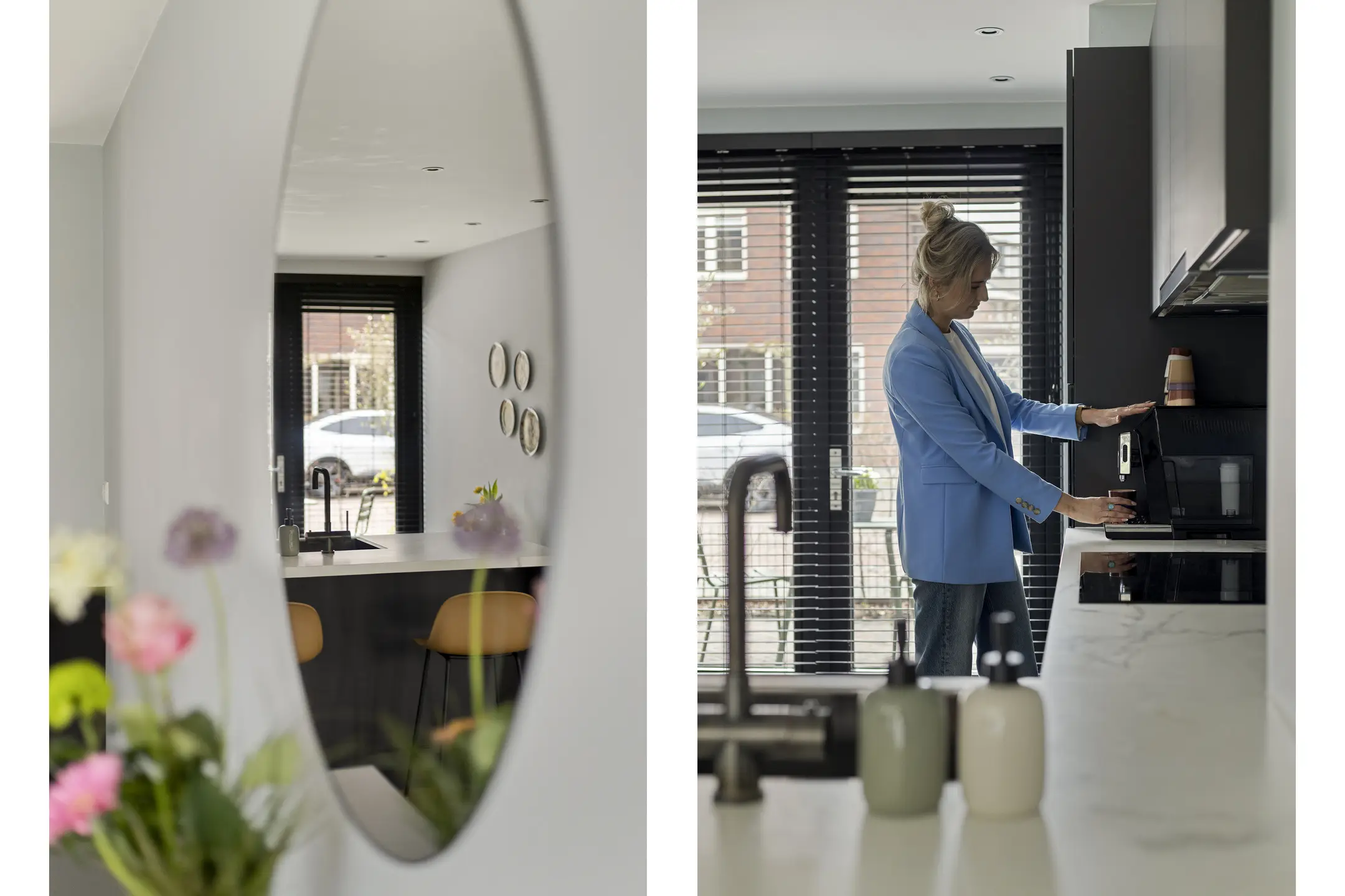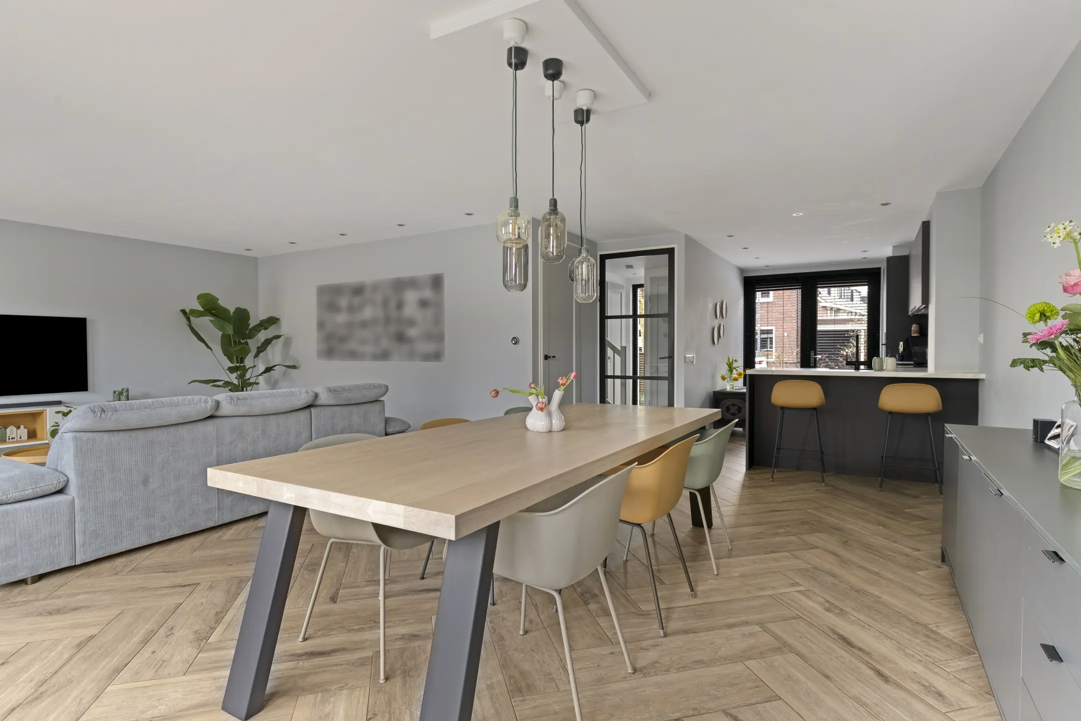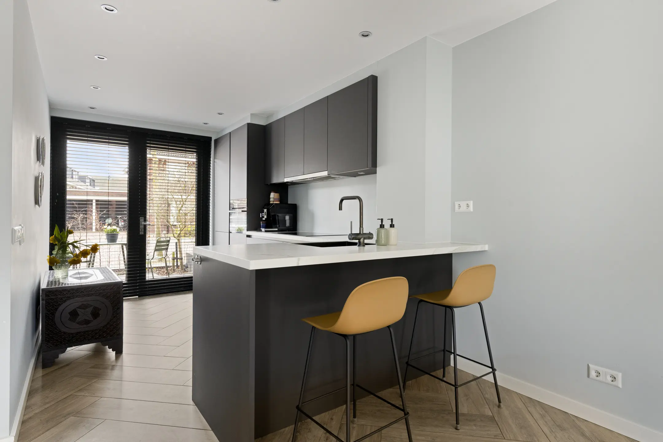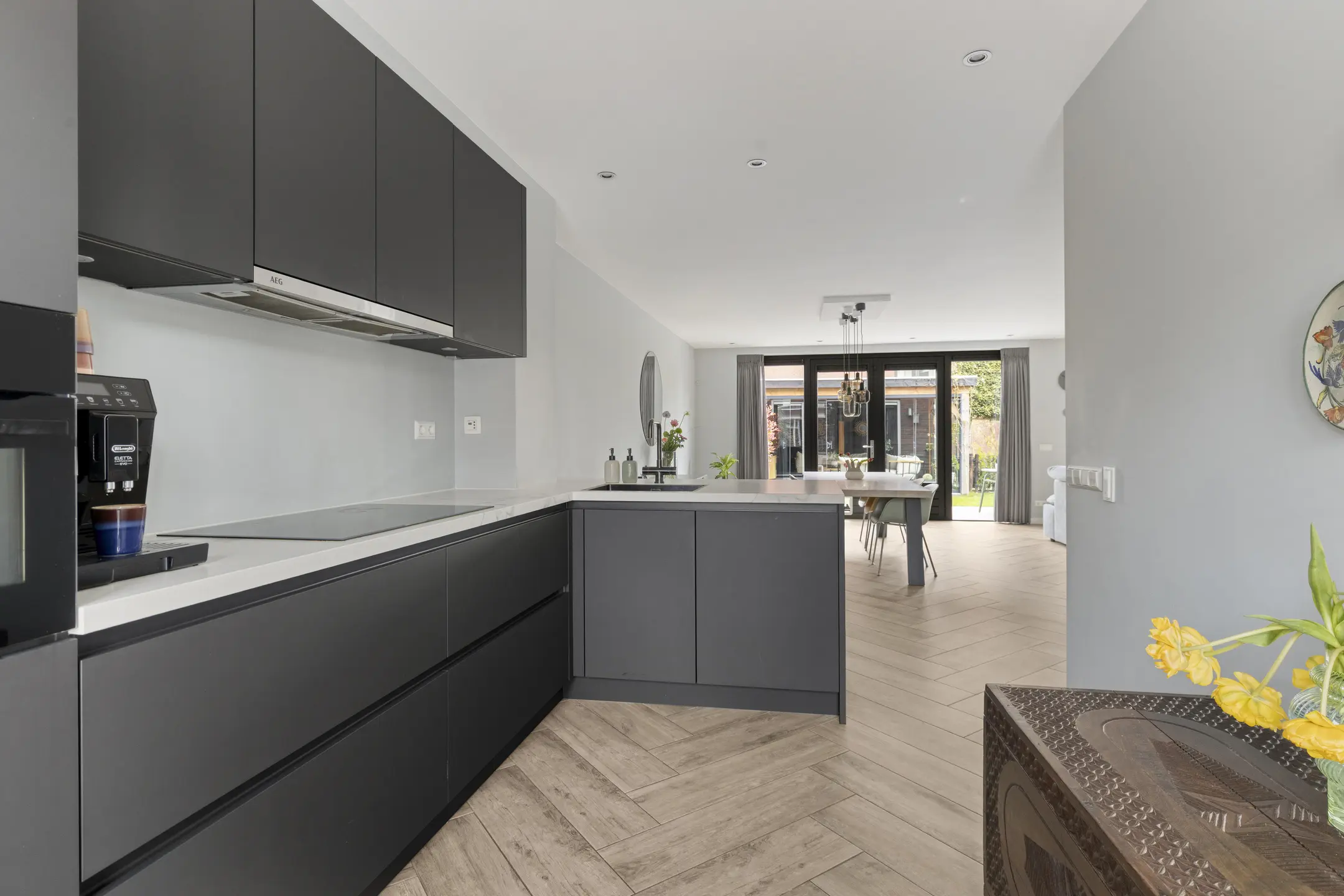 Bij binnenkomst tref je de hal met toegang tot het toilet, de trapopgang en de royale woonkamer. Aan de voorzijde bevindt zich de moderne keuken, voorzien van openslaande deuren naar de voortuin. De keuken is compleet uitgerust met een inductiekookplaat, afzuigkap, combi-oven, koelkast, vriezer, vaatwasser en een Quooker. De gezellige bar maakt het geheel perfect voor een ontbijt of een drankje. Dankzij de uitbouw aan de achterzijde geniet je in de woonkamer van extra ruimte en een prachtige lichtinval.