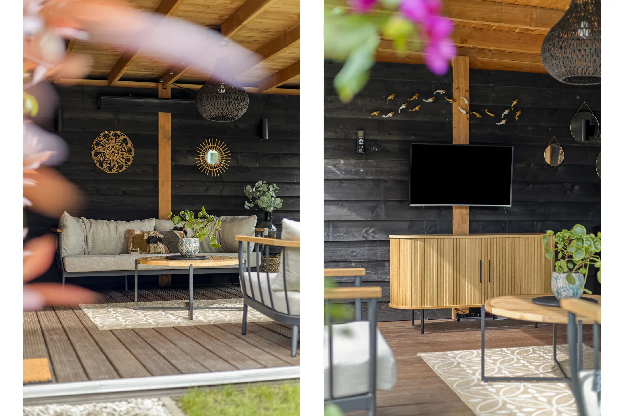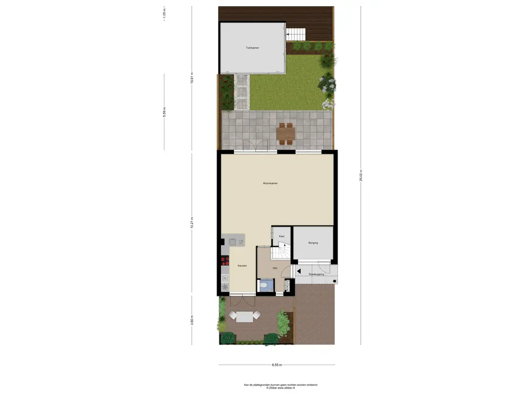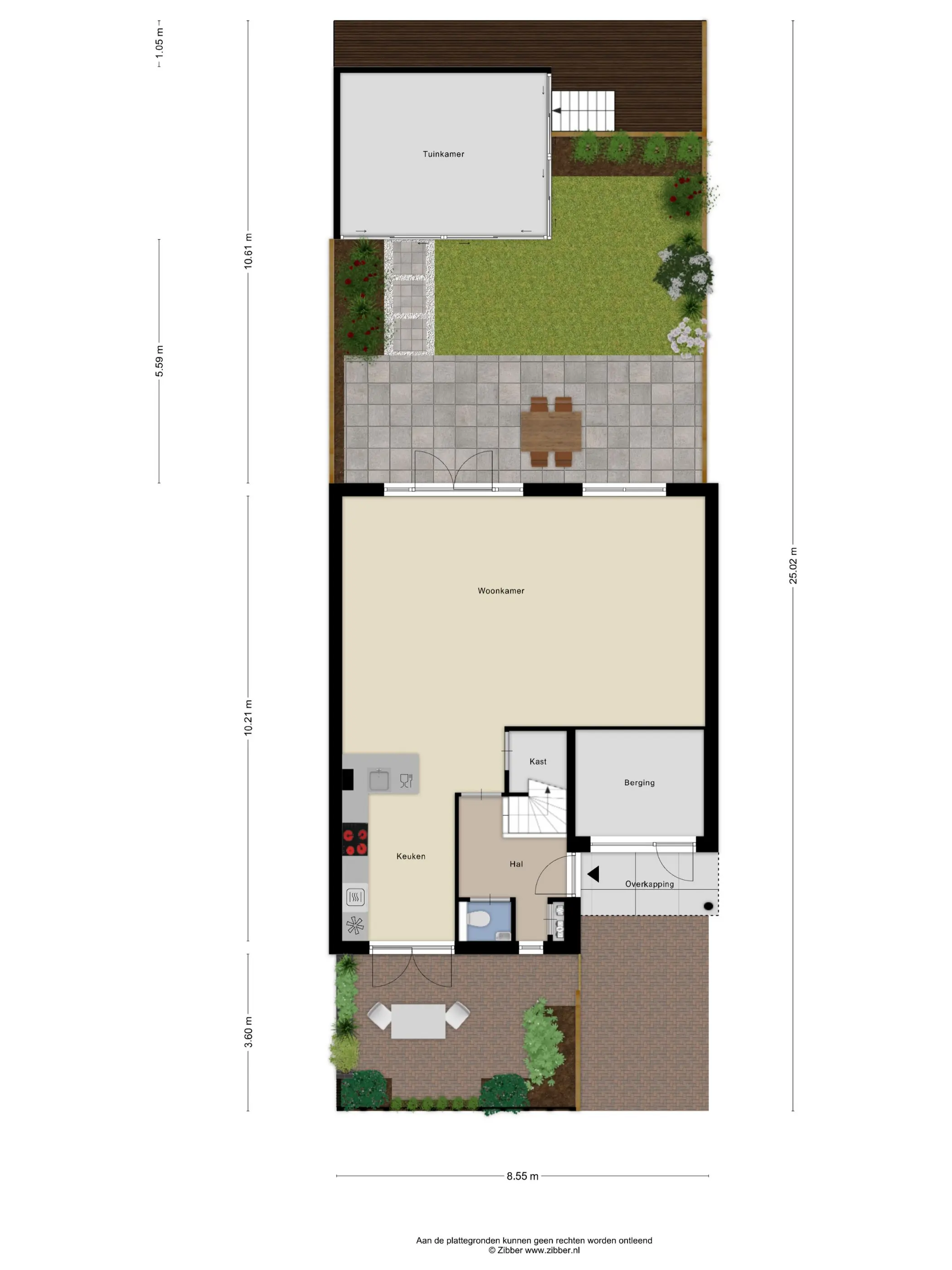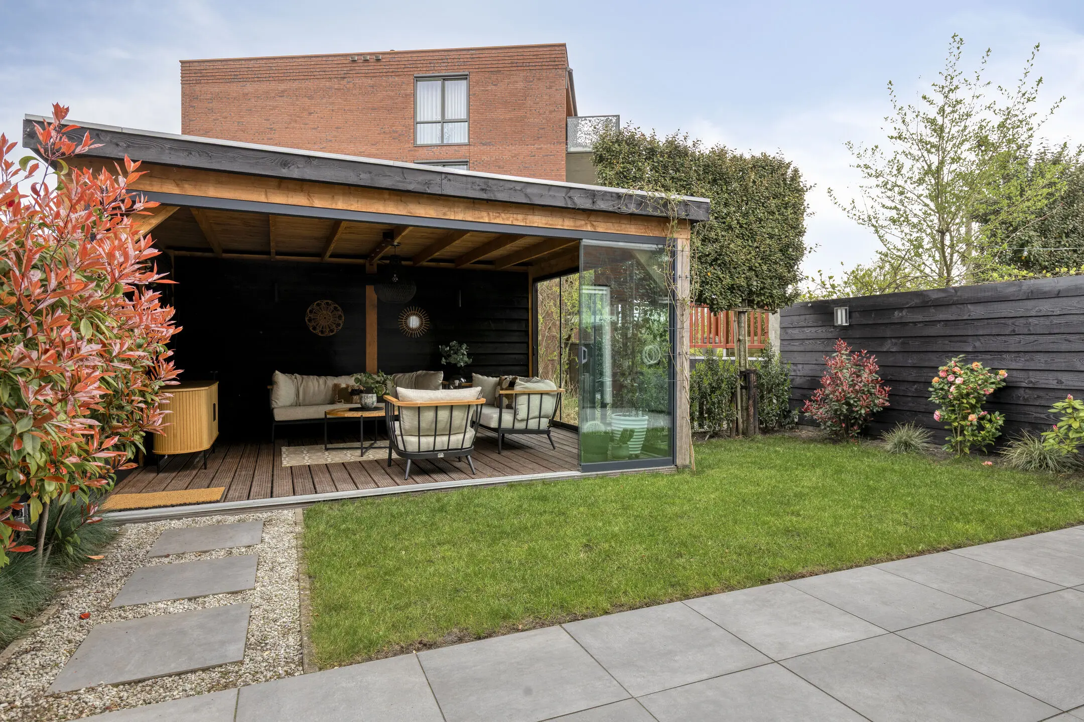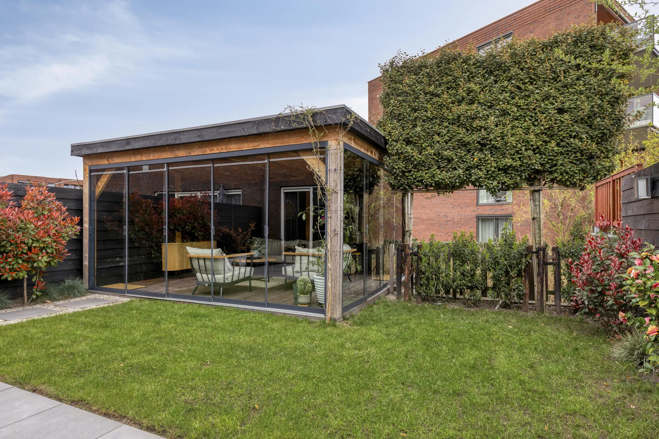 Via de openslaande deuren bereik je de fraai aangelegde achtertuin. Door de diepte van de tuin geniet je hier volop van de zon, zowel in de ochtend als in de middag. Achterin de tuin staat een sfeervolle, volledig afsluitbare overkapping (2023). Daarachter bevindt zich een houten steiger direct aan het water, een heerlijke plek om te ontspannen en te genieten van het uitzicht.