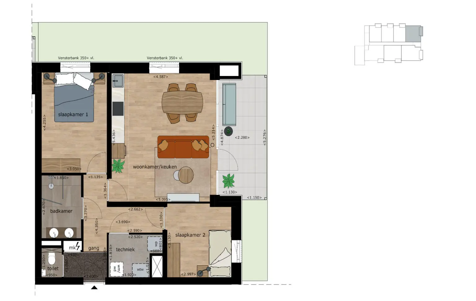 Indeling: entree, hal met meterkast, toiletruimte voorzien van wandcloset en fonteintje, ruime woonkamer met open keuken en deur naar terras en tuin, twee slaapkamers en badkamer v.v. douche en wastafel, inpandige berging met aansluiting voor wasmachine. Het appartement is geheel voorzien van vloerverwarming en geheel gasloos.
