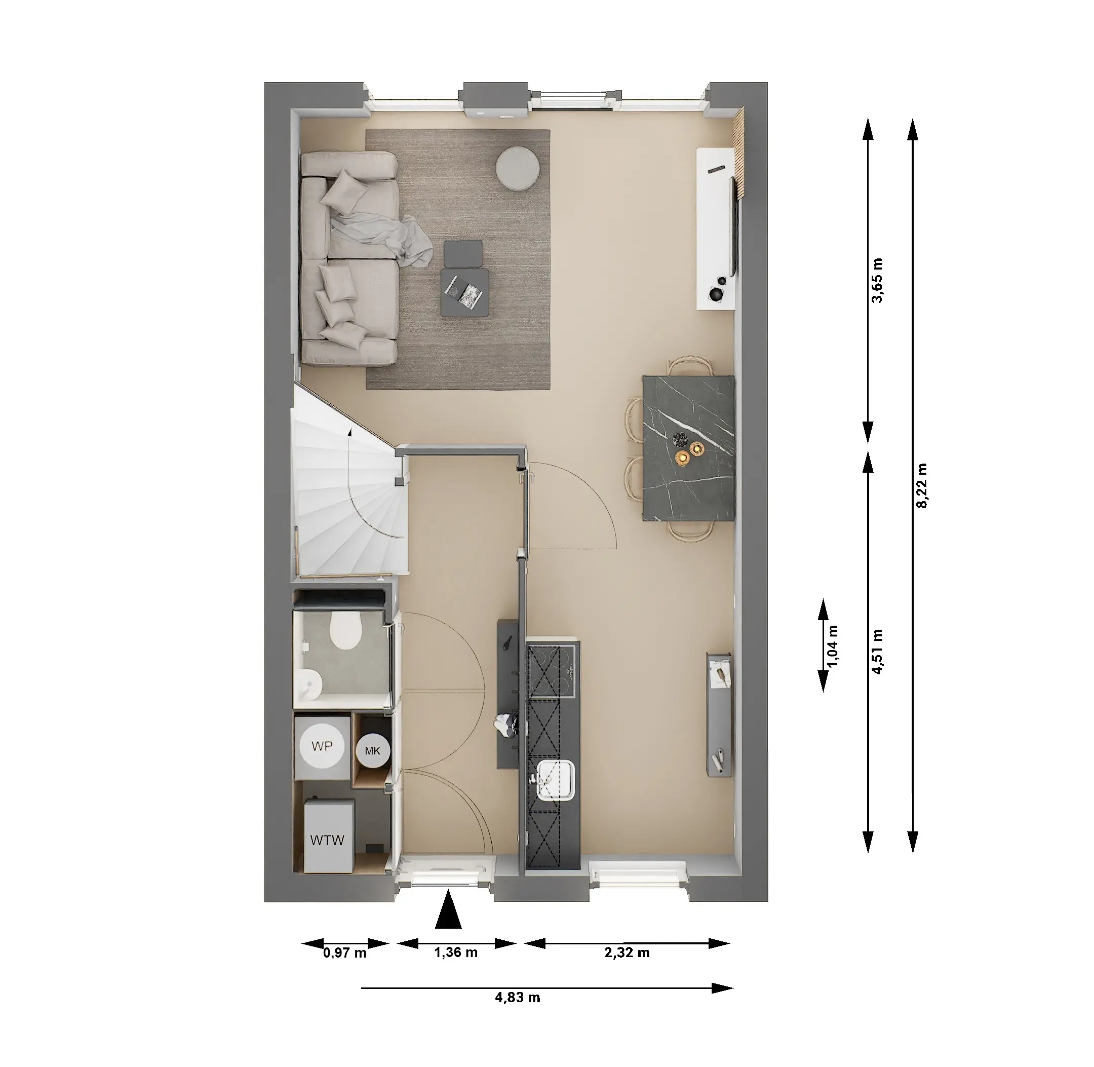 Op de begane grond bevindt zich de leefruimte met open keuken. De eerste verdieping biedt plaats aan twee slaapkamers en de badkamer. De vliering is geschikt als bergruimte.
