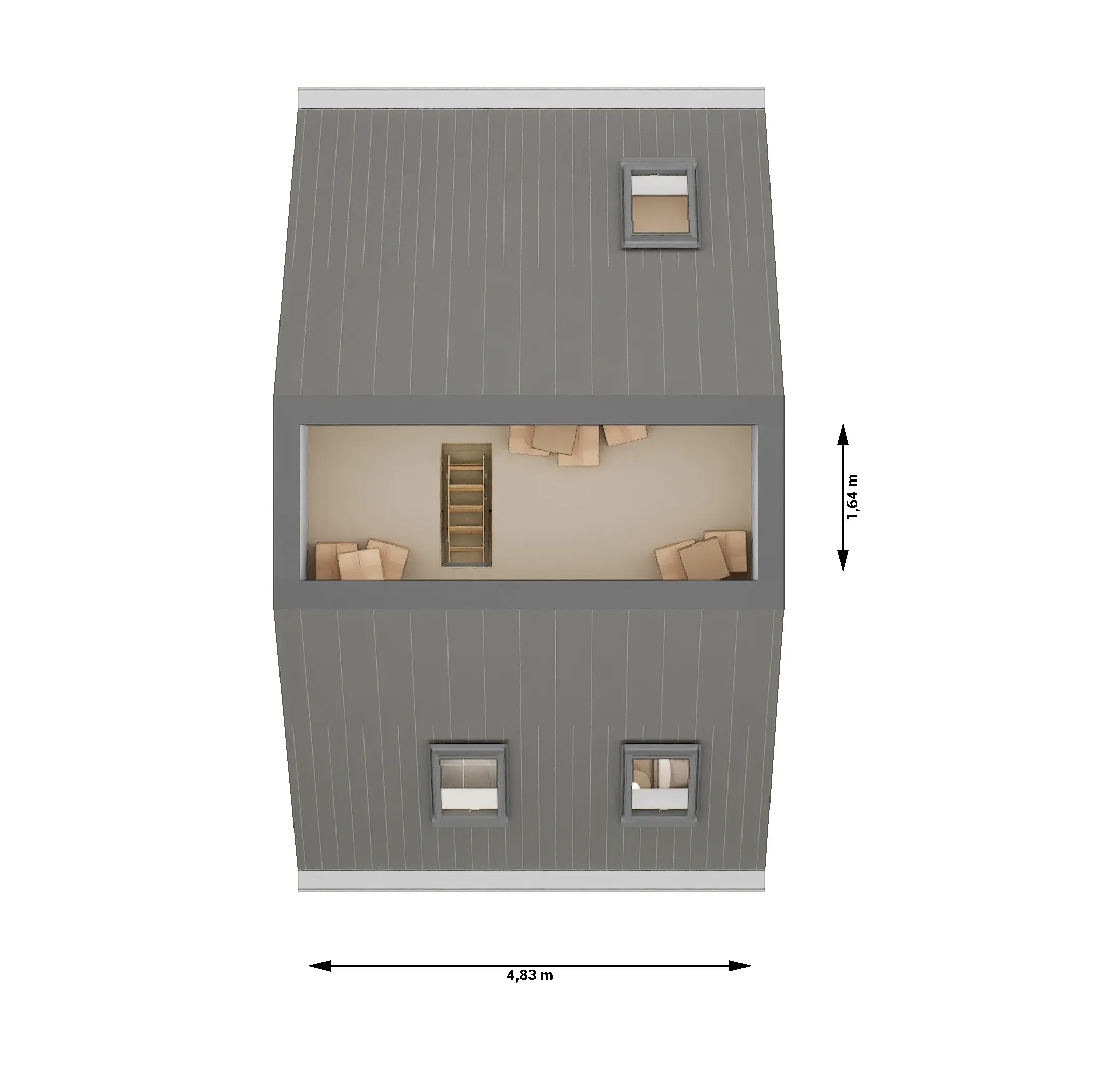 Op de begane grond bevindt zich de leefruimte met open keuken. De eerste verdieping biedt plaats aan twee slaapkamers en de badkamer. De vliering is geschikt als bergruimte.