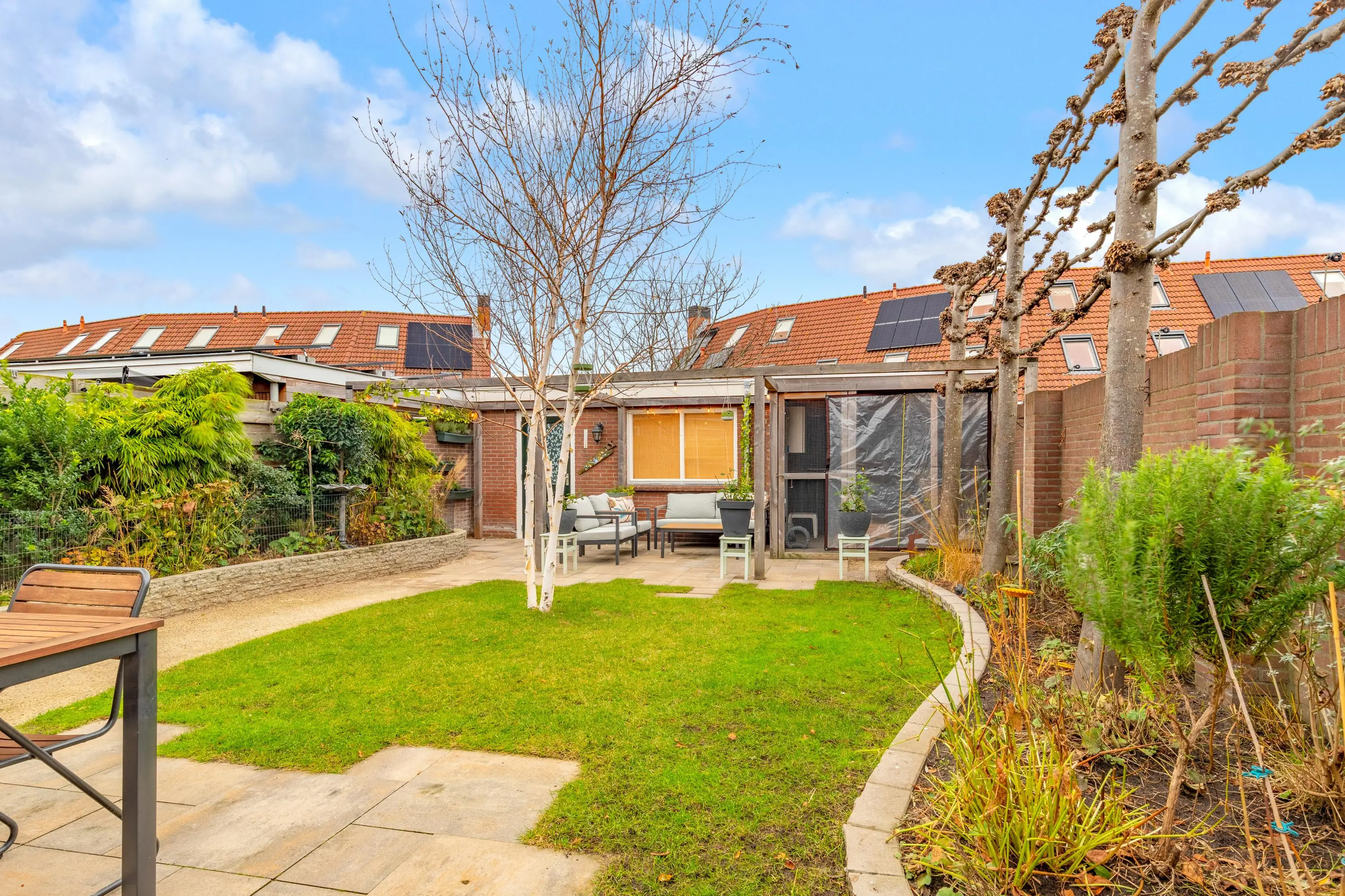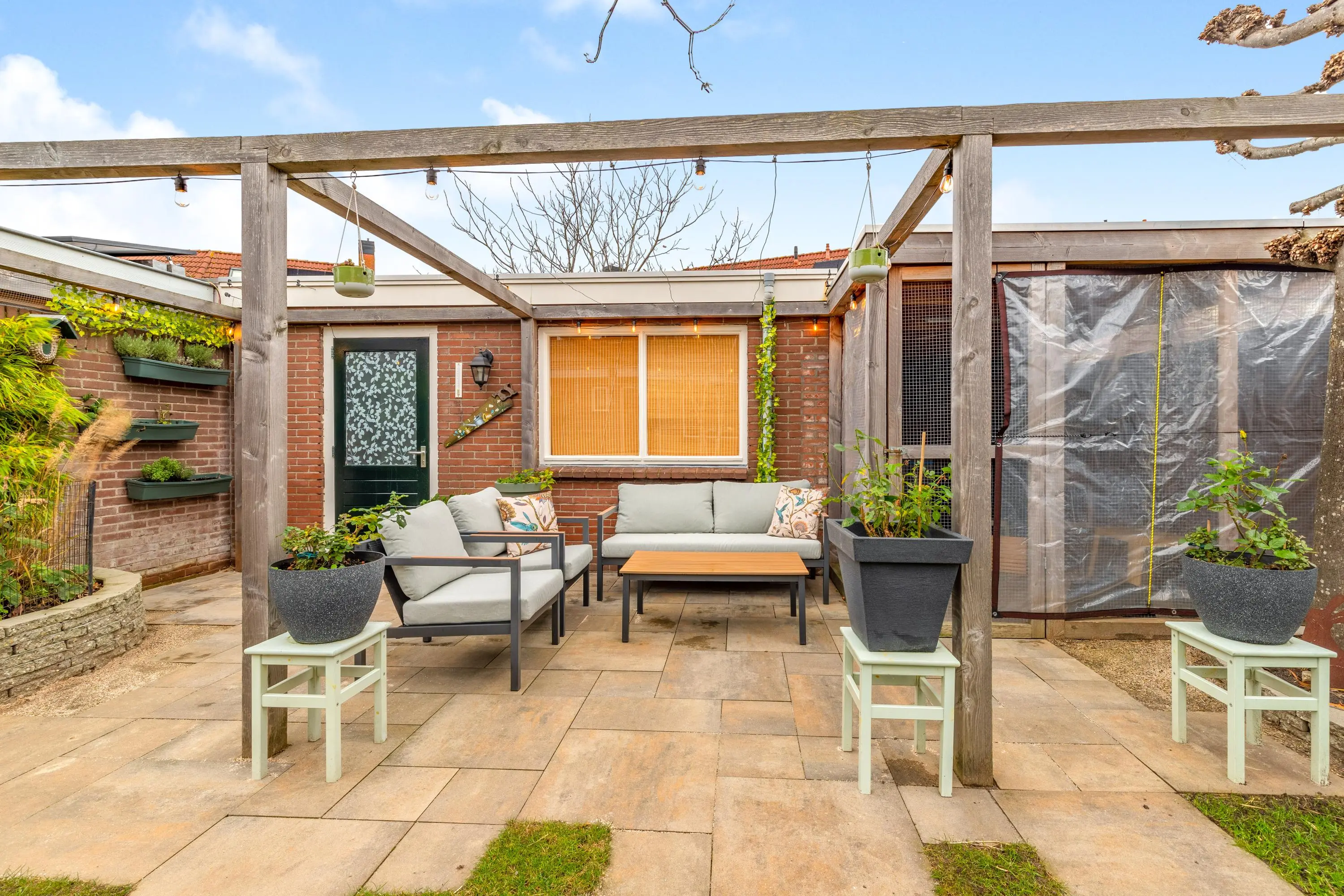 De tuin, aangelegd in 2022 en dankzij de hoekligging extra ruimtelijk, biedt ’s zomers de hele dag zon. Onder de overkappingen zit je heerlijk beschut.
