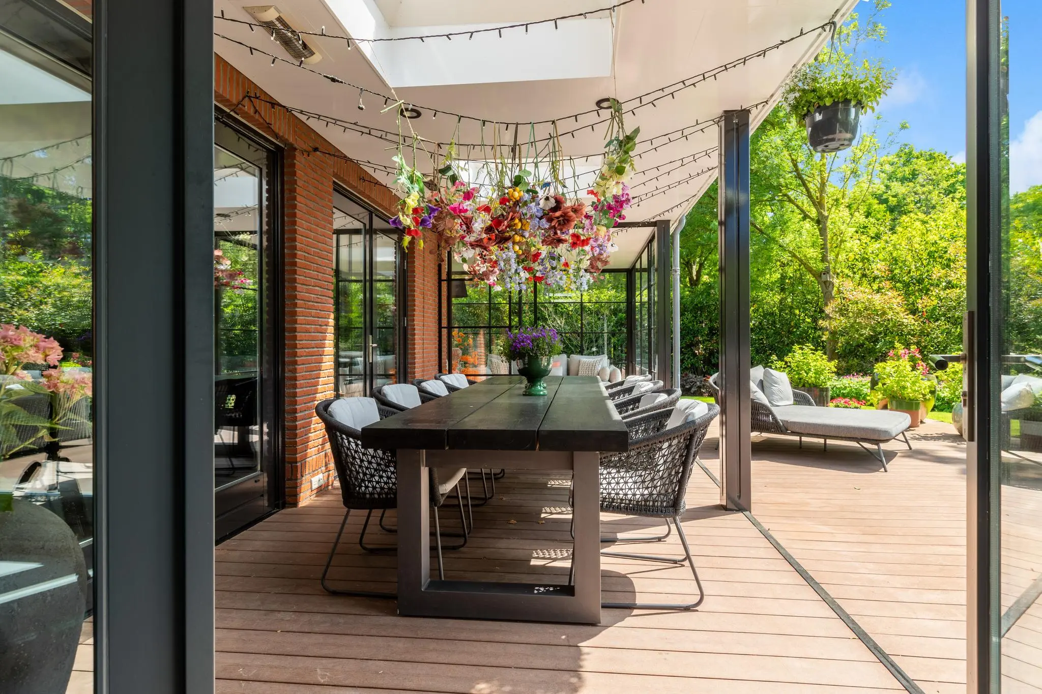 De tuin is werkelijk een verlengstuk van de woning. Openslaande deuren leiden naar een oase van rust: een fraai aangelegde, zonnige tuin op het zuiden met meerdere zitplekken. In de open lucht op het loungeterras of wat meer beschut in de knusse en stijlvolle serre met glazen wanden (naar wens open of dicht). Dankzij de ingebouwde heaters is het hier het hele jaar door aangenaam vertoeven. Daarnaast beschikt de tuin over een royale vrijstaande houten berging met een fietsenoverkapping, ideaal voor het opbergen van tuingereedschap, fietsen of tuinmeubilair.