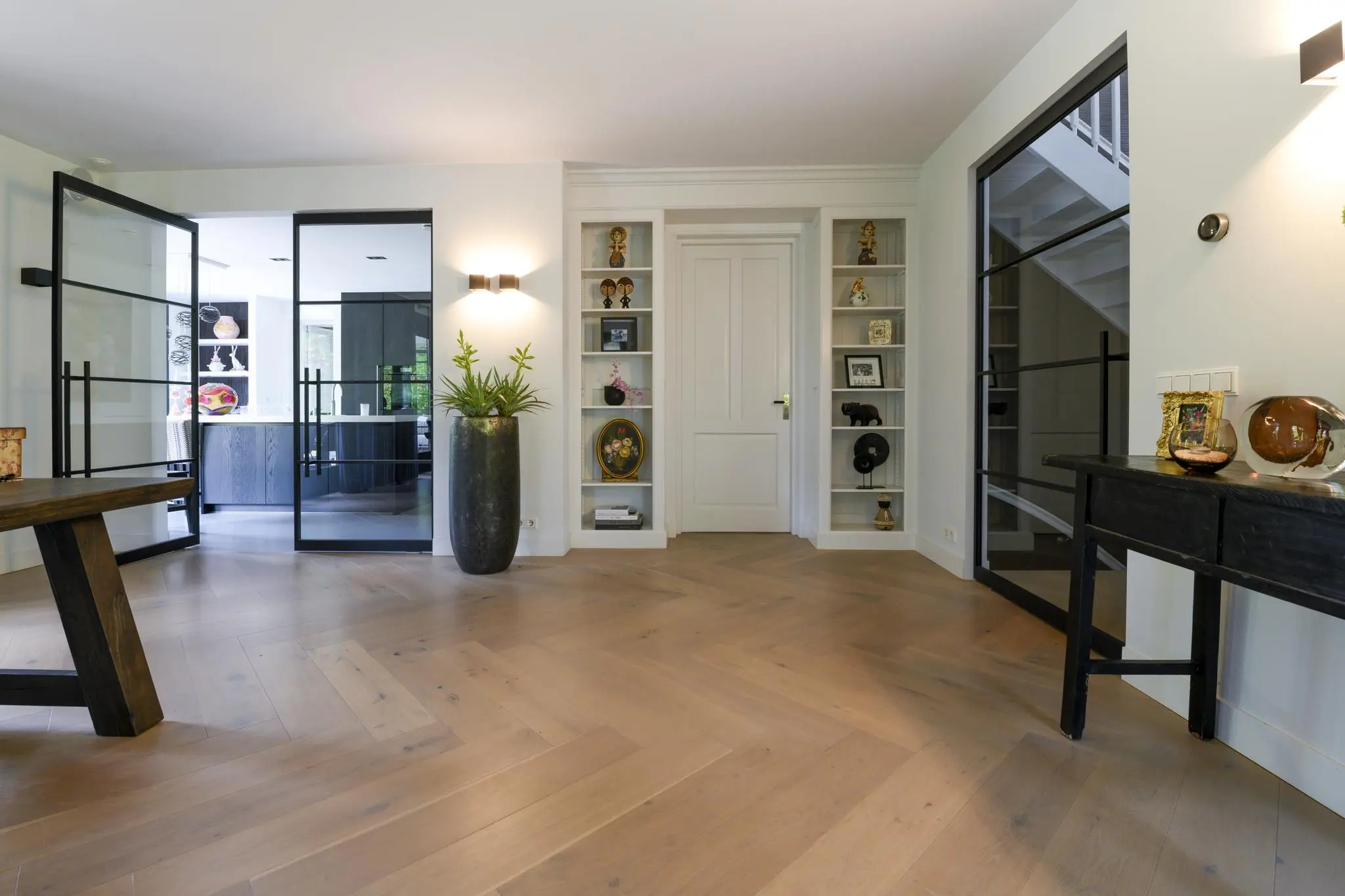 Via het royale, op afstand bedienbare hek bereik je de voordeur. Bij binnenkomst stap je in een ruime hal met een warme, uitnodigende uitstraling. De gehele woonruimte is voorzien van een prachtige houten visgraatvloer met comfortabele vloerverwarming. Aan de voorzijde van de woning bevindt zich een sfeervolle zithoek. Daarnaast is er meer dan voldoende ruimte voor een royale eettafel, ideaal voor gezellige diners of lange avonden met familie en vrienden. Via de woonkamer bereik je het kantoor: een fijne, lichte werkplek voor thuiswerkers, maar ook uitermate geschikt om in te richten als slaapkamer. Dit maakt de woning eenvoudig aanpasbaar voor levensloopbestendig wonen.
