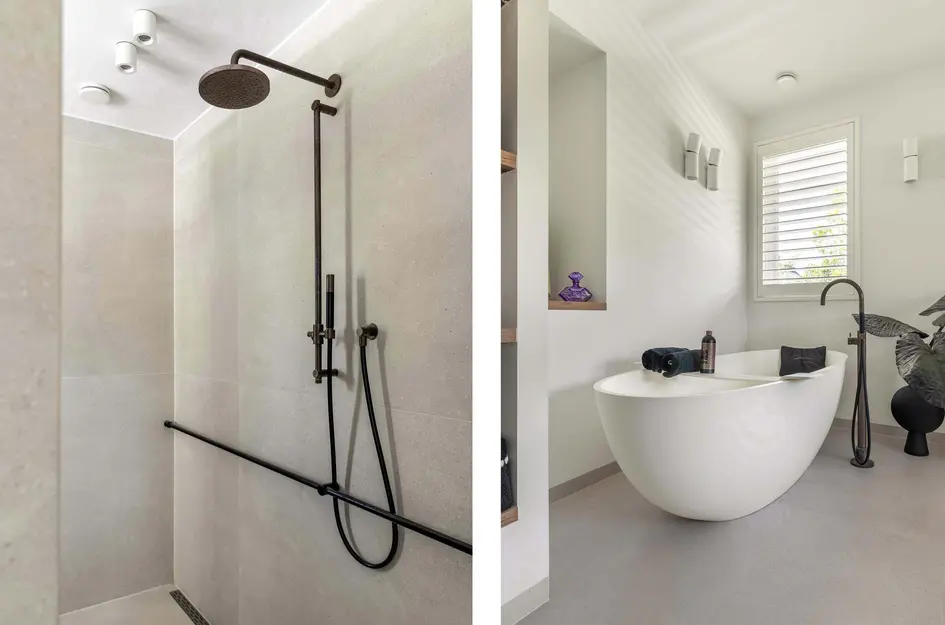 The front door is reached through the wide, remote-controlled gate . One enters into a spacious, warm and inviting hallway. The entire living area has a beautiful wooden herringbone floor with comfortable floor heating. There is a cosy sitting area at the front of the house. In addition, there is more than enough space for a generous dining table, ideal for cosy dinners or long evenings with family and friends. The office is reached through the living room. This is a comfortable, bright workspace for home workers, but also extremely suitable to be modified into a bedroom if required.