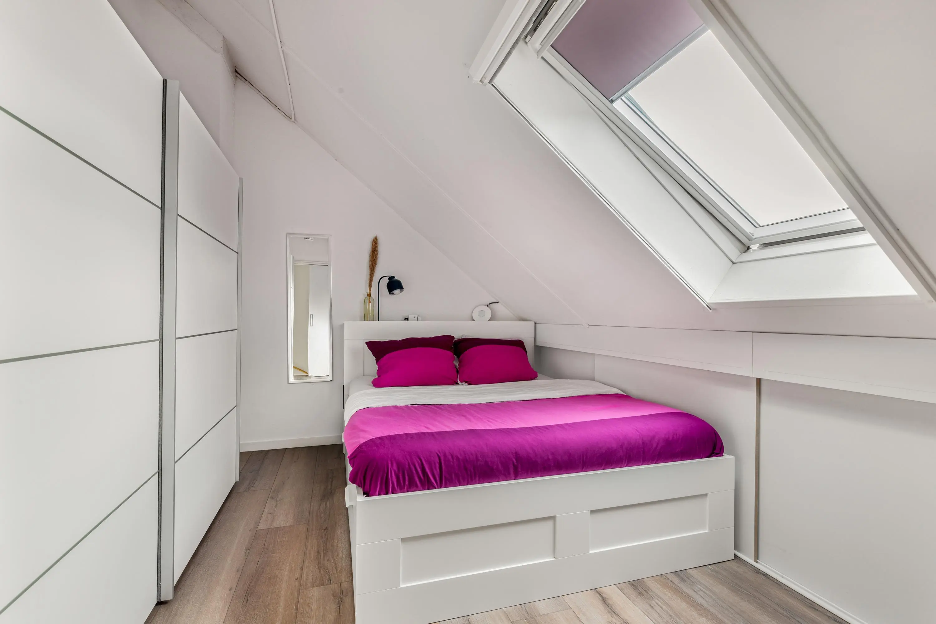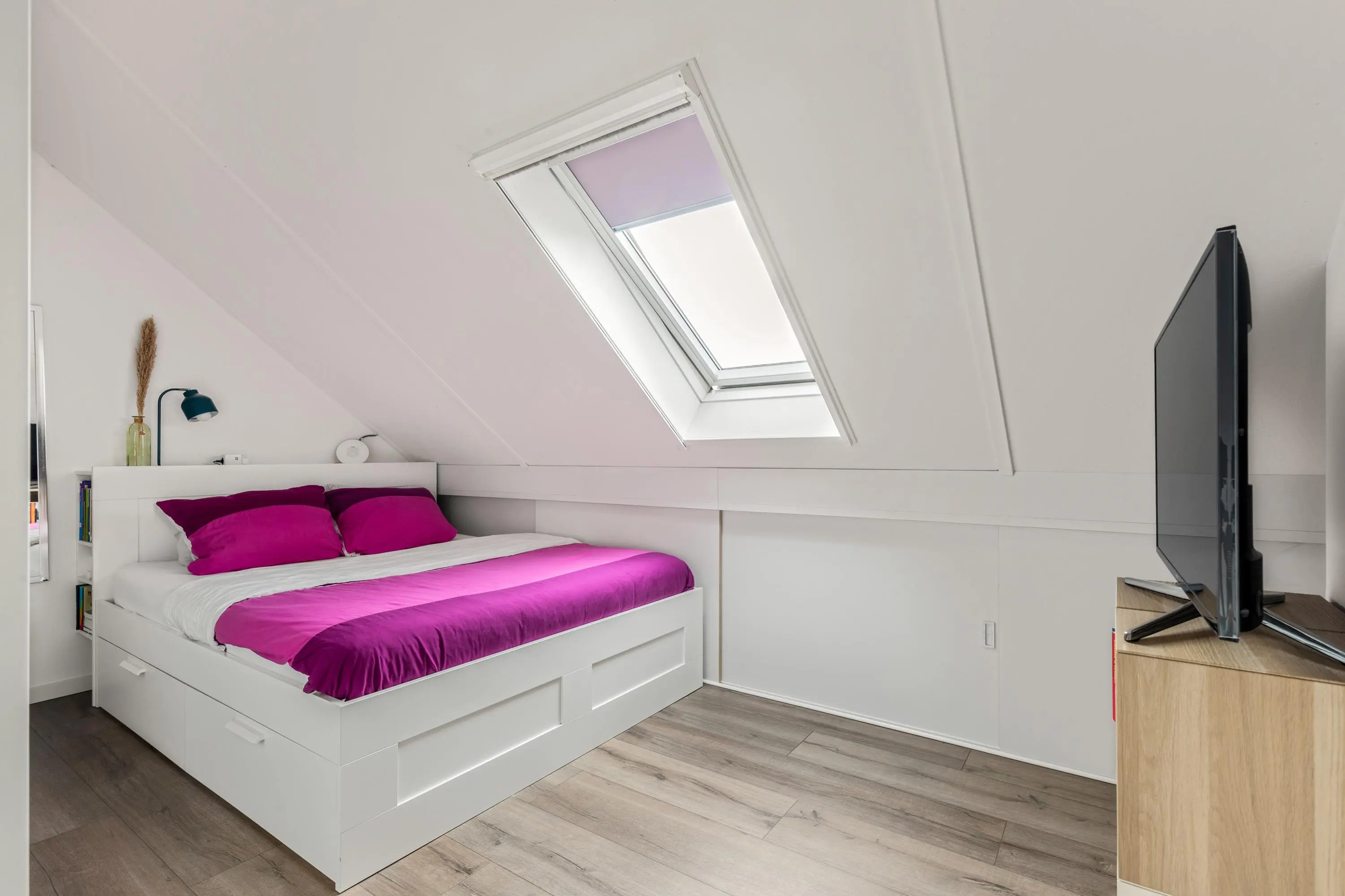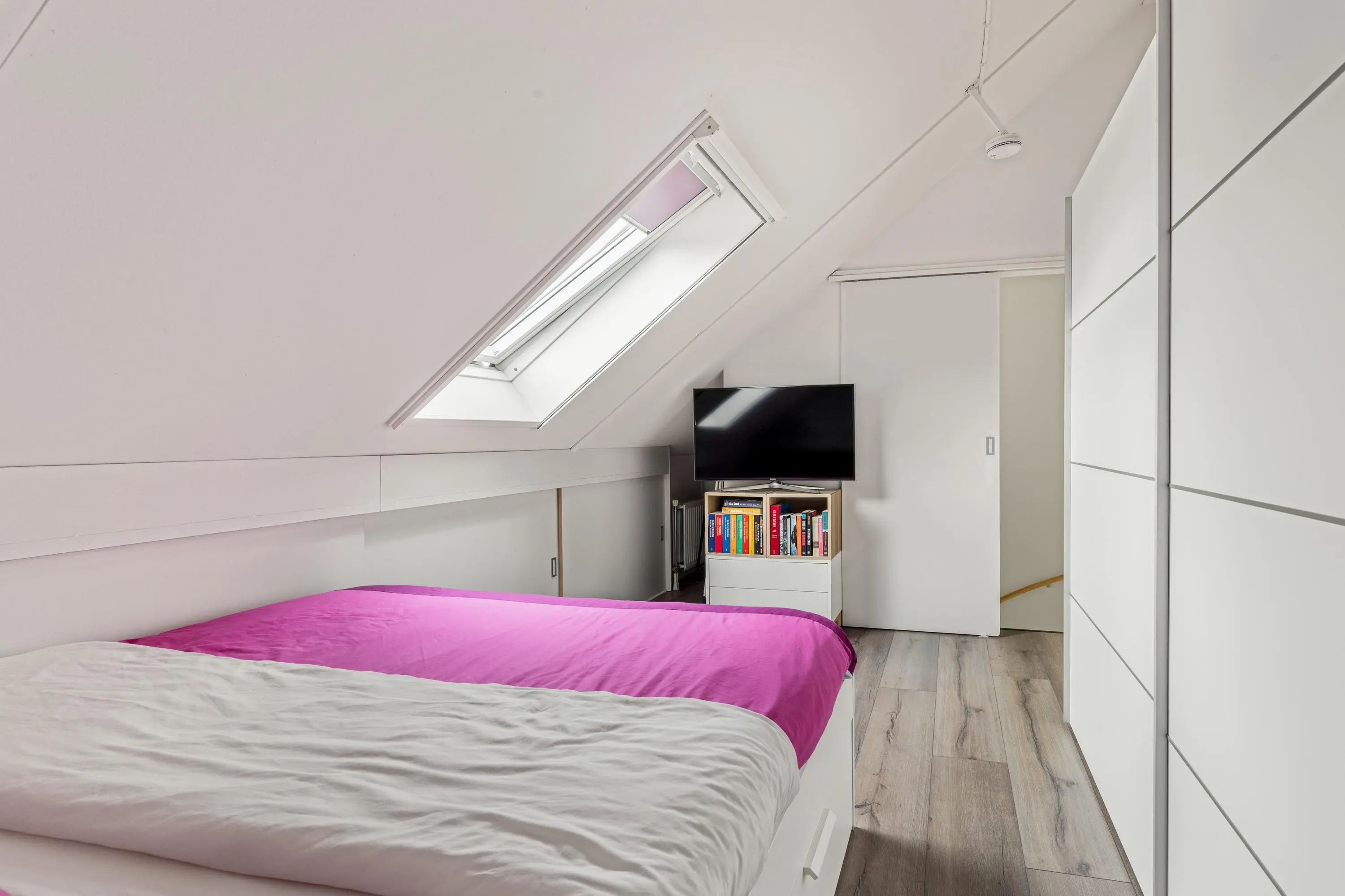 Met de open trap in de eetkamer, lopen we door naar de eerste verdieping. Dit is de ruimte waar op dit moment de woonkamer is gesitueerd. Deze woonkamer is heerlijk royaal en de raampartijen tot de grond zijn hier een echte eyecatcher. Ook hier is weer een open trap aanwezig, die ons verder brengt naar de tweede verdieping. Op de tweede verdieping is een ruime slaapkamer waar je heerlijk tot rust kunt komen. Deze kamer is keurig afgewerkt en voorzien van praktische opbergruimte onder de schuine wanden.