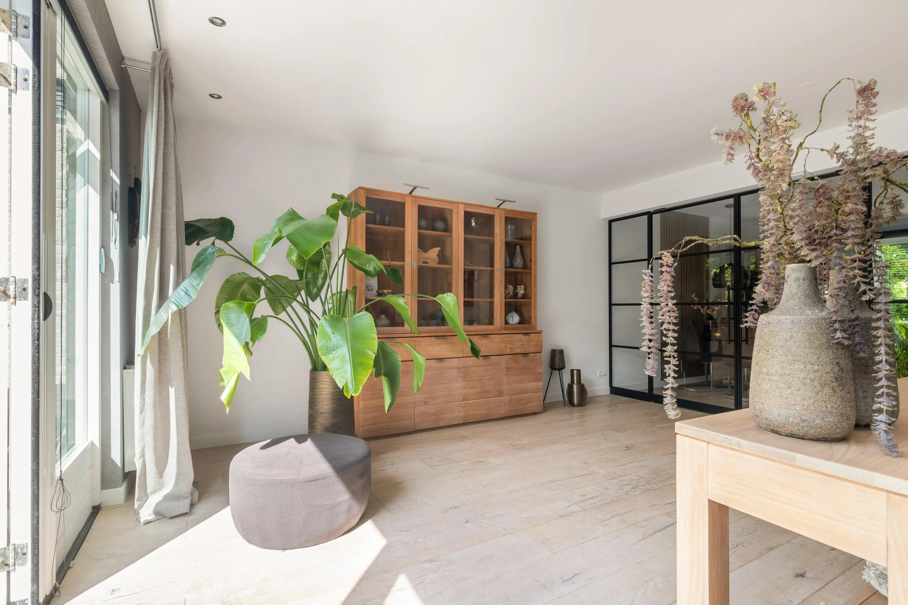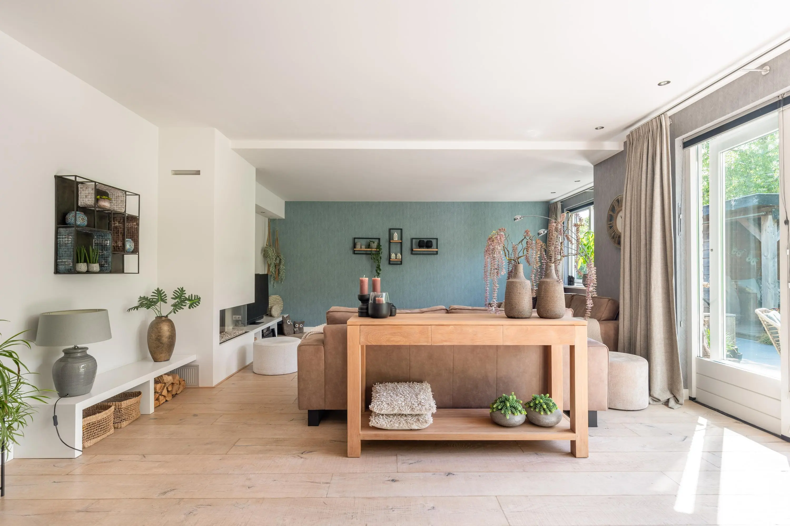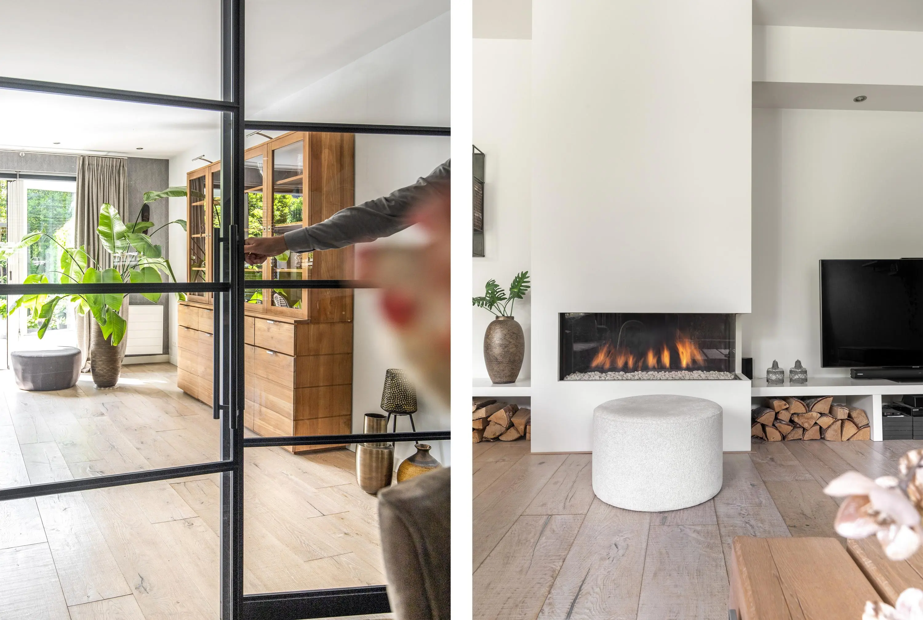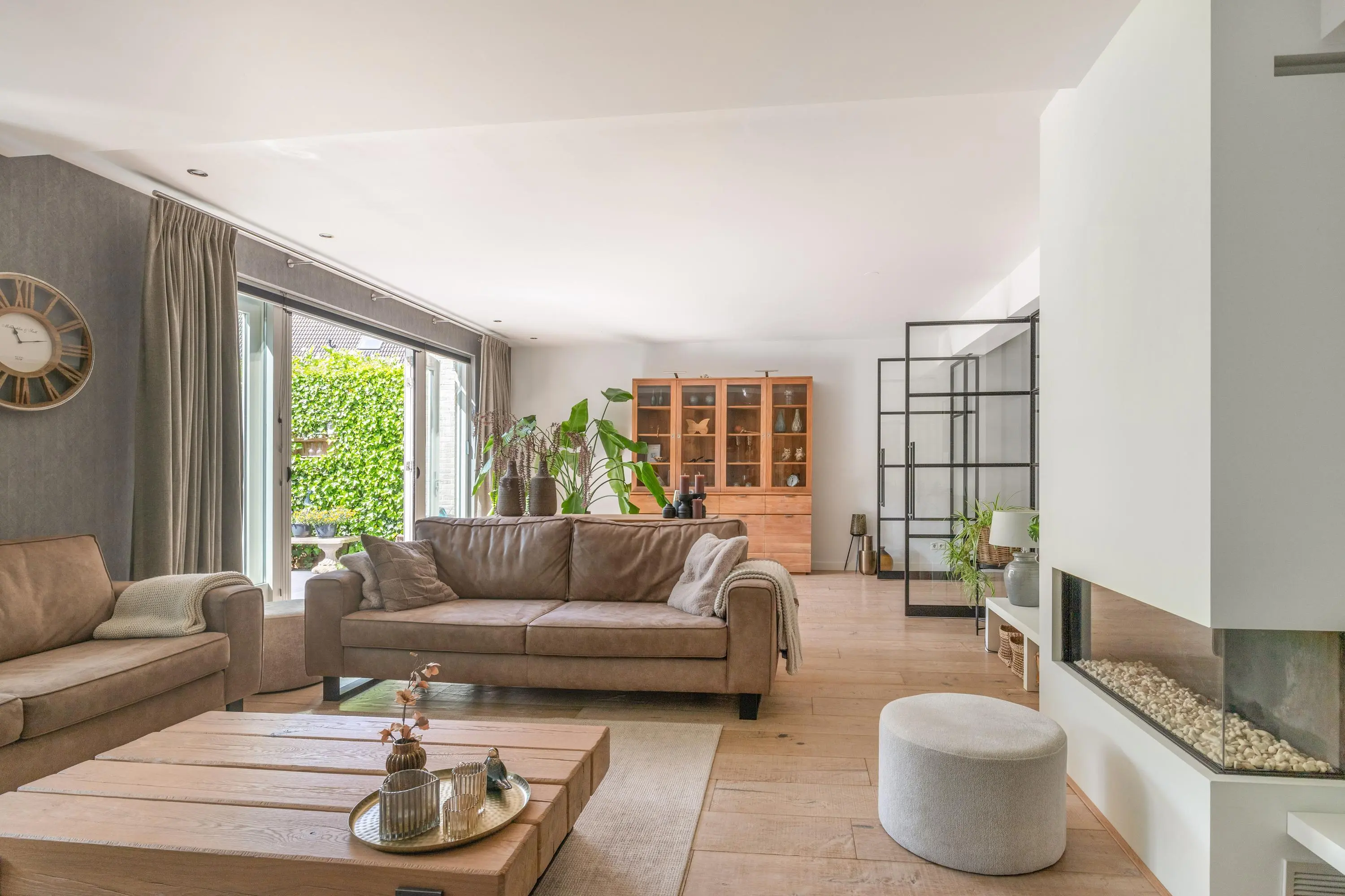 De stijlvolle glazen deuren verbinden de keuken met de tuingerichte woonkamer. Dankzij de grote raampartijen en openslaande deuren naar de tuin is de woonkamer heerlijk licht. De gashaard zorgt voor extra sfeer en warmte.