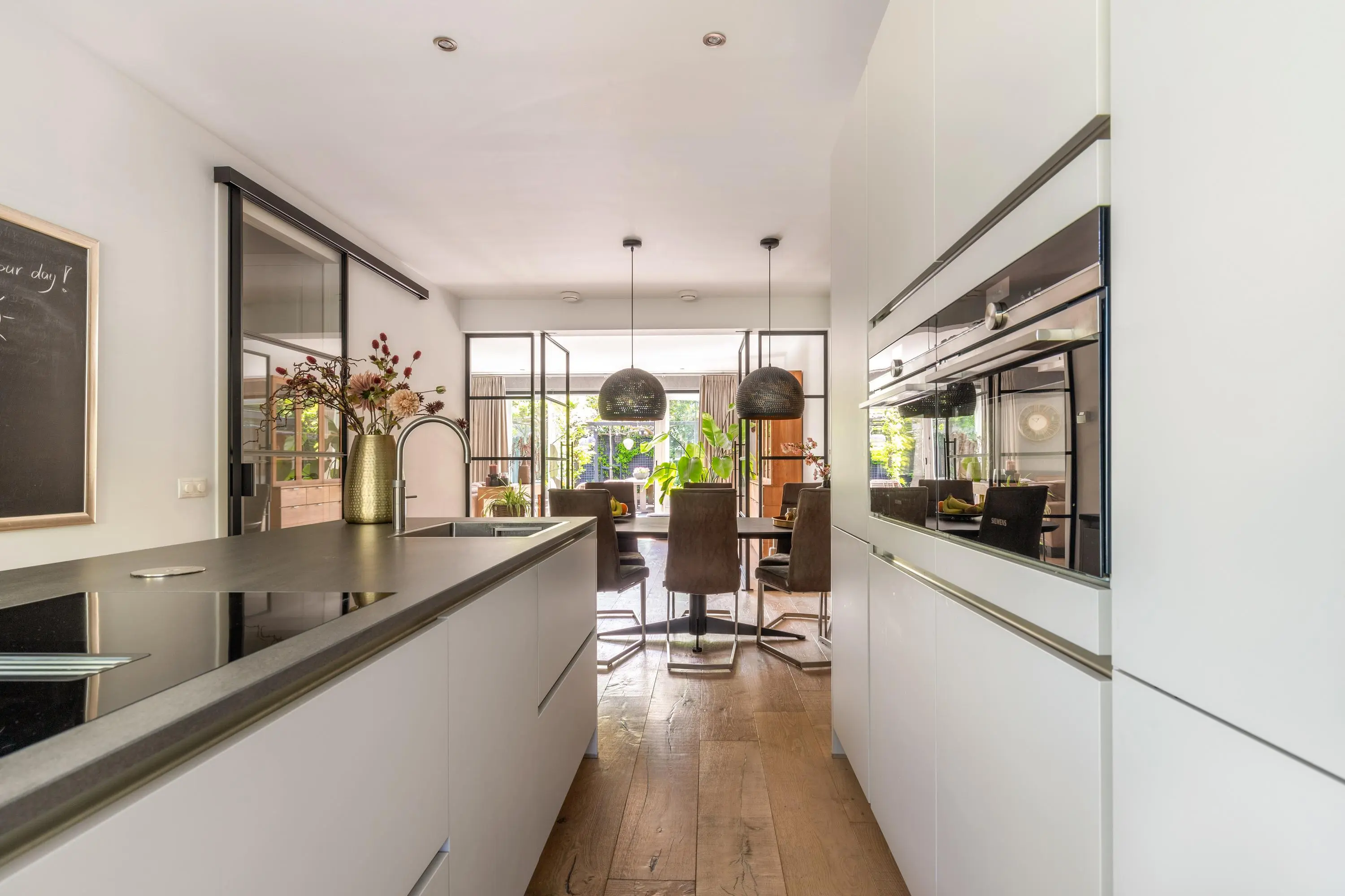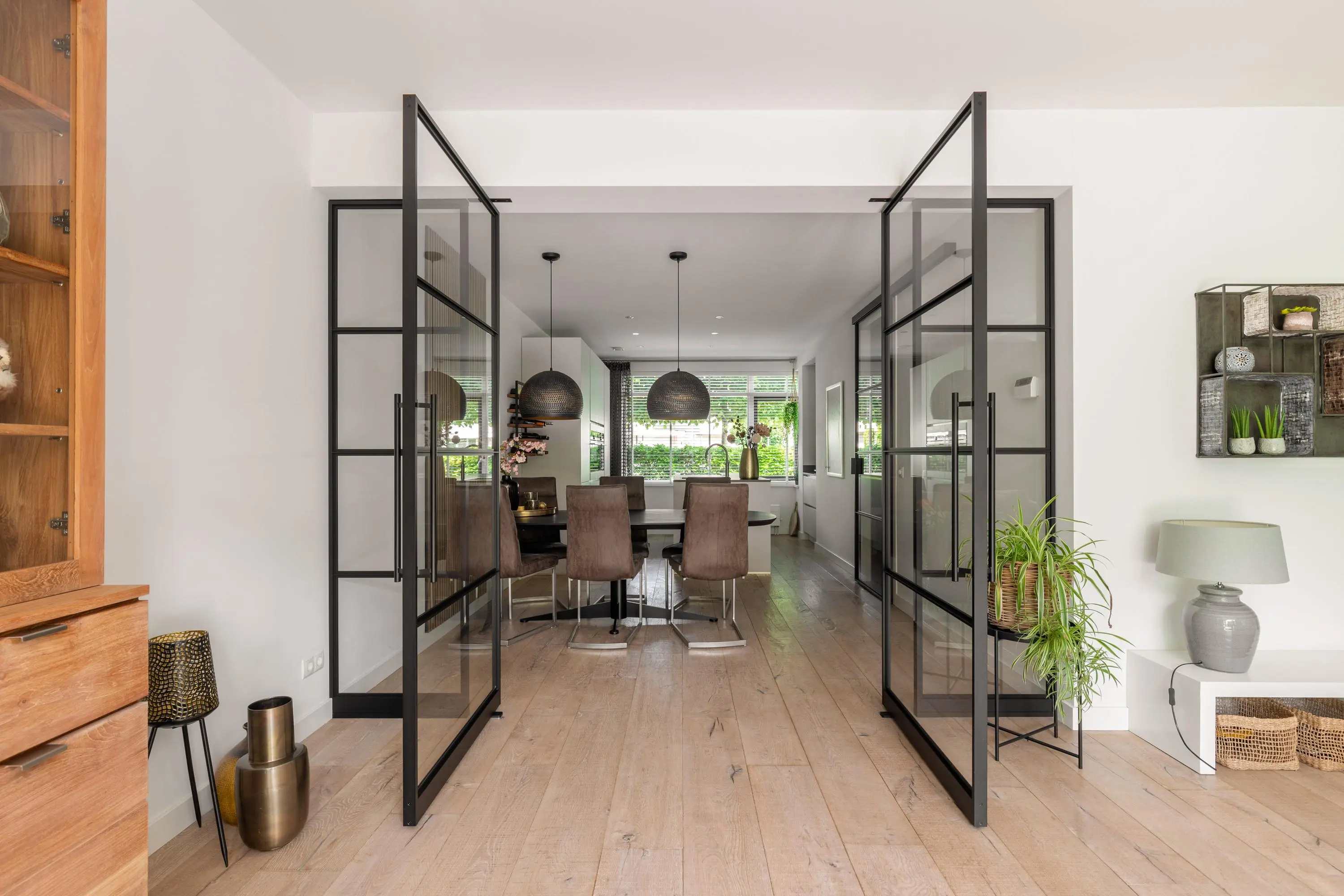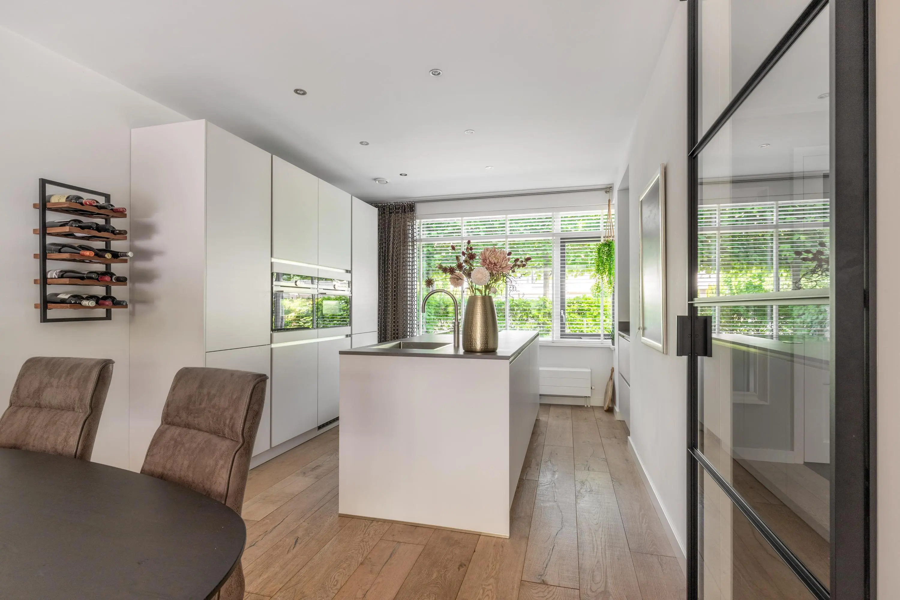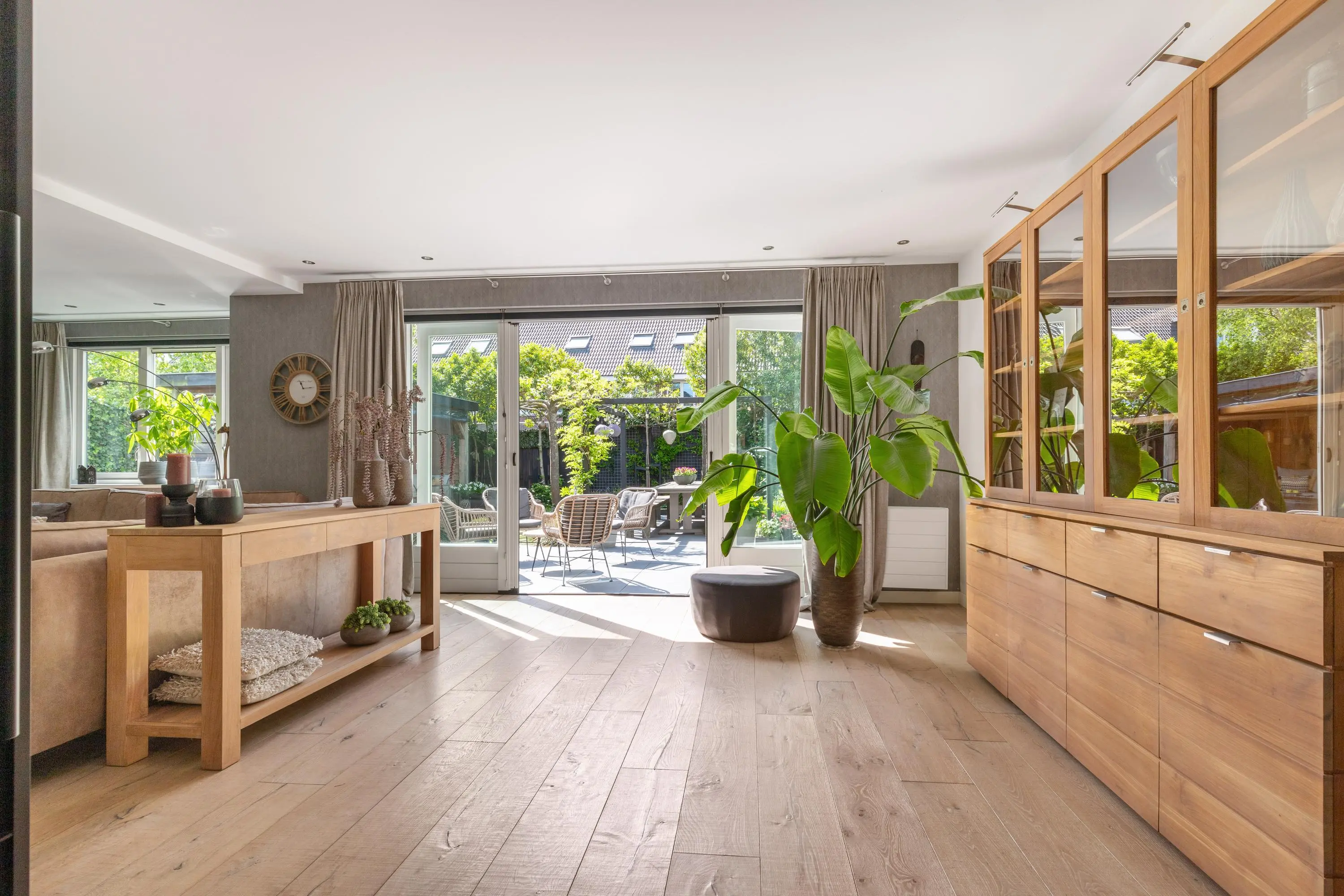 De stijlvolle glazen deuren verbinden de keuken met de tuingerichte woonkamer. Dankzij de grote raampartijen en openslaande deuren naar de tuin is de woonkamer heerlijk licht. De gashaard zorgt voor extra sfeer en warmte.