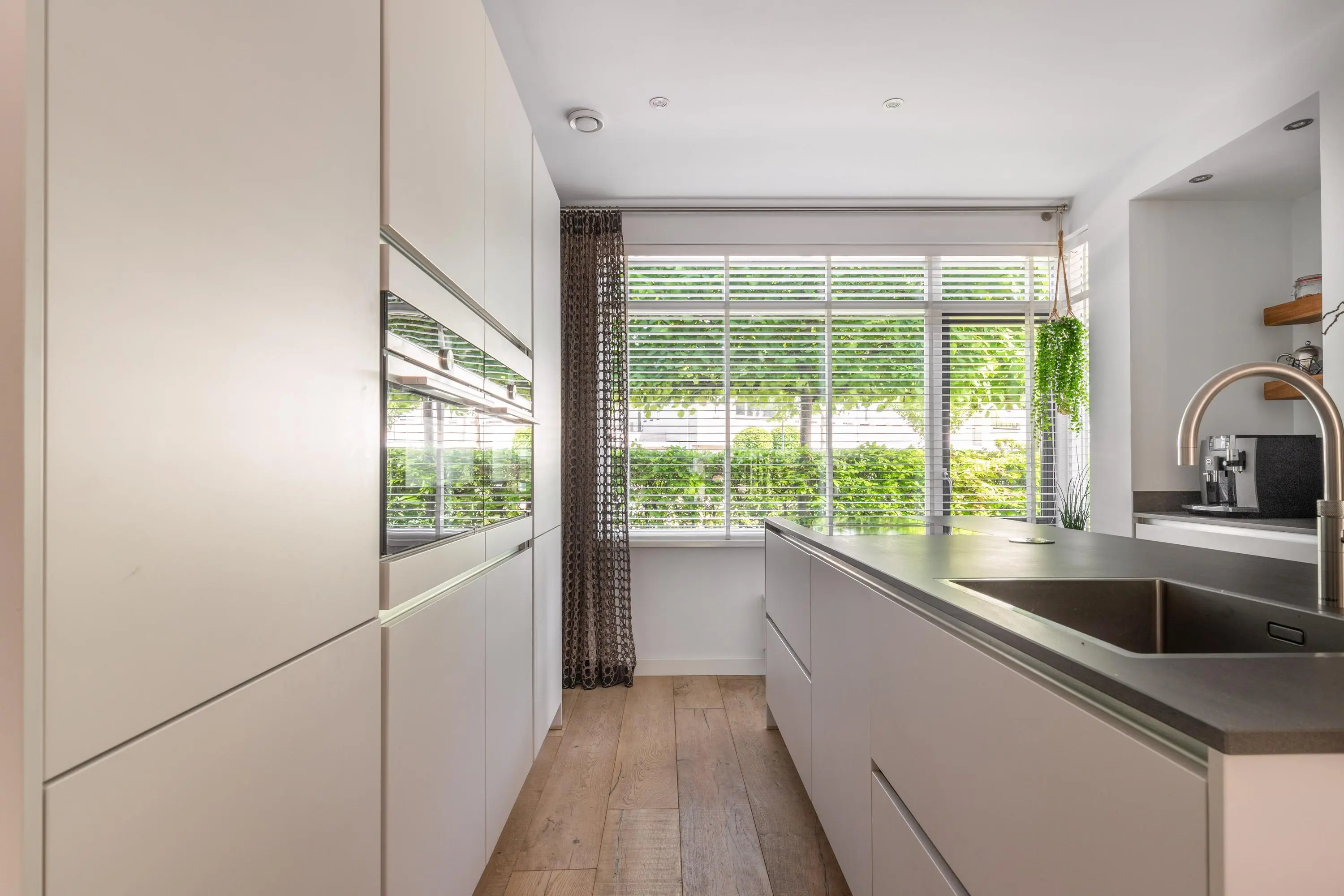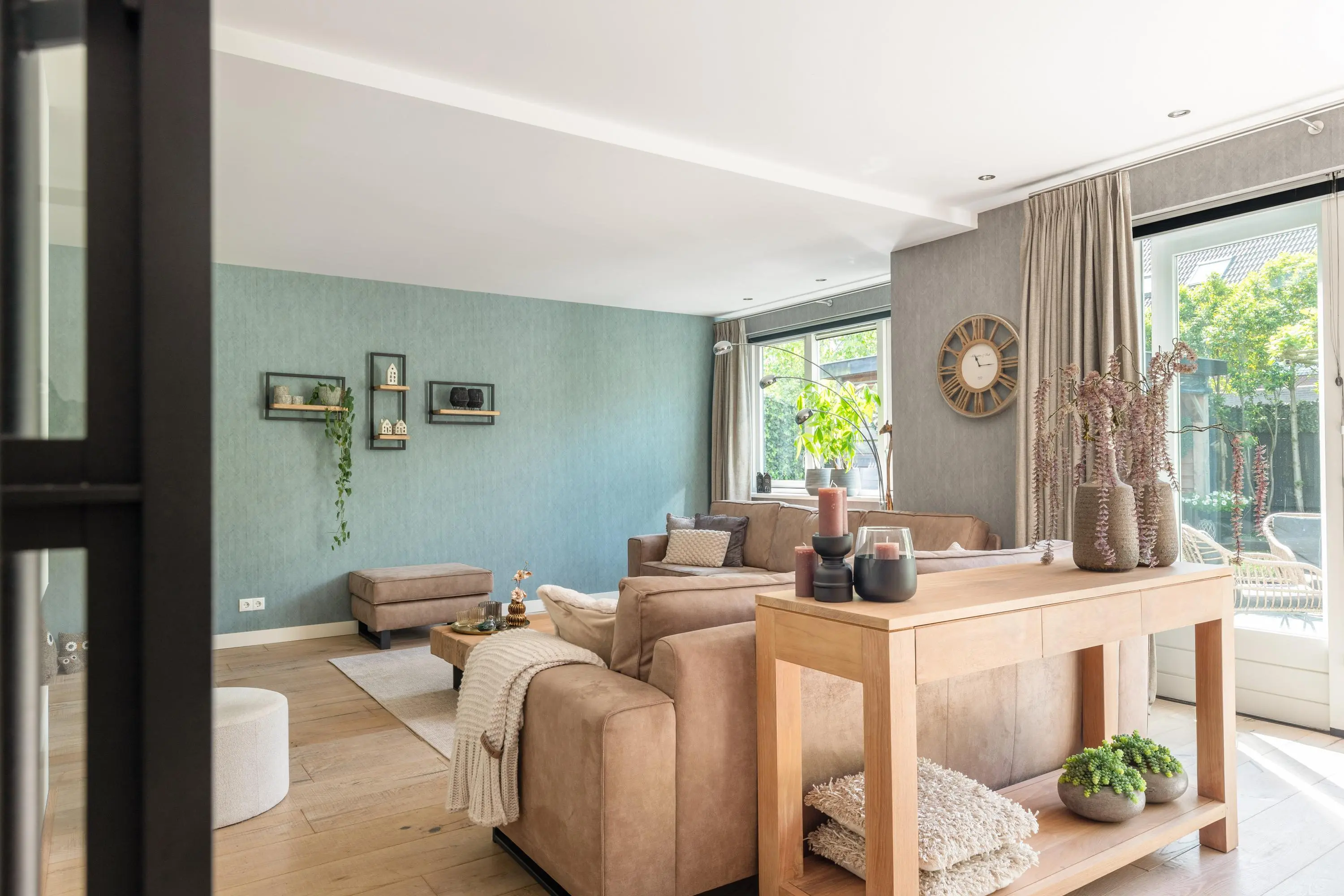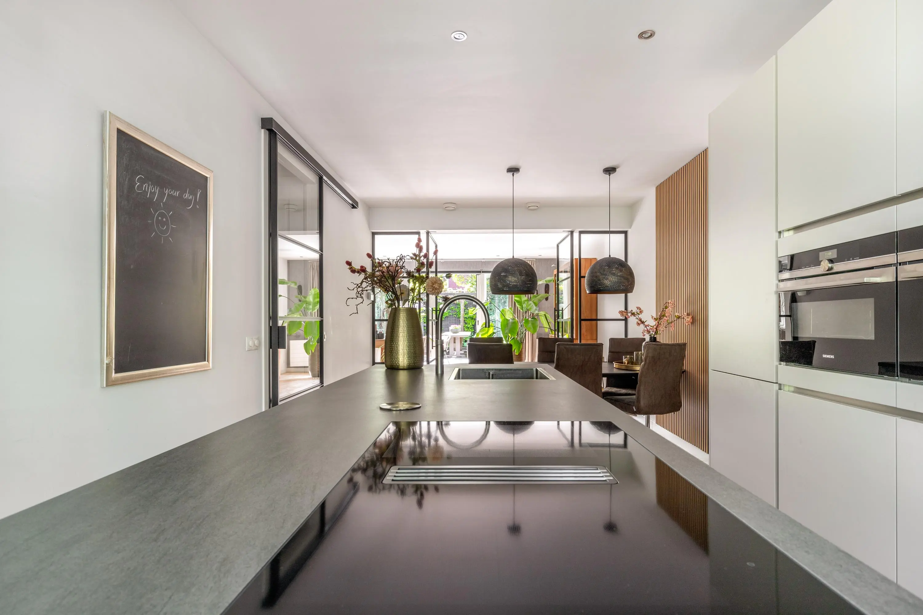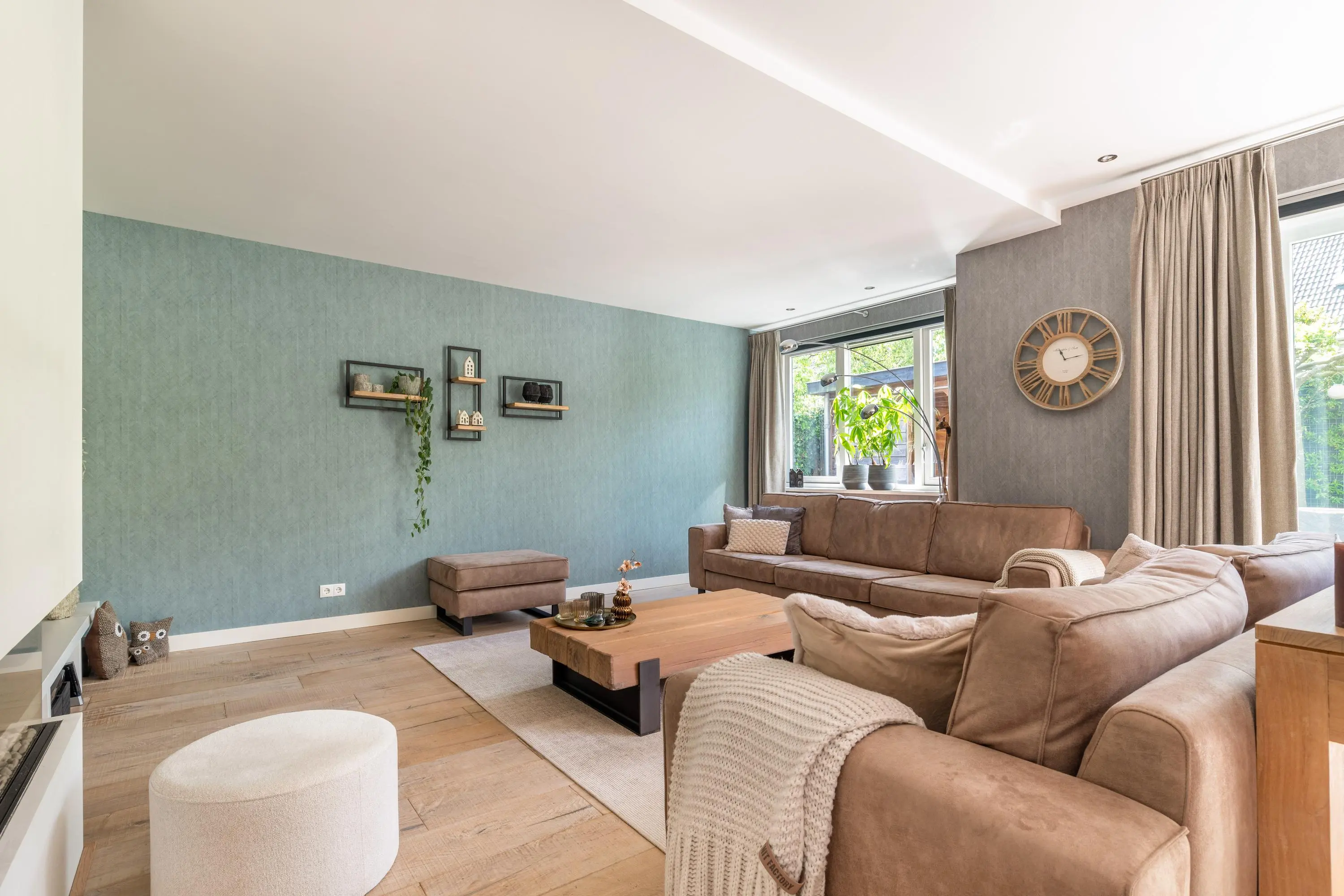 De stijlvolle glazen deuren verbinden de keuken met de tuingerichte woonkamer. Dankzij de grote raampartijen en openslaande deuren naar de tuin is de woonkamer heerlijk licht. De gashaard zorgt voor extra sfeer en warmte.