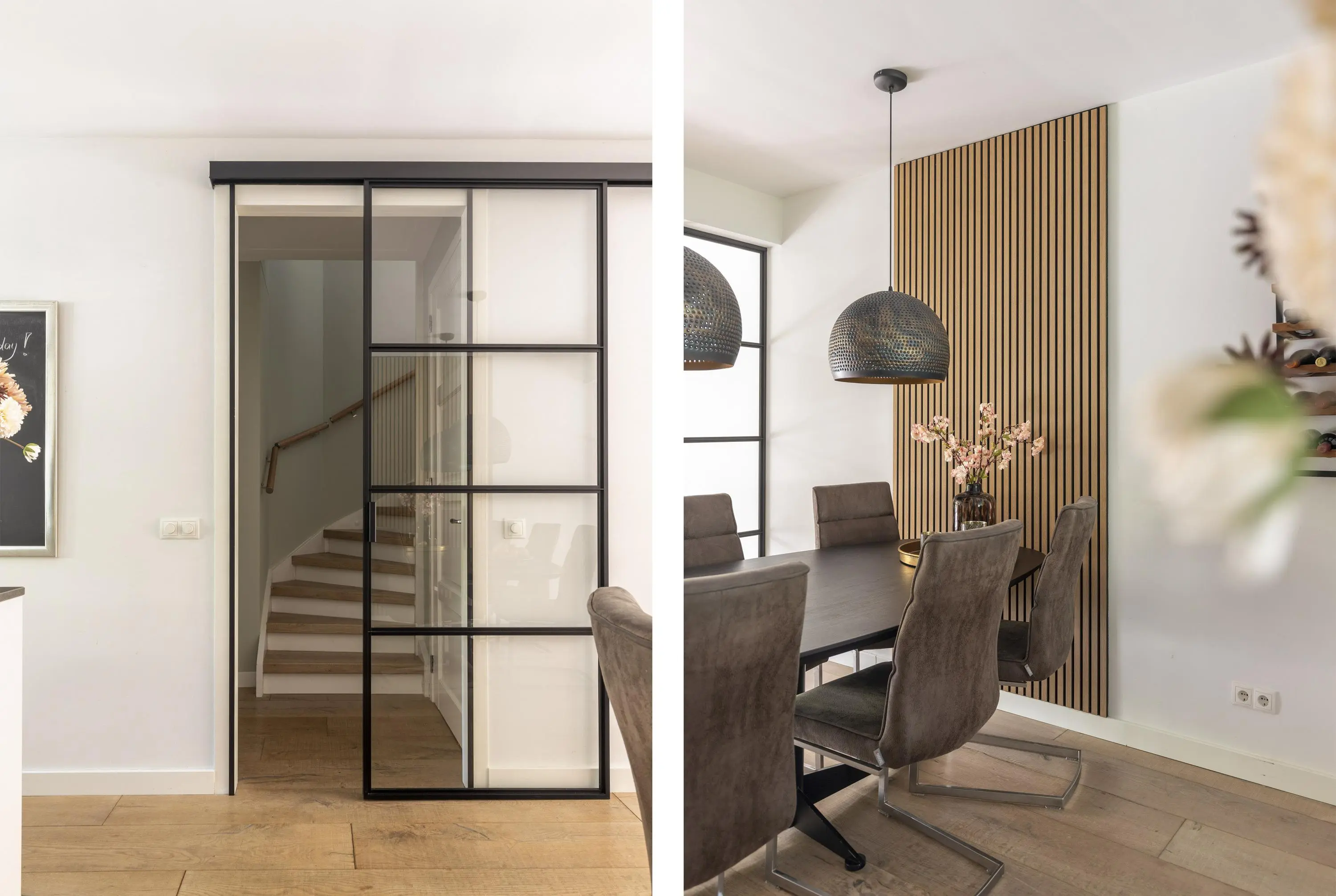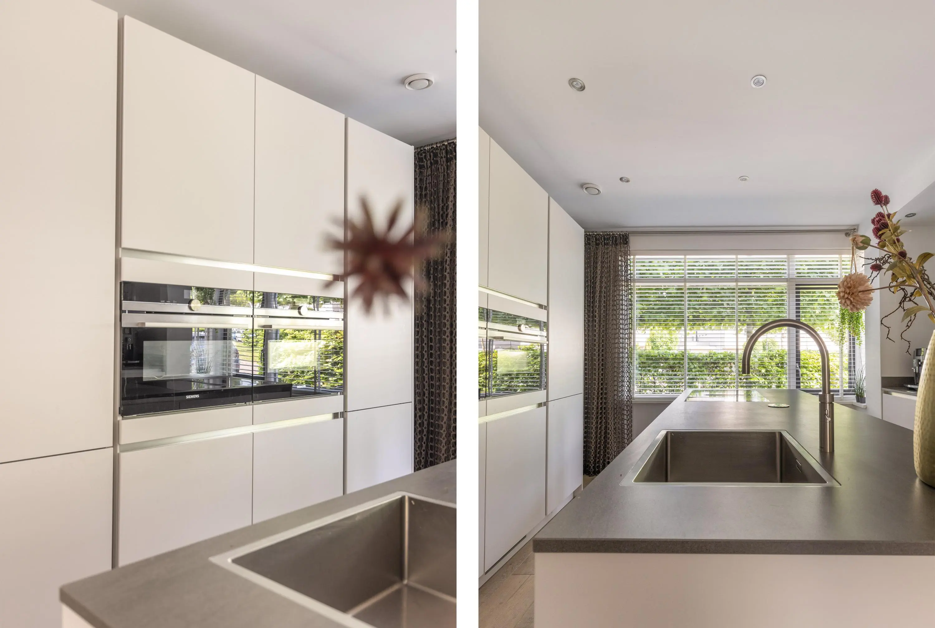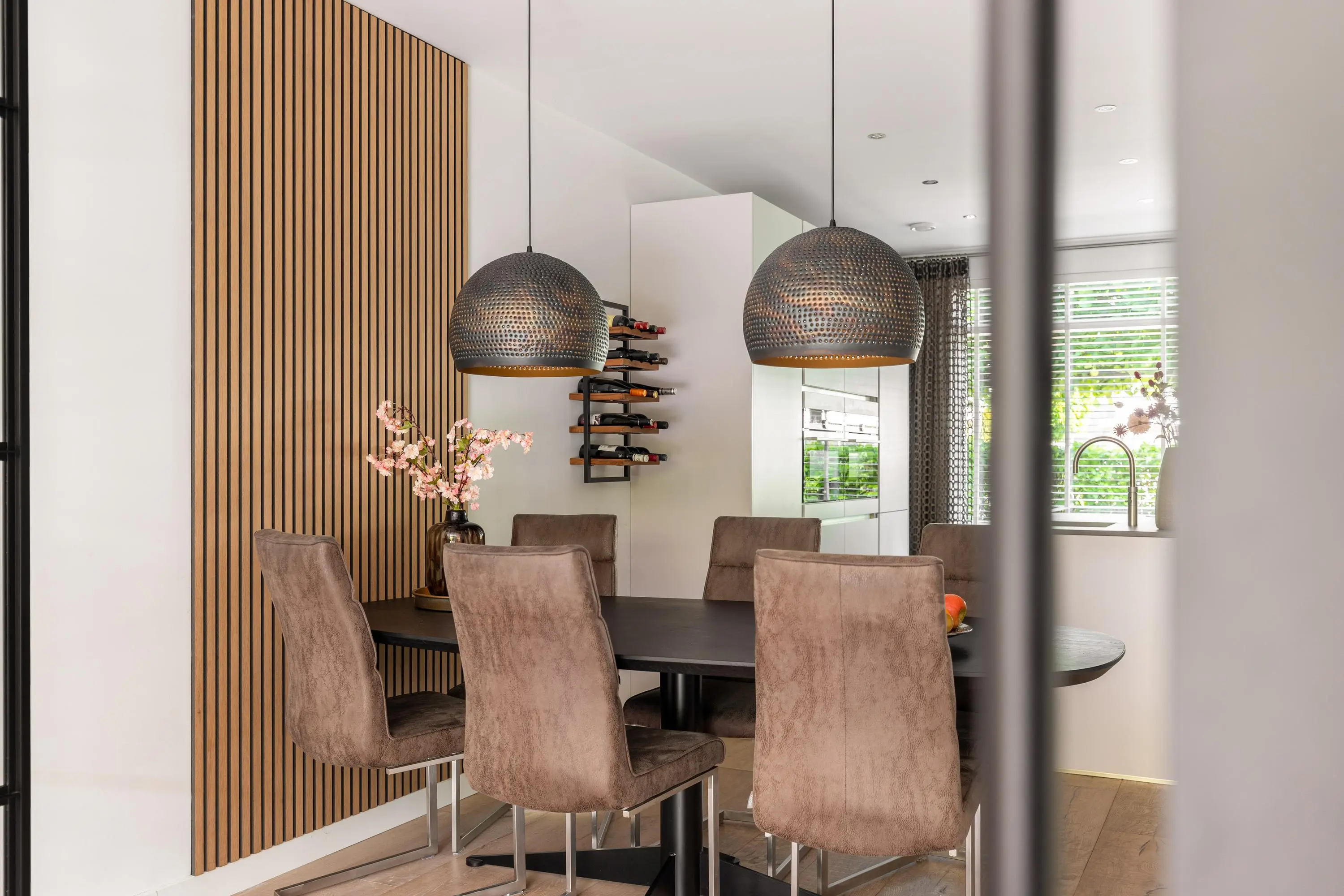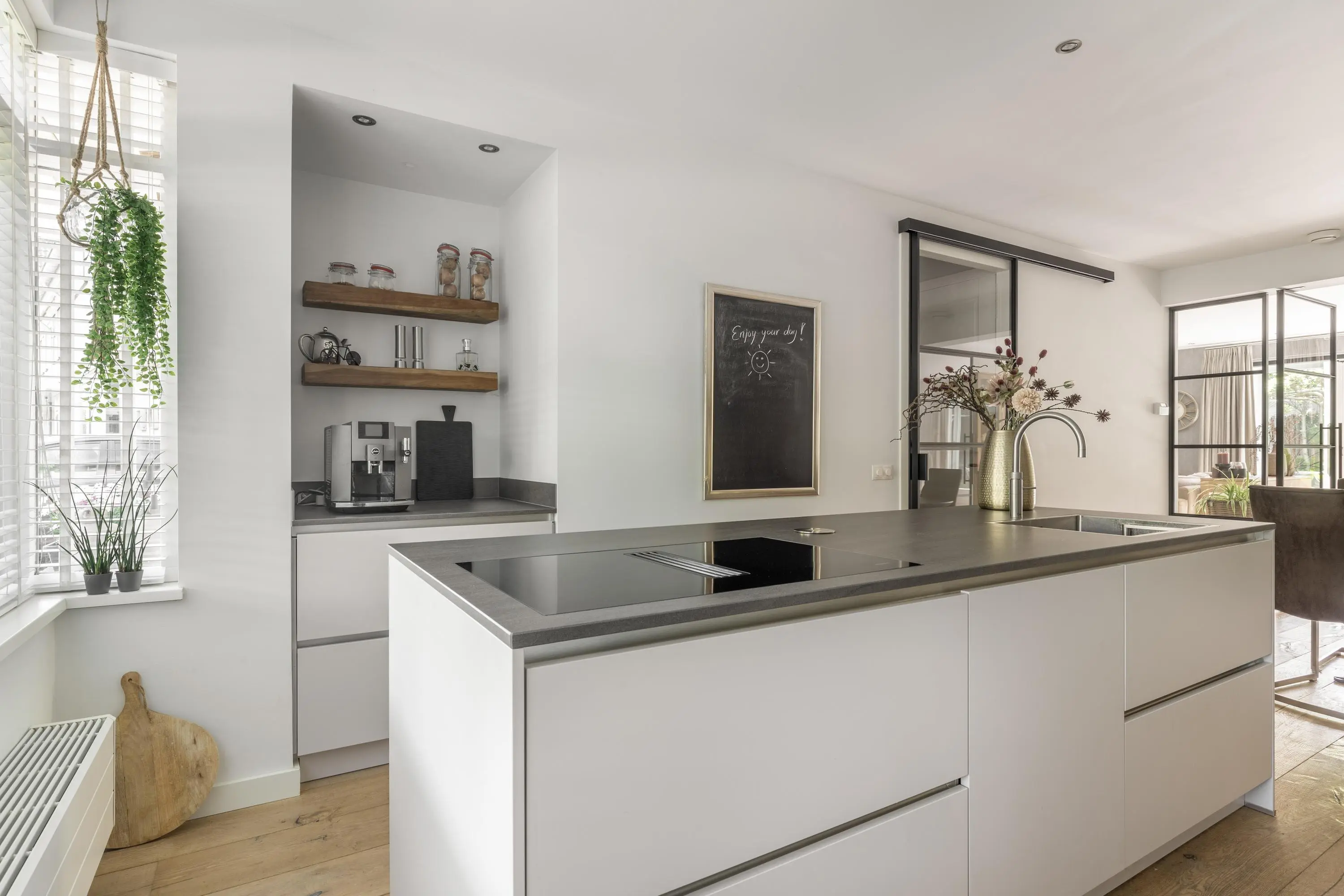 De stijlvolle glazen deuren verbinden de keuken met de tuingerichte woonkamer. Dankzij de grote raampartijen en openslaande deuren naar de tuin is de woonkamer heerlijk licht. De gashaard zorgt voor extra sfeer en warmte.
