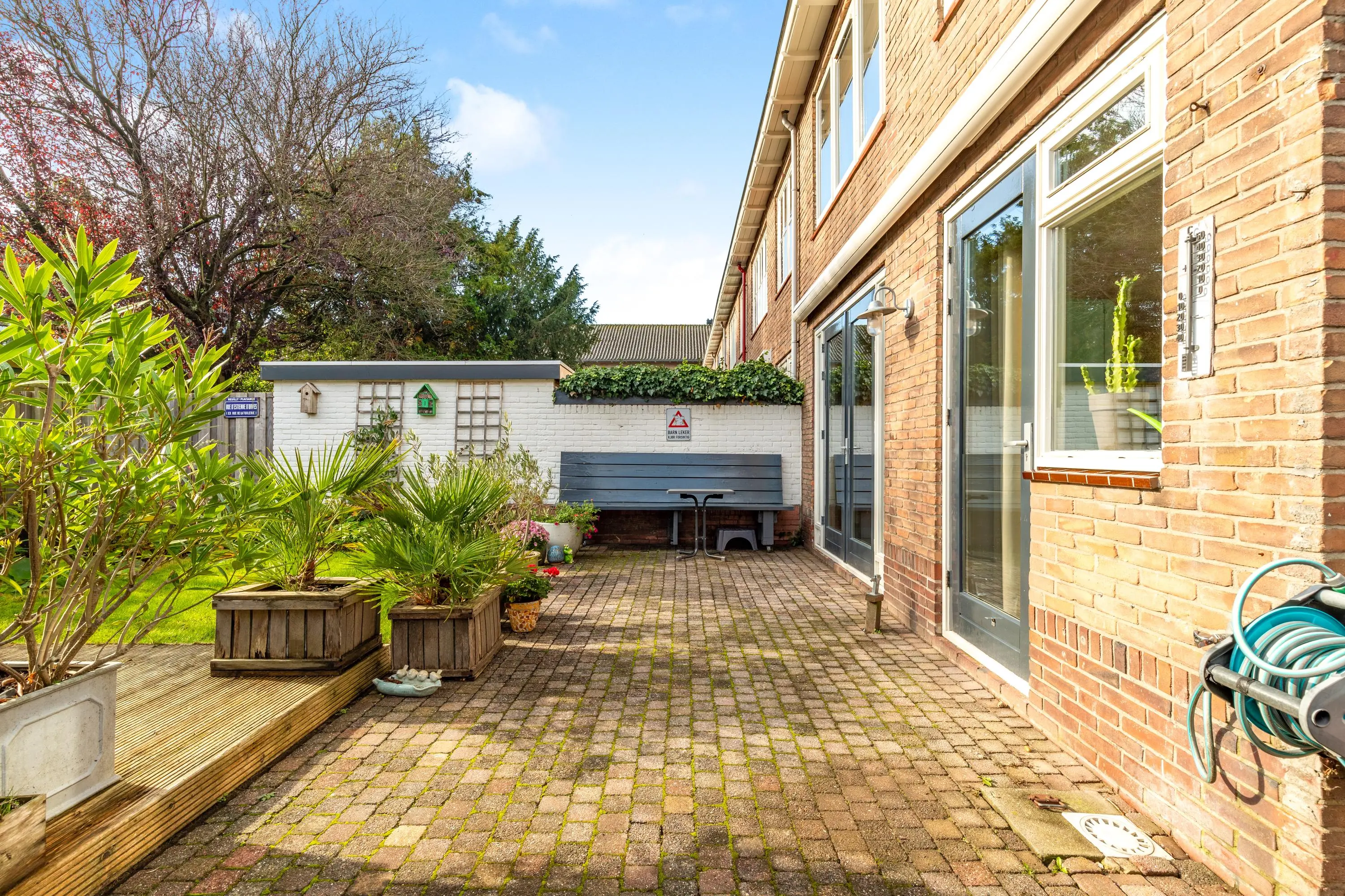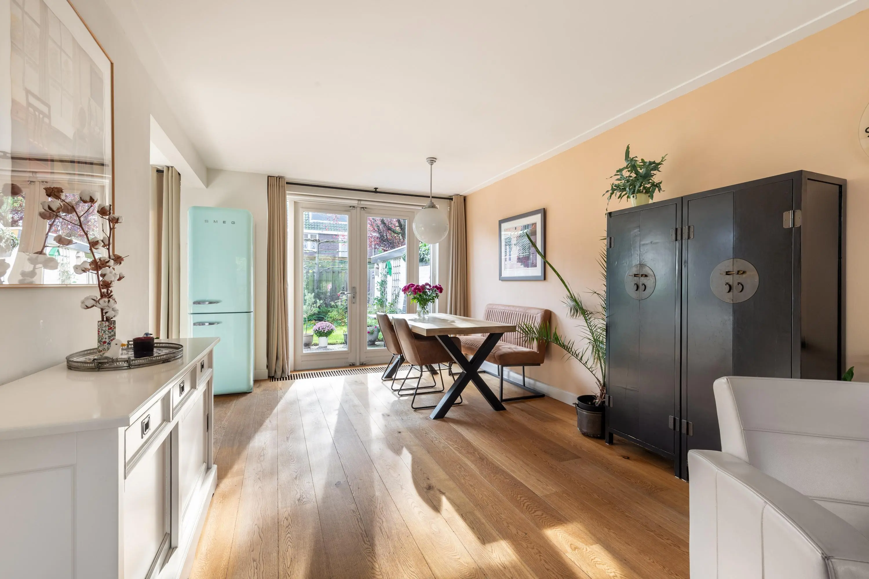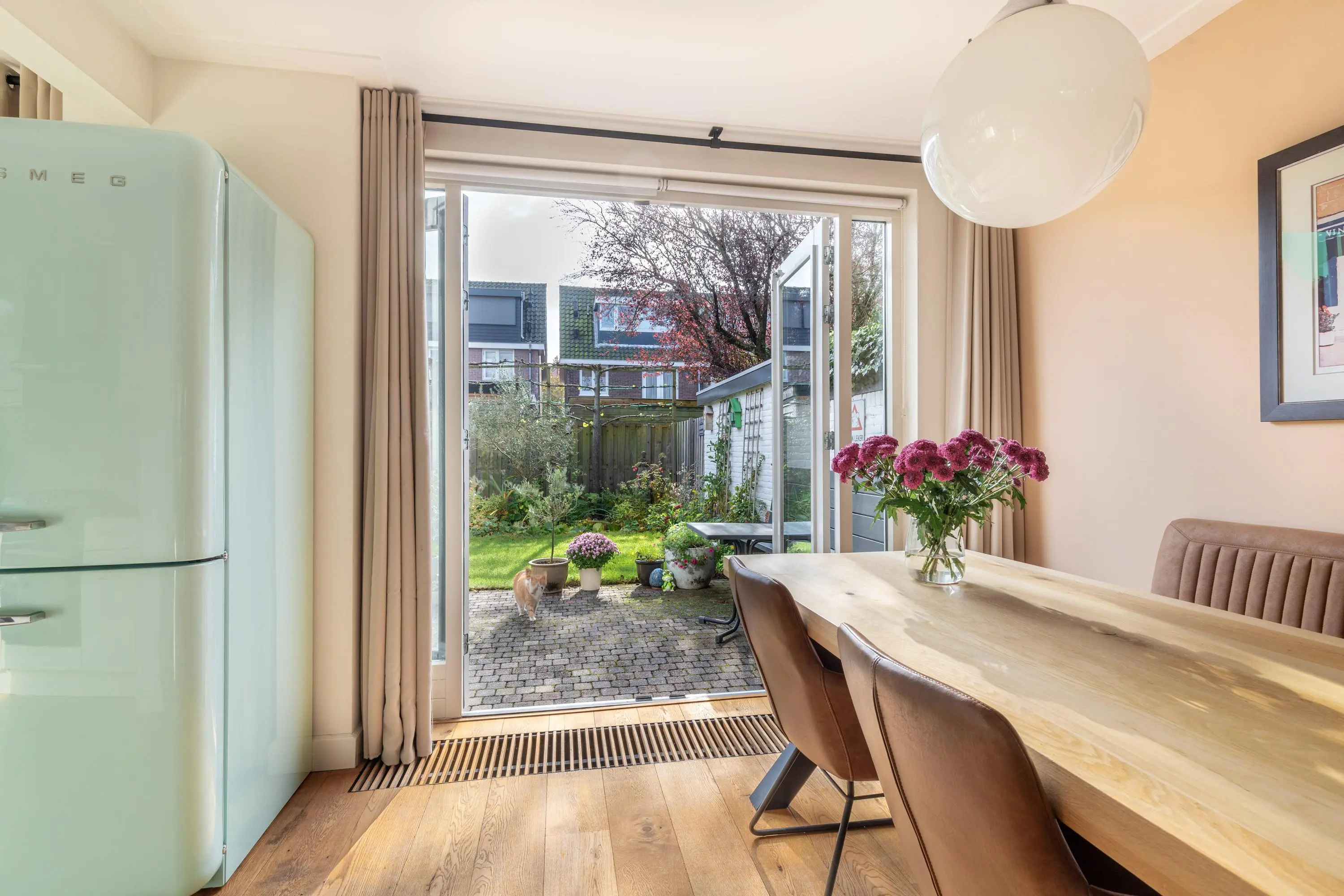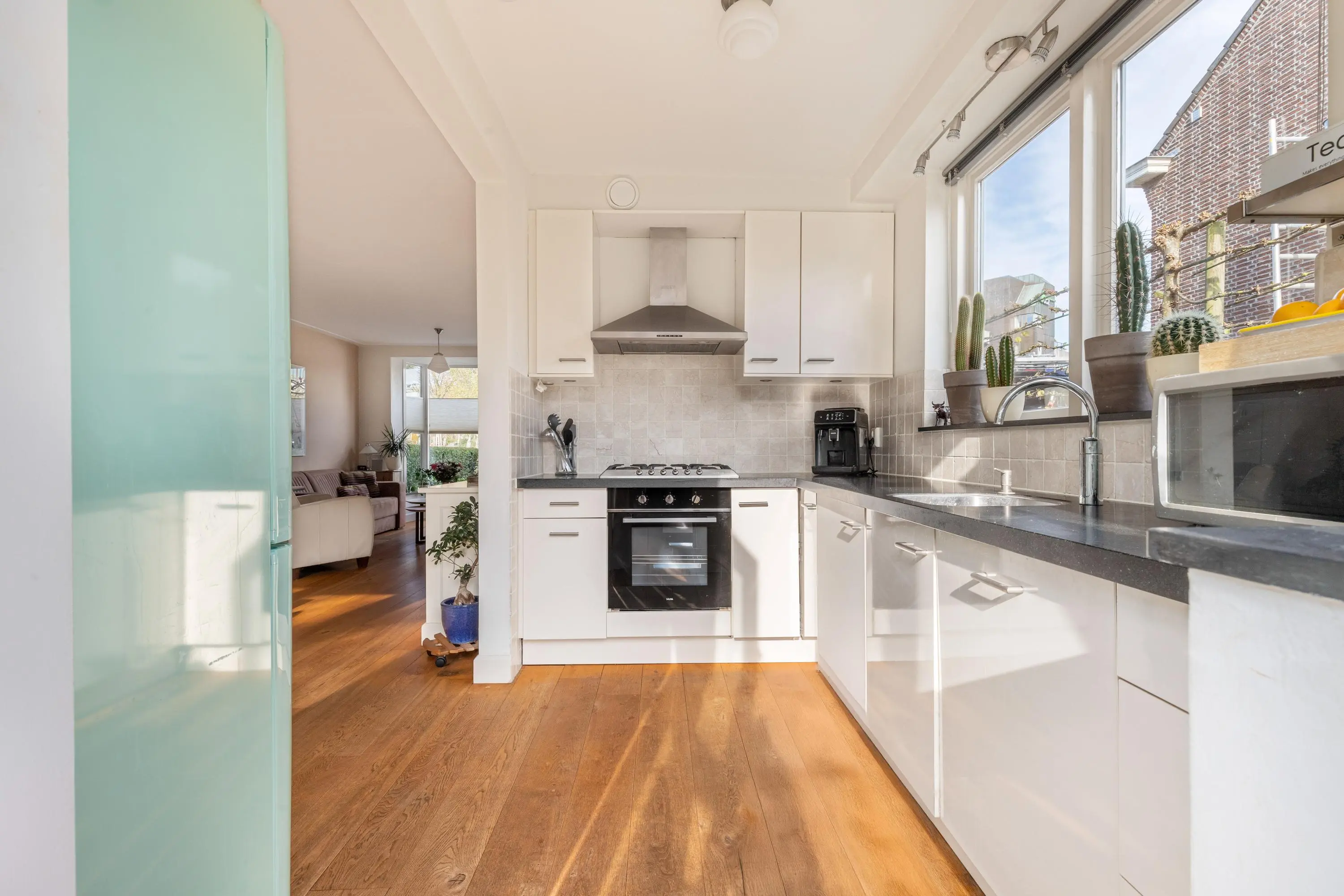 Indeling: prachtig zij-entree met fraaie hal, trap-/kelderkast, toiletruimte v.z.v. luxe tegelwerk en sanitair (glasmozaïek en wandcloset), heerlijke ruime living met erker, openslaande tuindeuren en een open verbinding met de keuken. De achtertuin is verzorgd aangelegd en biedt u alle privacy. De berging met gezellige veranda heeft een pannendak, waardoor er extra bergruimte ontstaat.