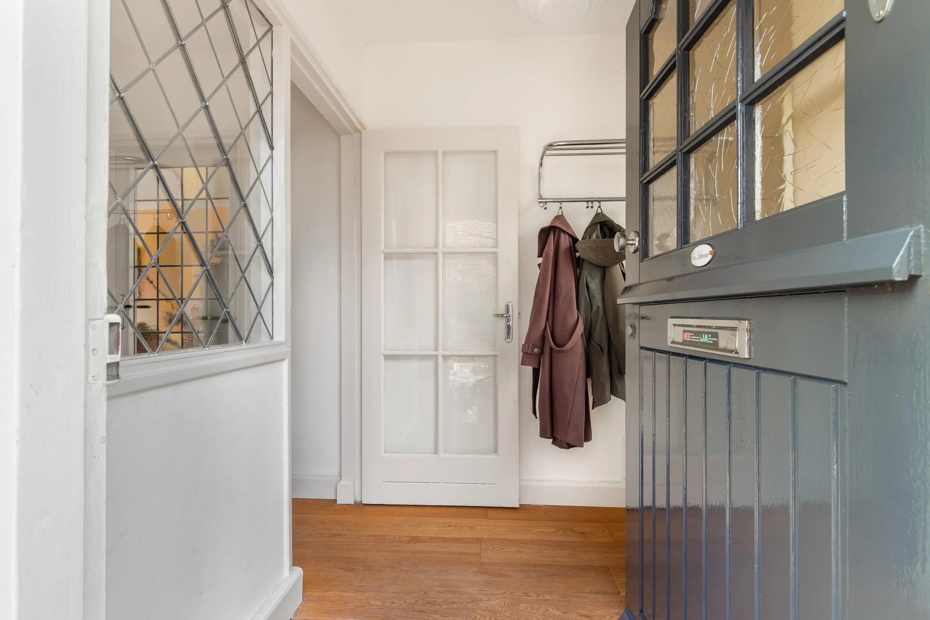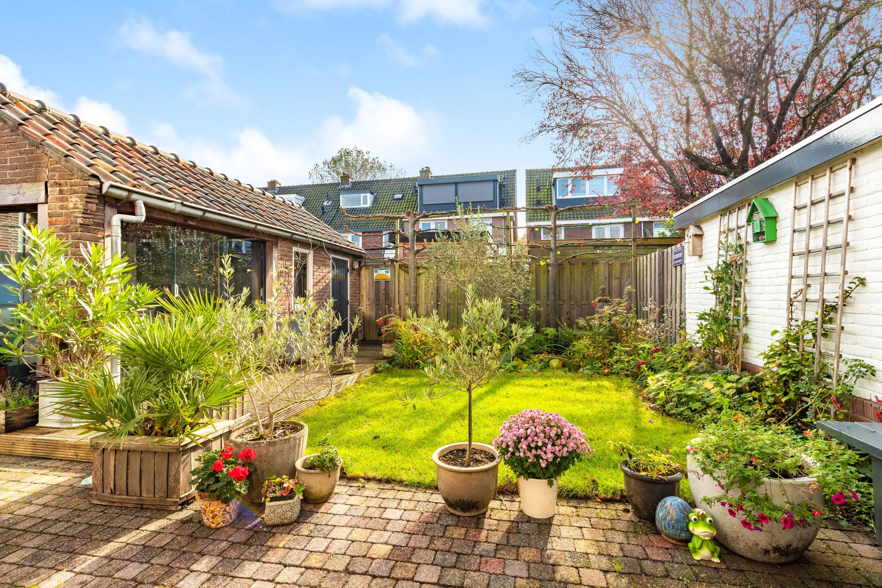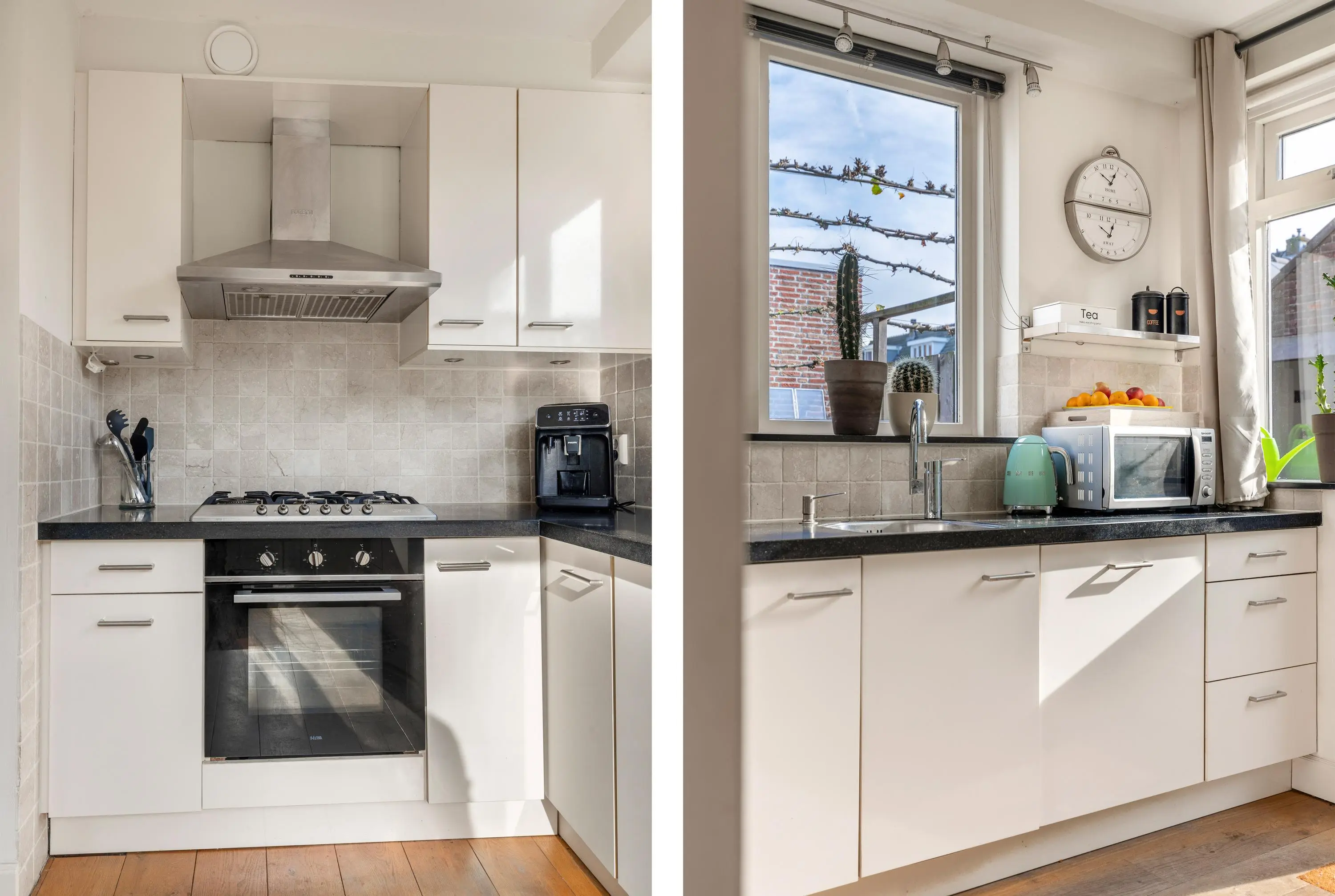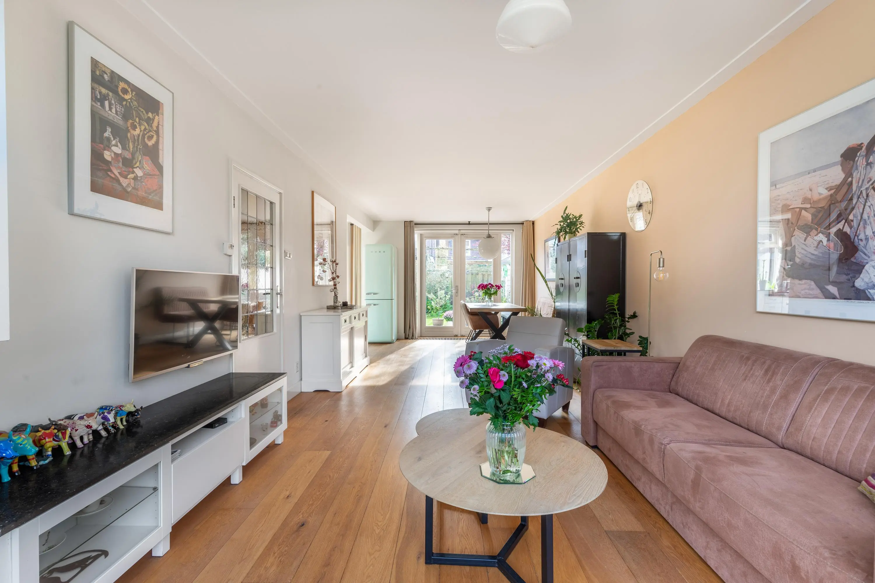 Indeling: prachtig zij-entree met fraaie hal, trap-/kelderkast, toiletruimte v.z.v. luxe tegelwerk en sanitair (glasmozaïek en wandcloset), heerlijke ruime living met erker, openslaande tuindeuren en een open verbinding met de keuken. De achtertuin is verzorgd aangelegd en biedt u alle privacy. De berging met gezellige veranda heeft een pannendak, waardoor er extra bergruimte ontstaat.