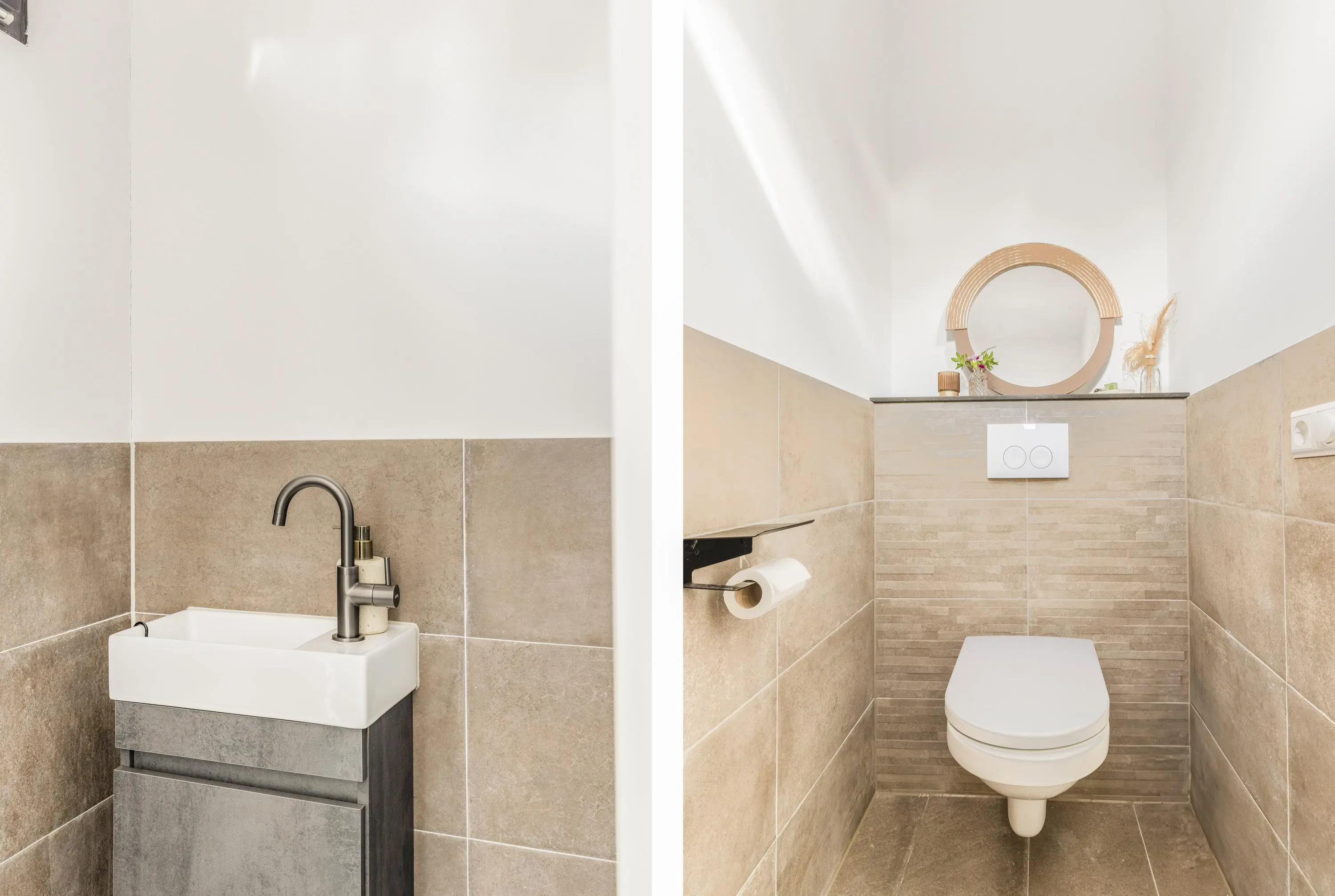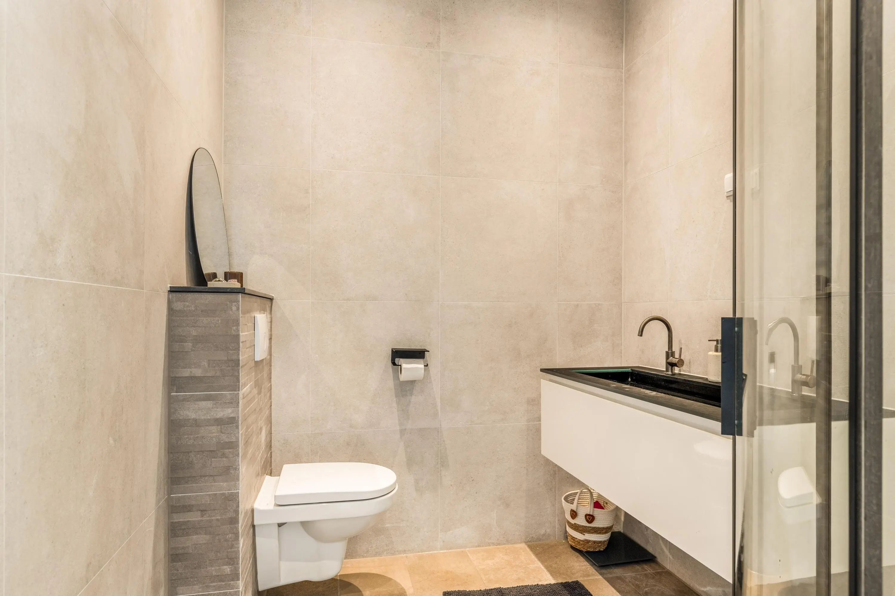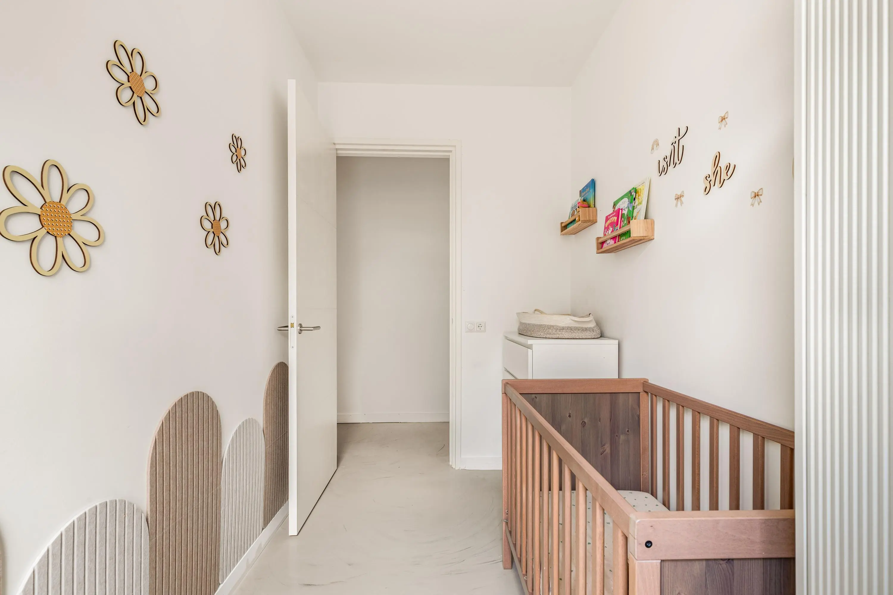 De lange hal brengt je naar de overige vertrekken van de woning. De woning beschikt over drie slaapkamers, waarvan er eenvoudig twee samengevoegd kunnen worden tot één extra ruime kamer – ideaal voor wie meer leefruimte wil creëren. Daarnaast is er een praktische werkkamer die tevens dienst kan doen als berging of thuiskantoor, met aansluitingen voor wasmachine en hier is ook de afgesloten stookruimte. De badkamer is modern ingericht en voorzien van een douche, wastafel en tweede toilet.