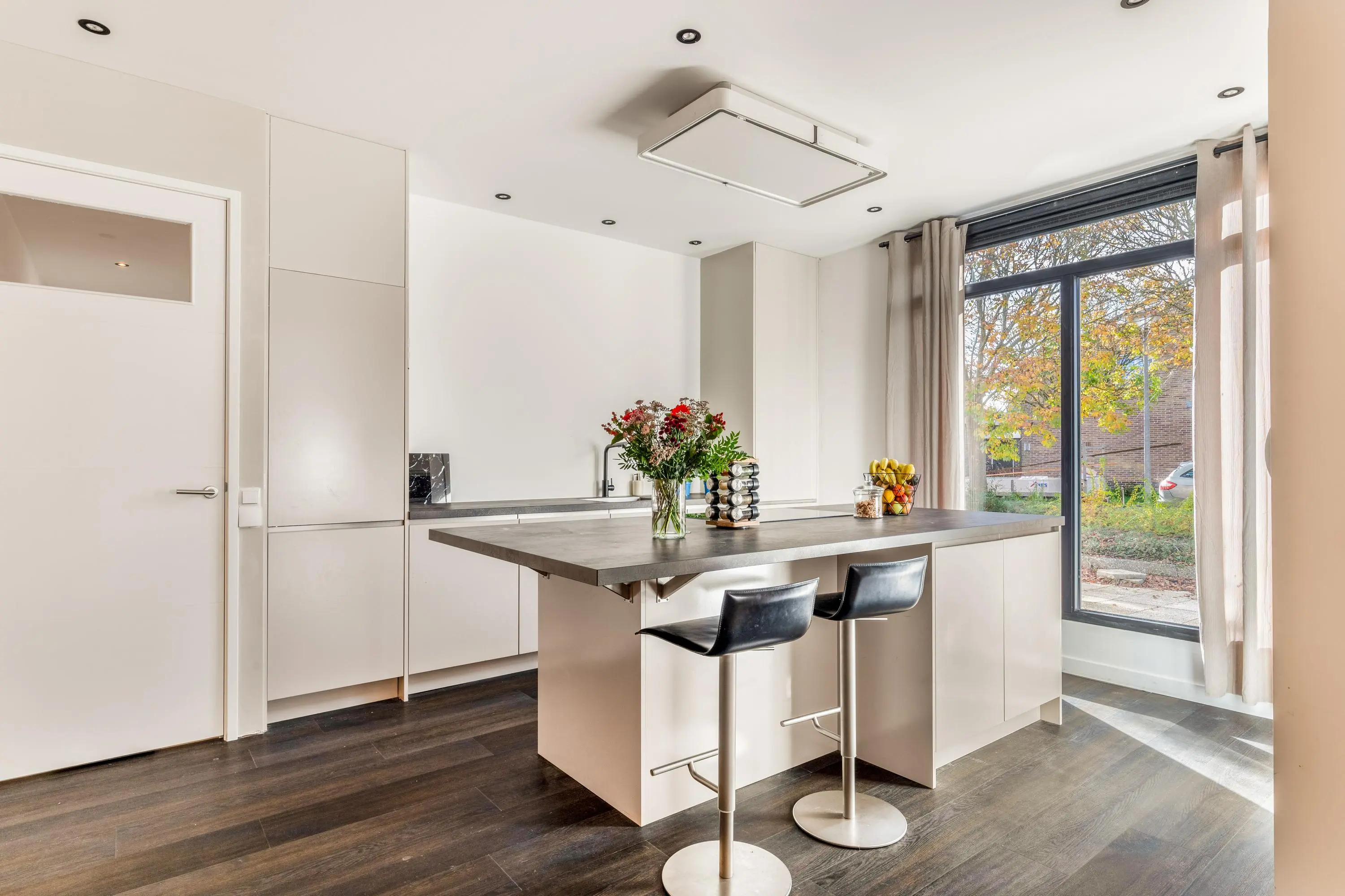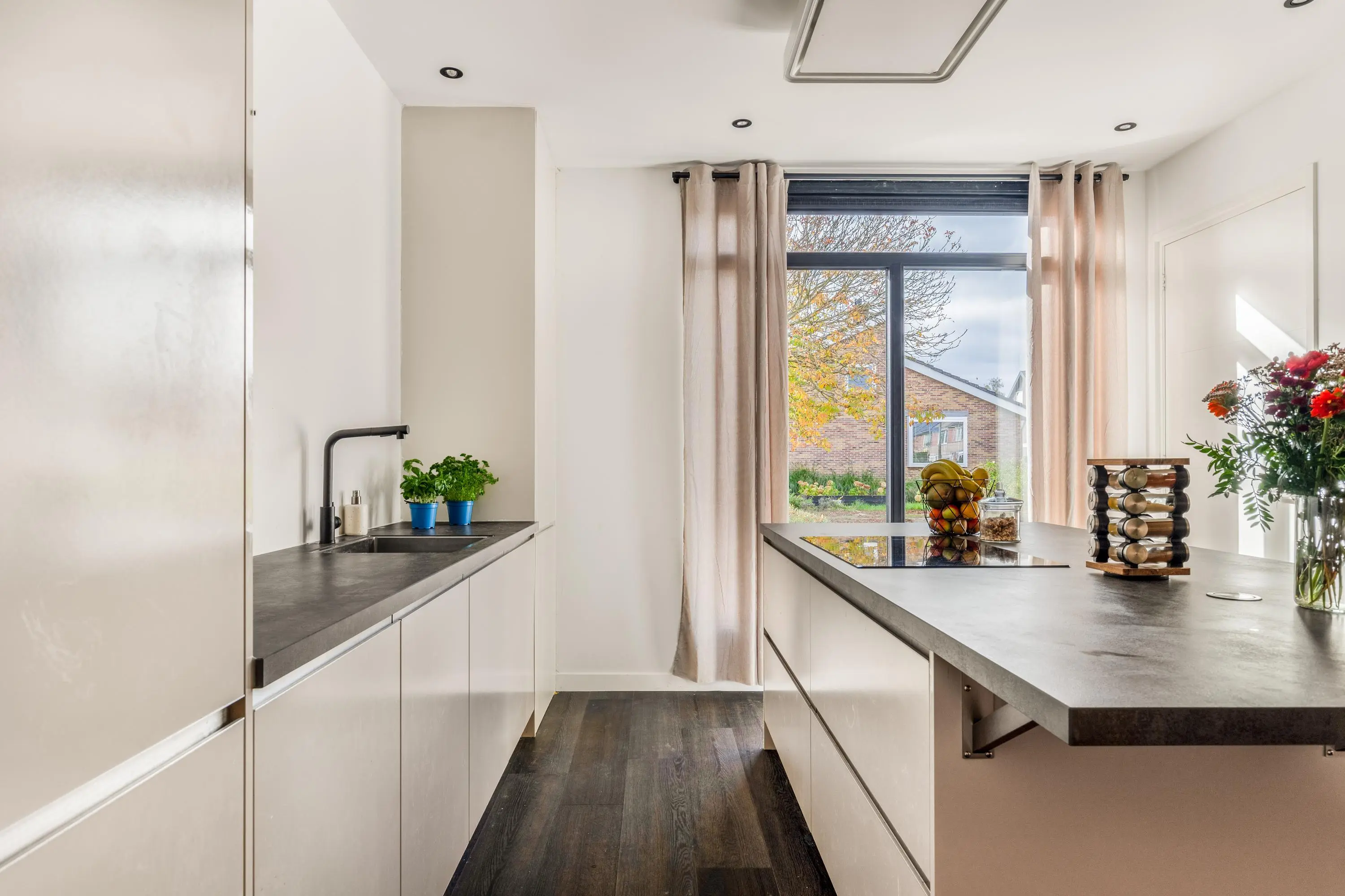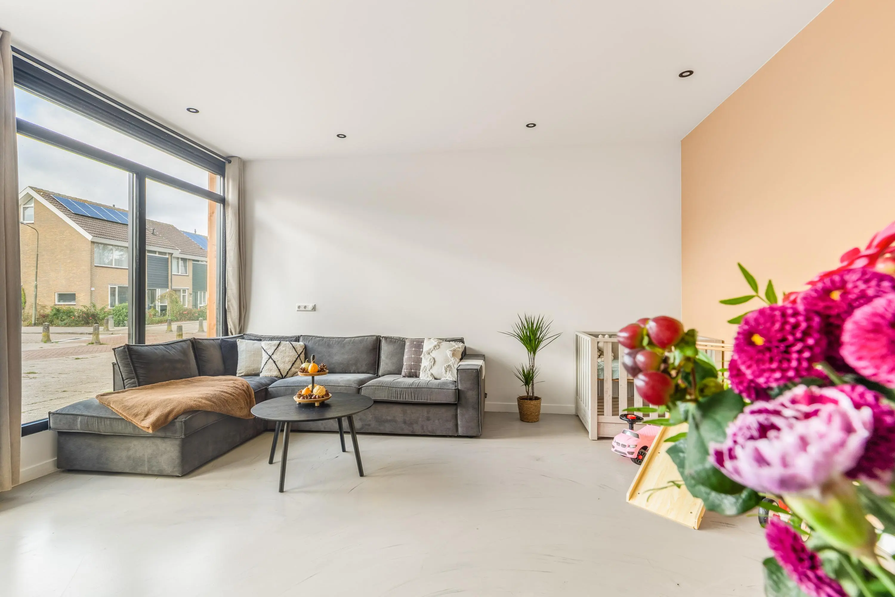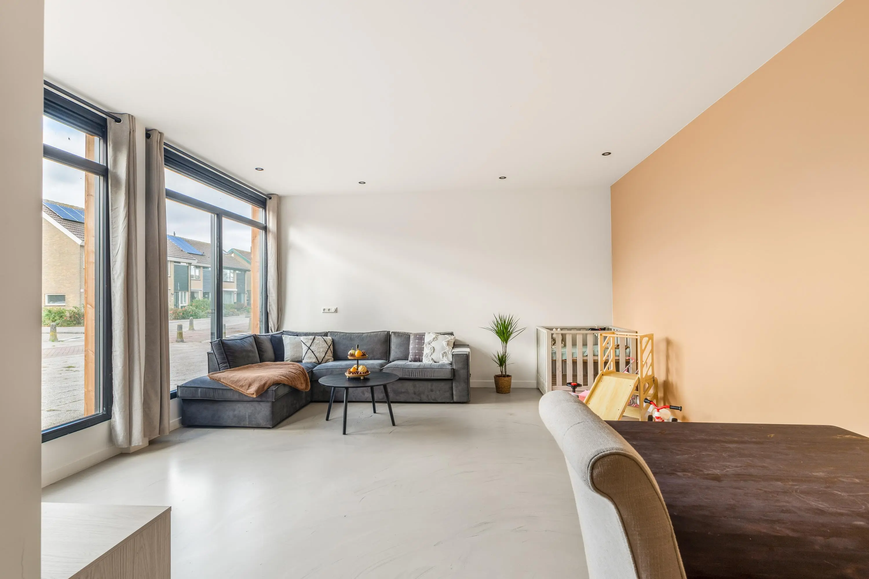 Dankzij de grote ramen geniet je in elke ruimte van een fijne lichtinval en een vrij gevoel. Alles is afgewerkt in een moderne stijl en direct klaar om te betrekken. Door de gehele woning ligt een grijs gemêleerde gietvloer. Goed om te weten is dat er een vergunning is afgegeven voor het realiseren van een dakterras.