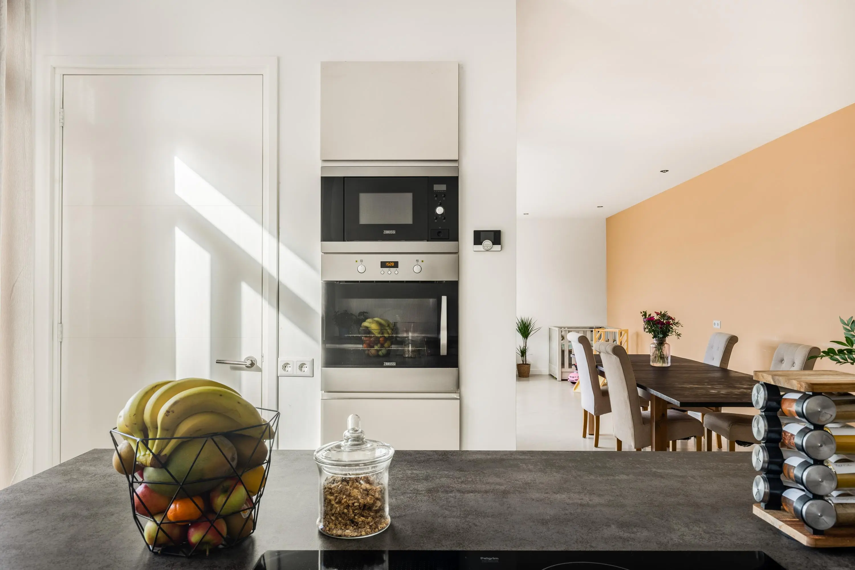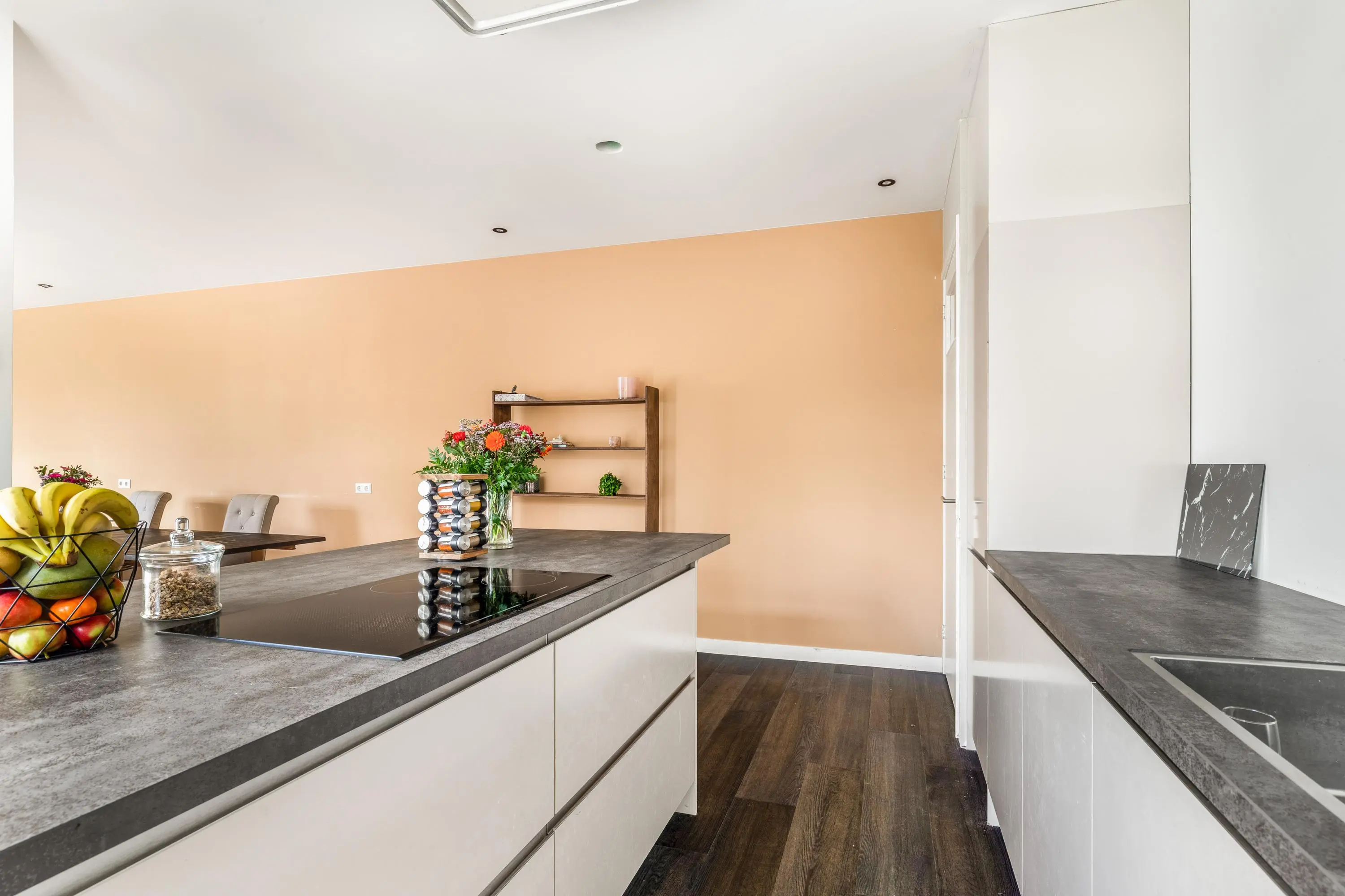 Je betreed de woning via de hal met hier het toilet en ruimte voor de garderobe en de meterkast. De deur brengt je binnen in de woning met aan deze zijde keuken welke een echte blikvanger is, met een modern kookeiland. De keuken grenst aan de eetkamer, waardoor koken en gezellig samenzijn hier moeiteloos samengaan. De woonkamer is riant van opzet en dankzij de vele raampartijen heb je hier een overvloed aan daglicht.