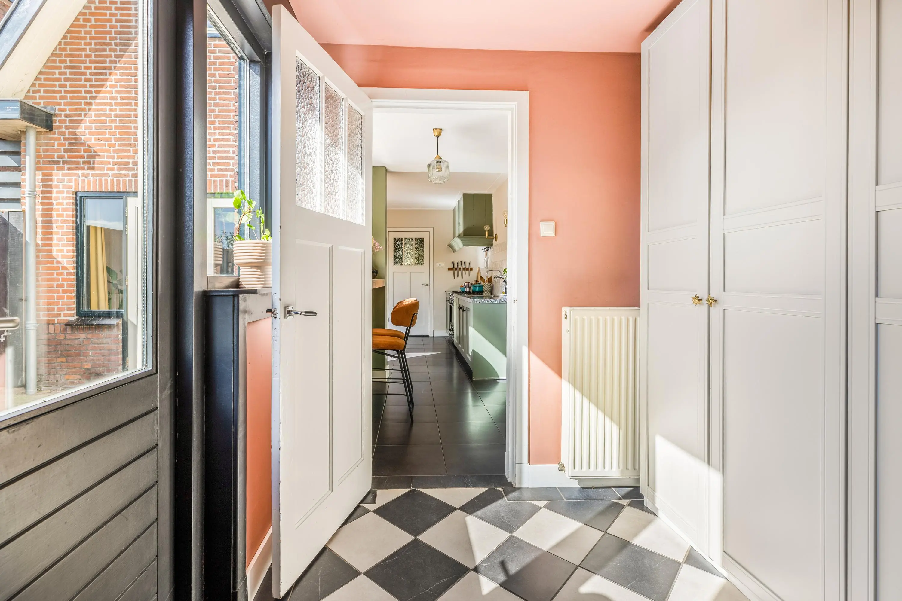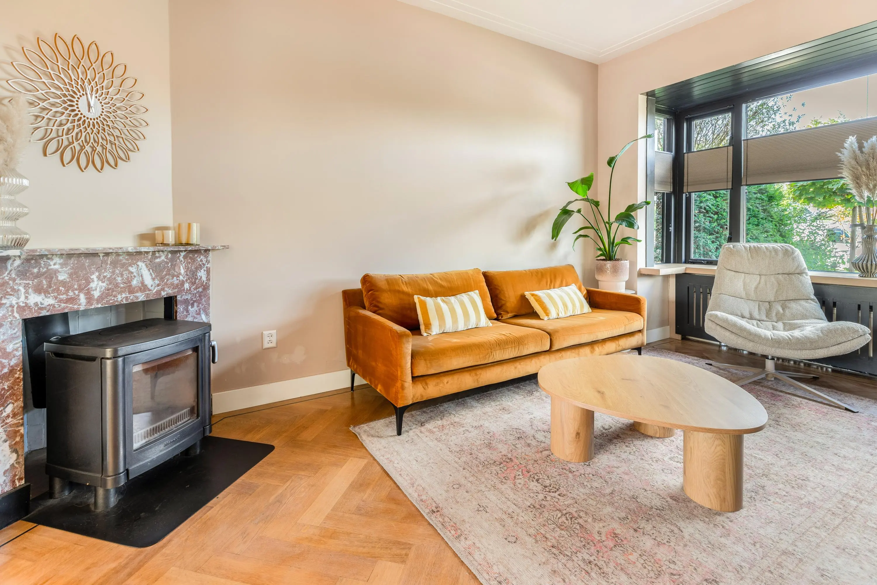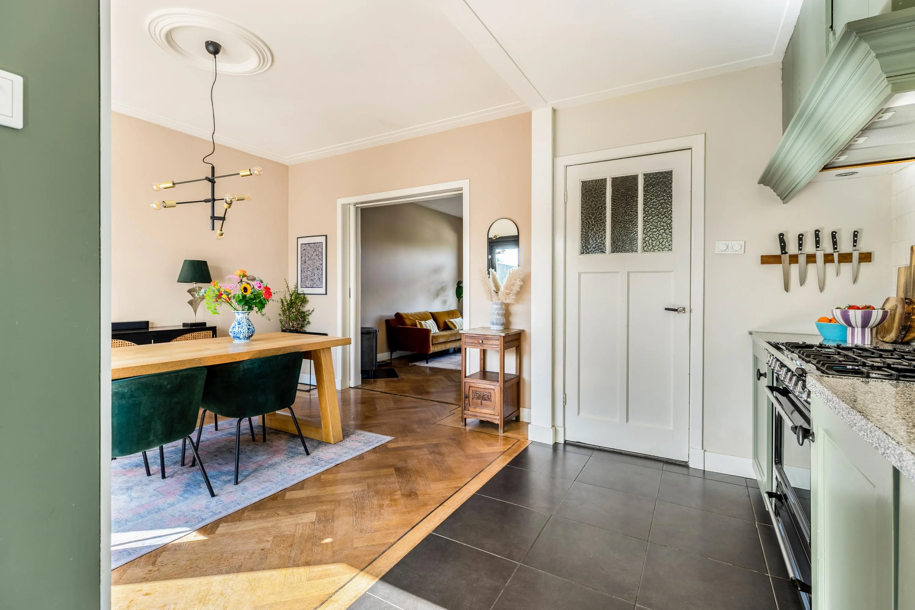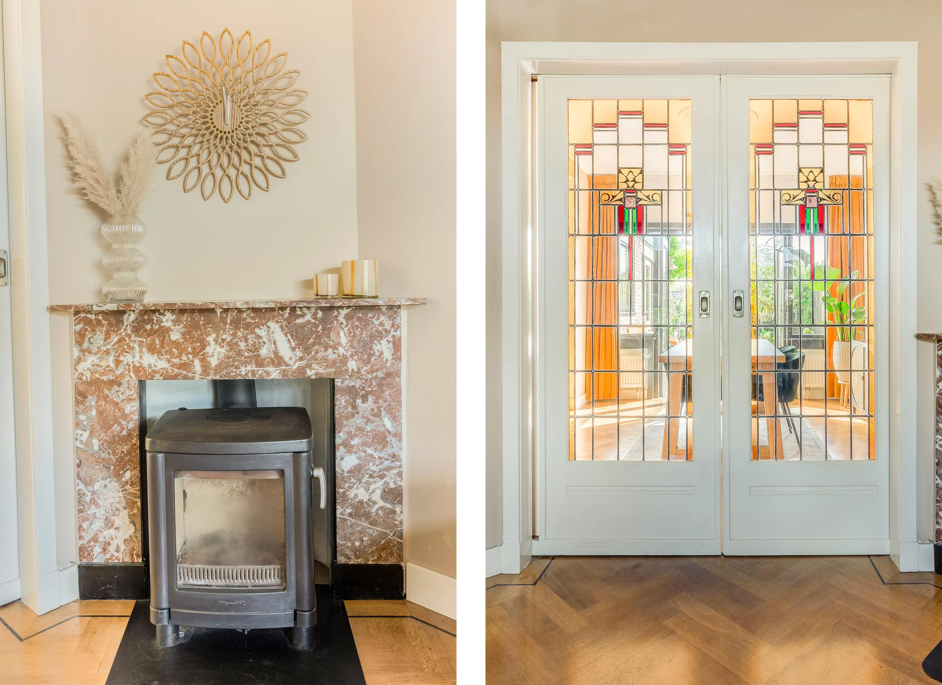 Bij binnenkomst in de woning val je direct in de karaktervolle details; prachtige glas in lood deuren die de voorhal van de gang scheiden. In de gang bevinden zich het toilet en de meterkast. Vervolgens kom je in de woonkamer die dankzij de uitbouw heerlijk ruim aanvoelt. De lichte woonkamer met erker en houtkachel ademt sfeer, terwijl de openslaande deuren naar de tuin zorgen voor een fijne verbinding met buiten. De keuken is een echte blikvanger: luxe uitgevoerd, praktisch ingedeeld en voorzien van inbouwapparatuur zoals koel-vries combinatie, een combi-oven en voor de liefhebber staat er zelfs een SMEG-fornuis! Aangrenzend vind je een praktische open bijkeuken met toegang tot de tuin.