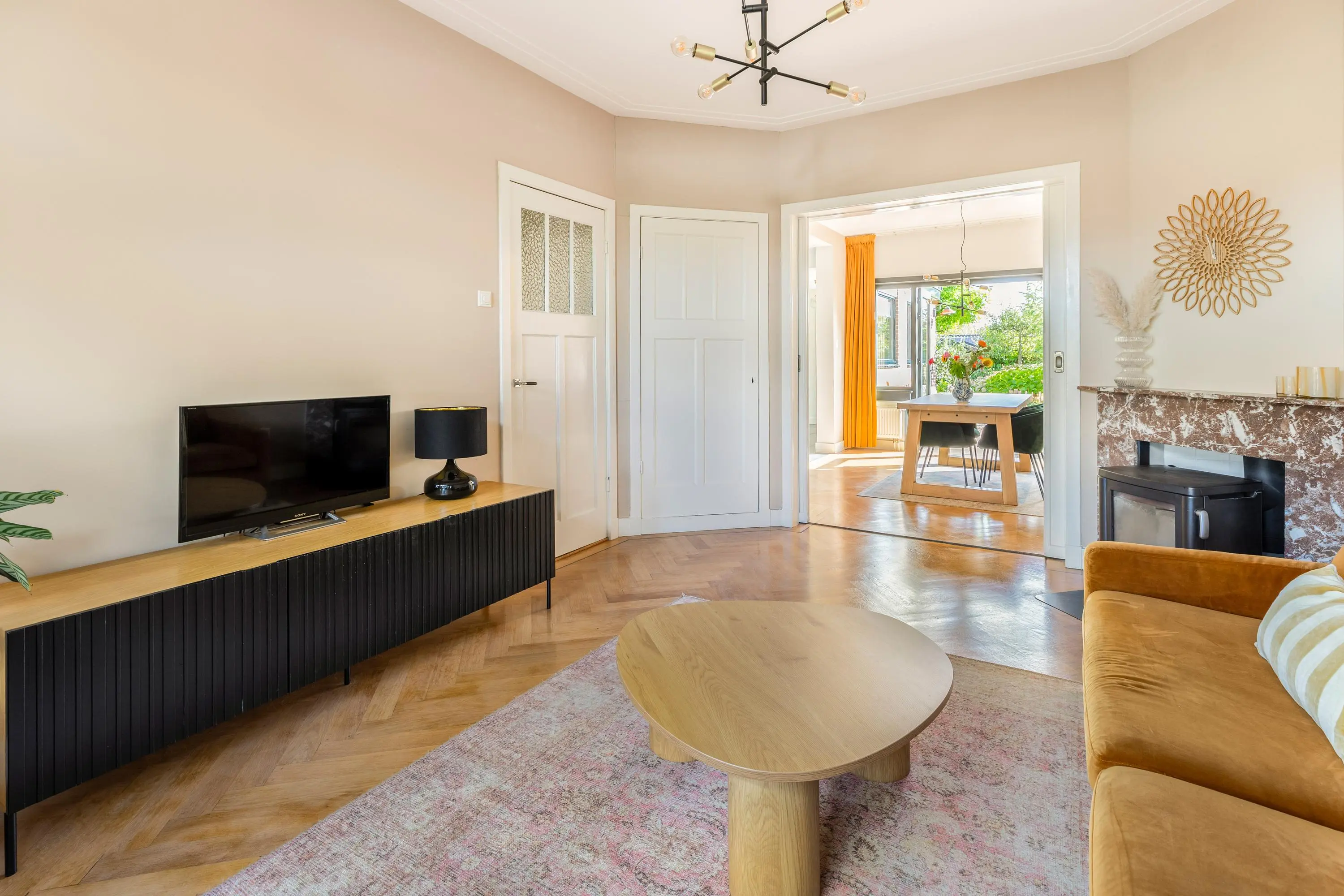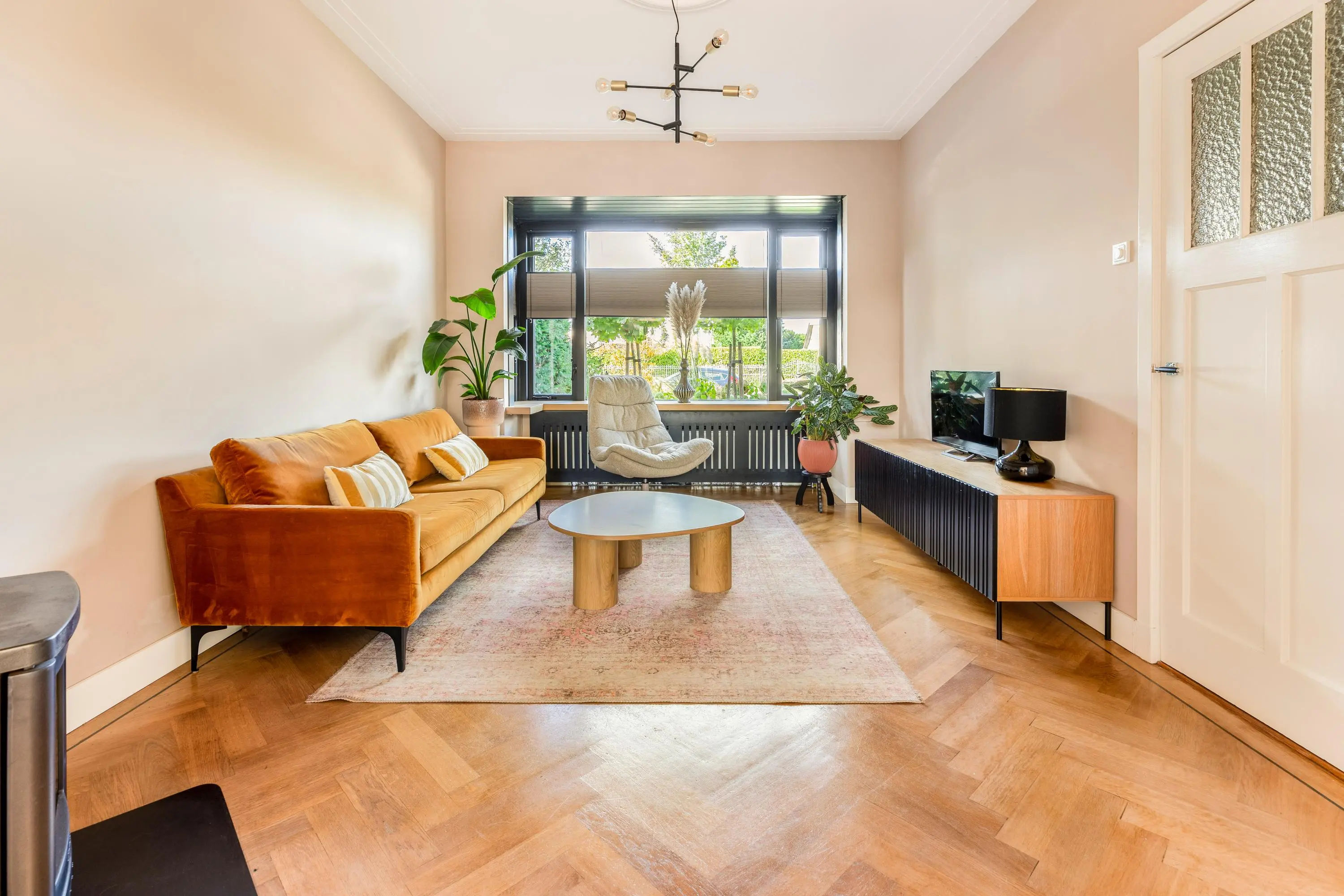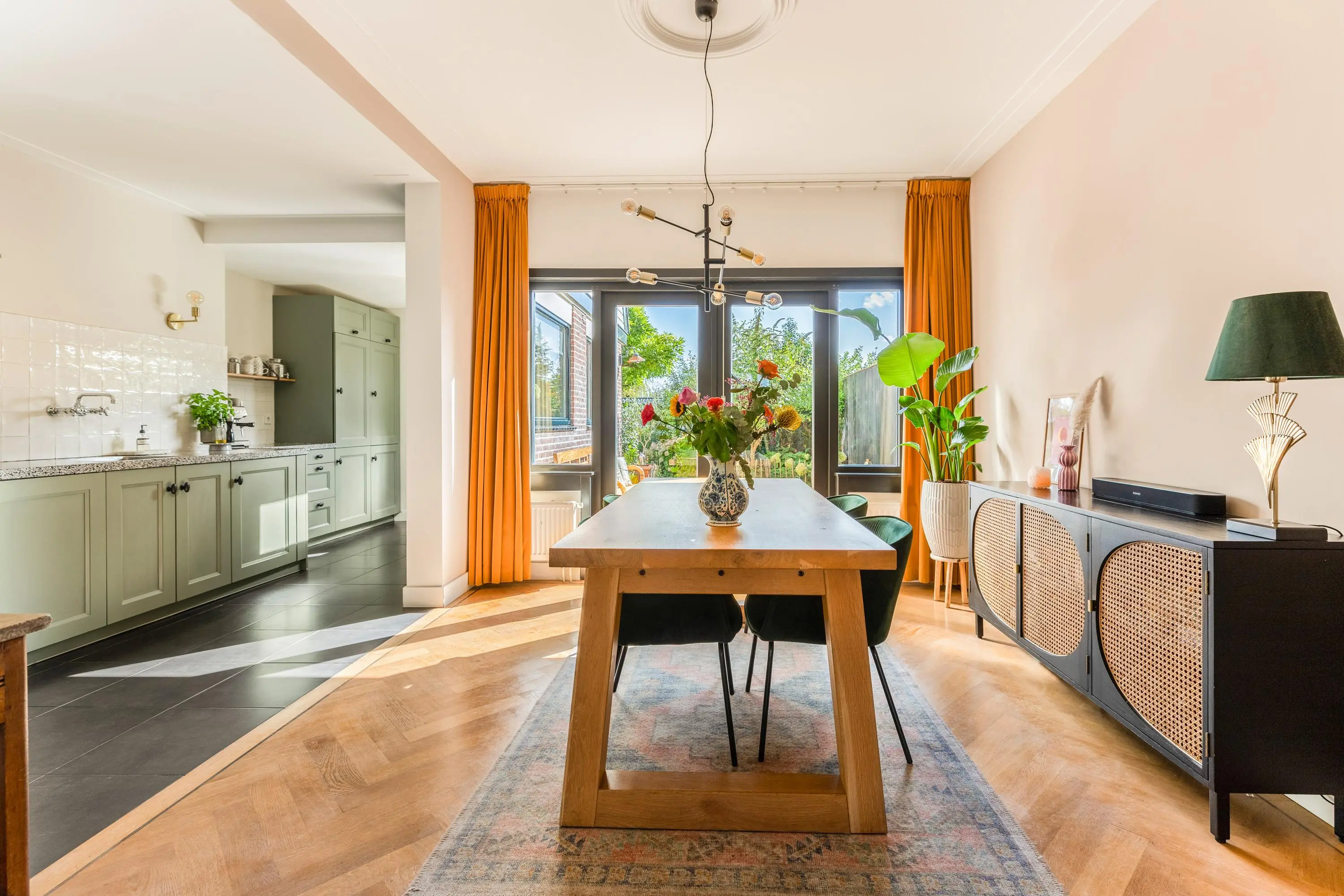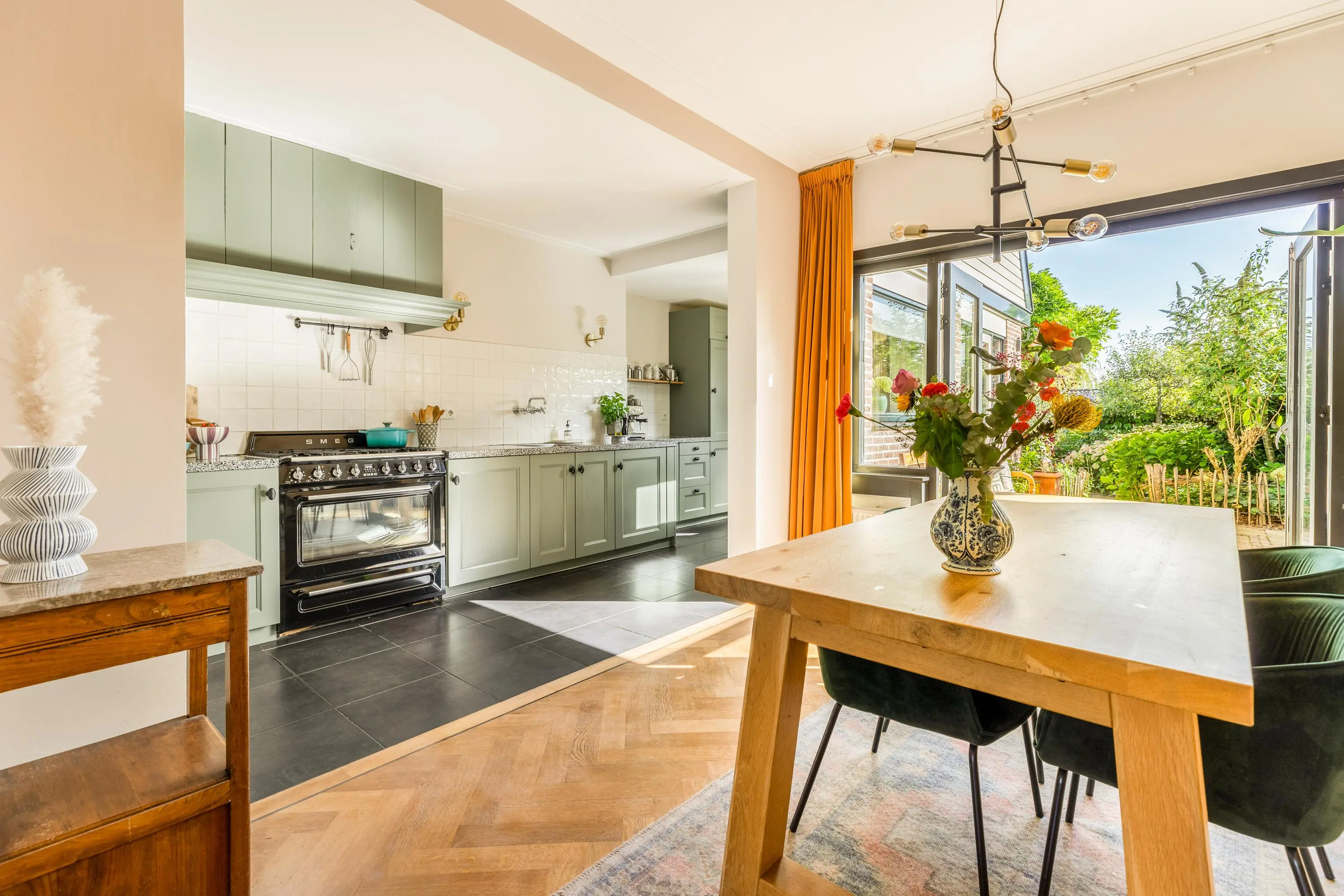 Bij binnenkomst in de woning val je direct in de karaktervolle details; prachtige glas in lood deuren die de voorhal van de gang scheiden. In de gang bevinden zich het toilet en de meterkast. Vervolgens kom je in de woonkamer die dankzij de uitbouw heerlijk ruim aanvoelt. De lichte woonkamer met erker en houtkachel ademt sfeer, terwijl de openslaande deuren naar de tuin zorgen voor een fijne verbinding met buiten. De keuken is een echte blikvanger: luxe uitgevoerd, praktisch ingedeeld en voorzien van inbouwapparatuur zoals koel-vries combinatie, een combi-oven en voor de liefhebber staat er zelfs een SMEG-fornuis! Aangrenzend vind je een praktische open bijkeuken met toegang tot de tuin.