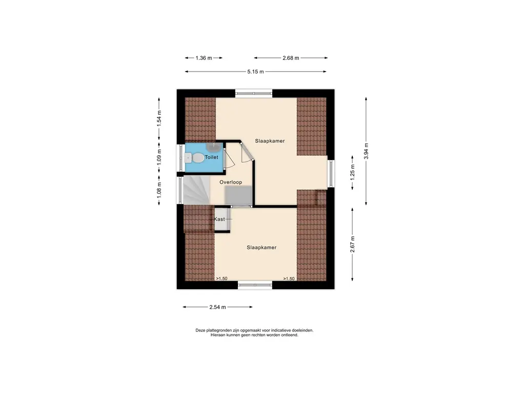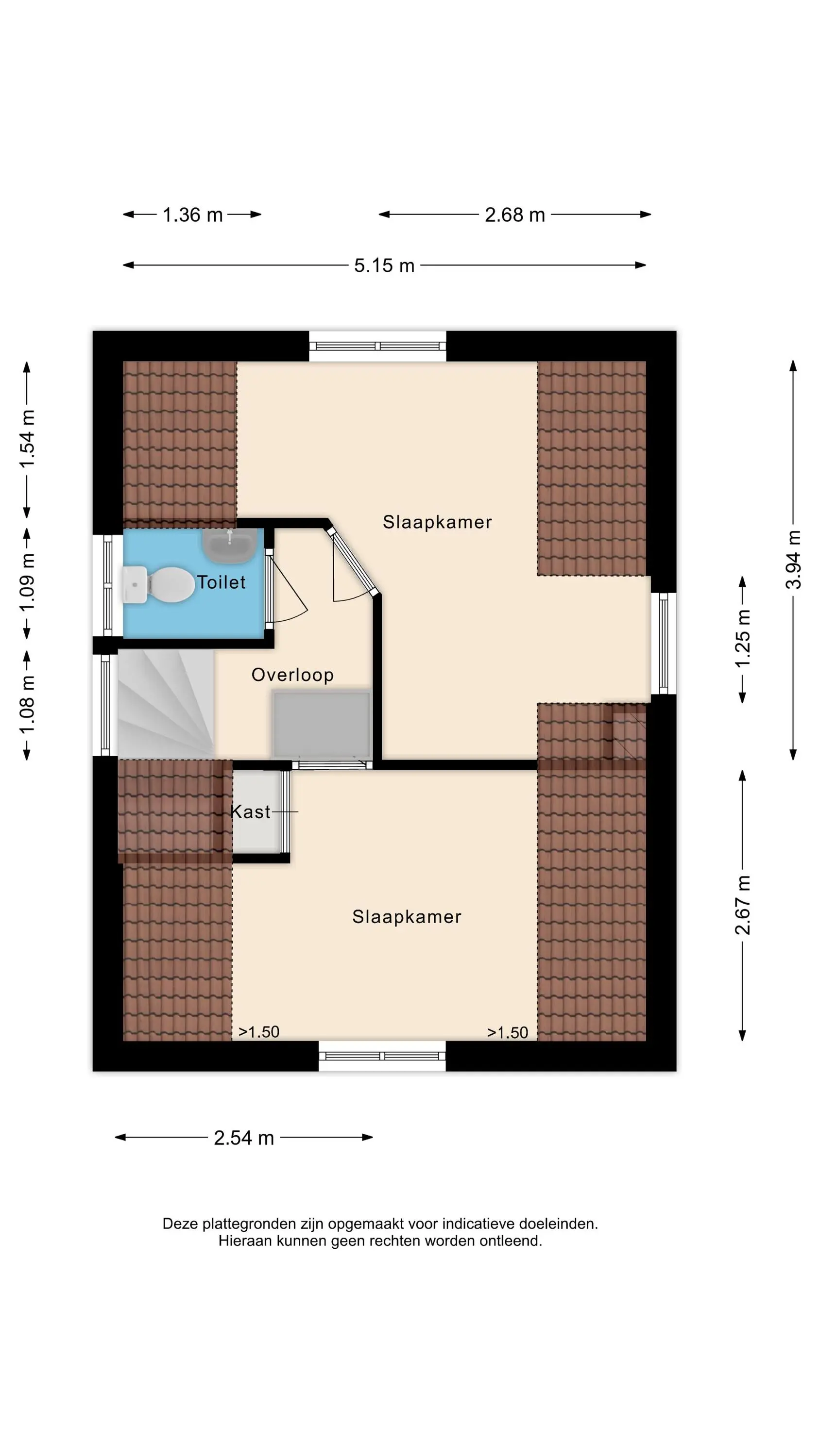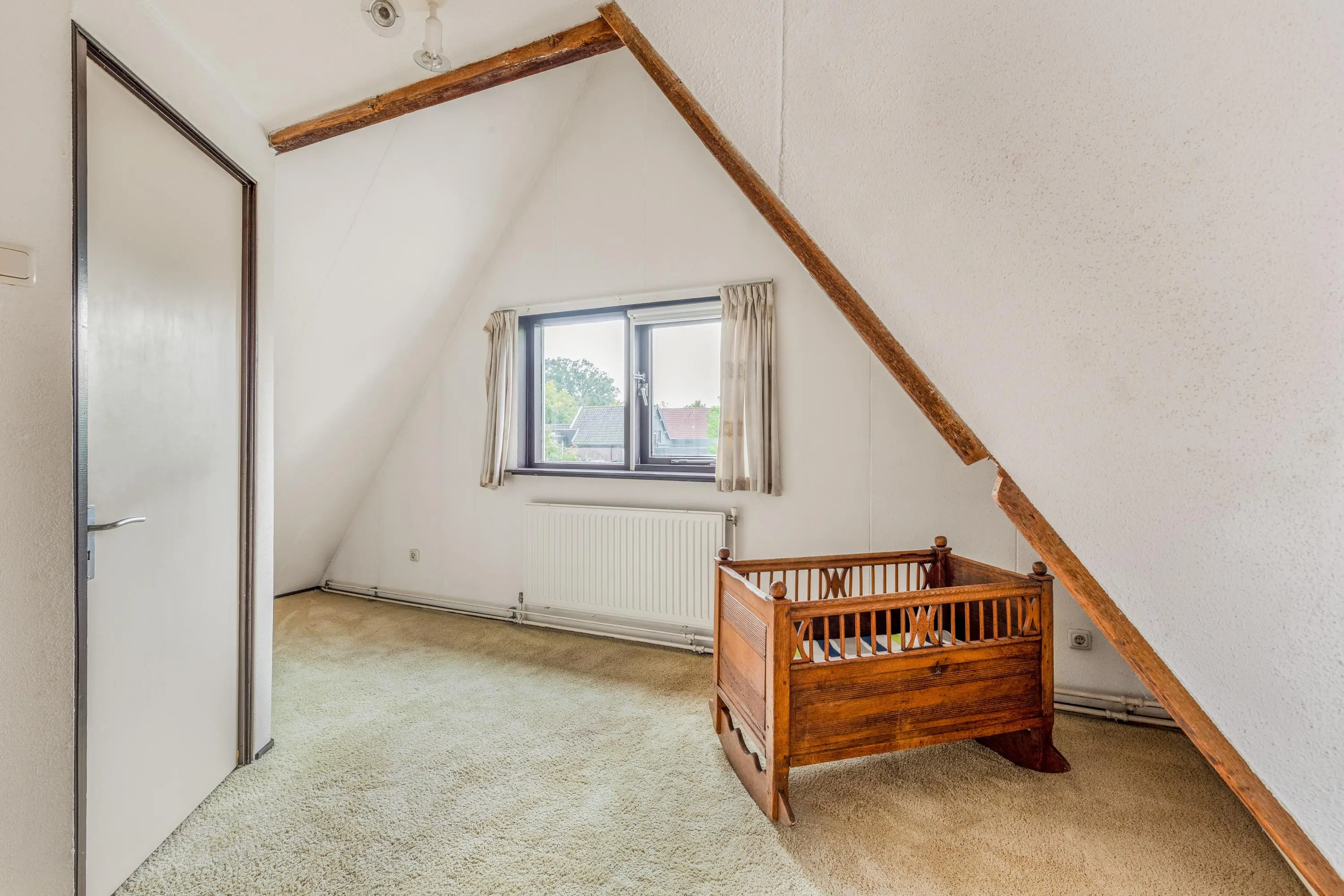 Bij de voordeur bevindt zich de trap naar de eerste verdieping. Hier zijn twee goede en ruime slaapkamers aanwezig, evenals een apart toilet met wastafel. Verder is er een ruime vliering die veel bergruimte biedt.