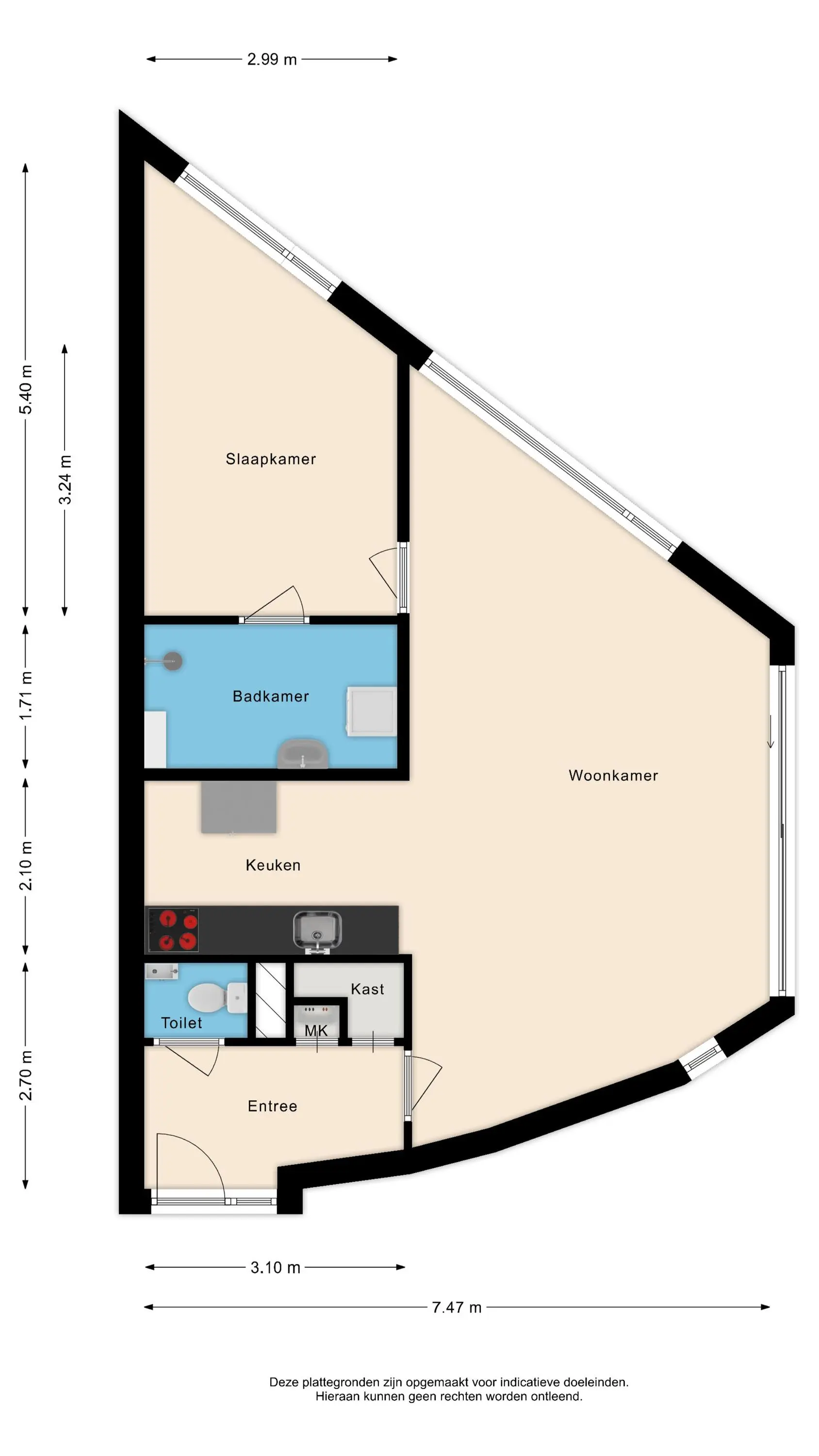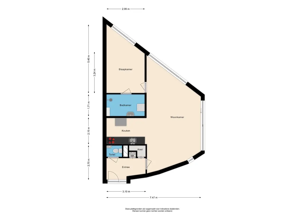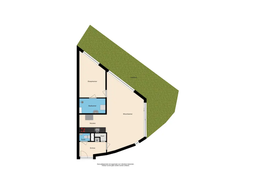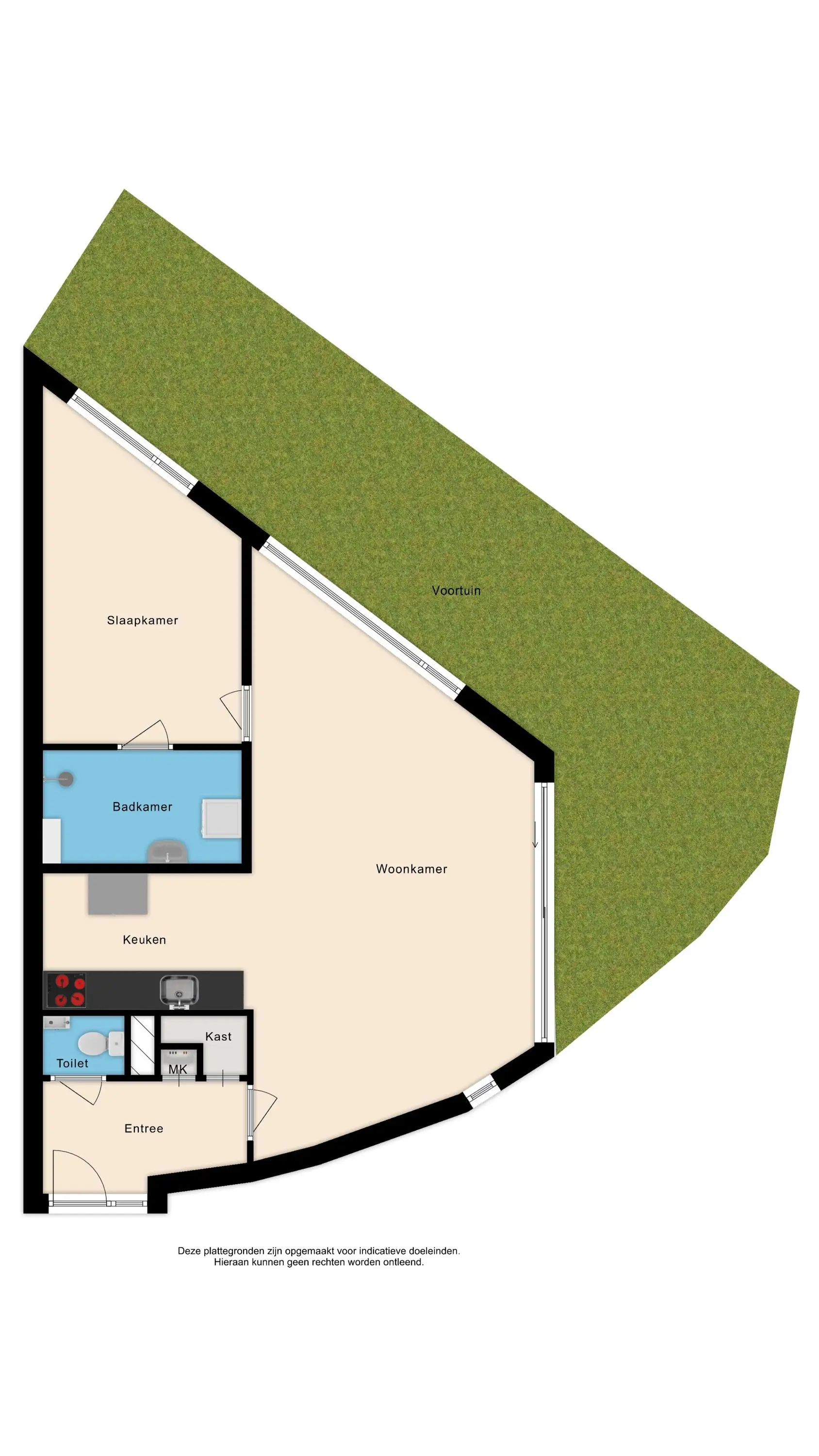 Bij de entree van het complex is het bellentableau te vinden met de brievenbussen. En vanuit de entree bereik je zo het appartement. Hier kom je binnen in de hal met ruimte voor de garderobe, het toilet een bergruimte en toegang tot de woonkamer. De woonkamer is ligt dankzij de vele raampartijen. De speelse indeling zorgt ervoor dat je meerdere kanten op kunt met de inrichting. De open keuken is voorzien van een keukenblok, zonder inbouwapparatuur. Het grote voordeel van dit appartement is dat het gelegen is op de begane grond en dat je daardoor beschikt over een eigen tuintje. Deze is gelegen op het oosten, dus heerlijk 's ochtends met een kopje koffie in de tuin! De slaapkamer grenst aan de badkamer met hier de aansluitingen van de wasmachine, droger, de douche en wastafel.