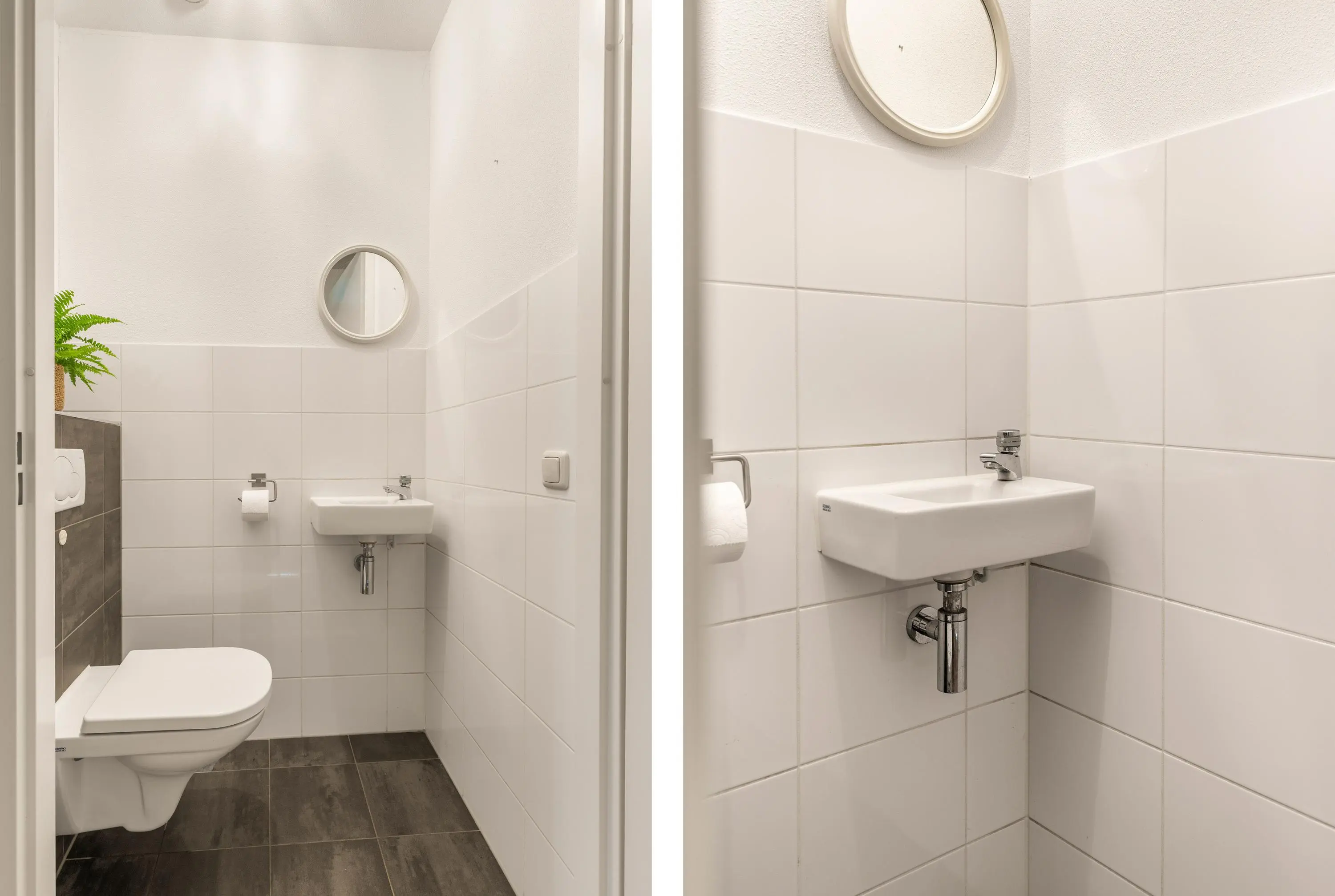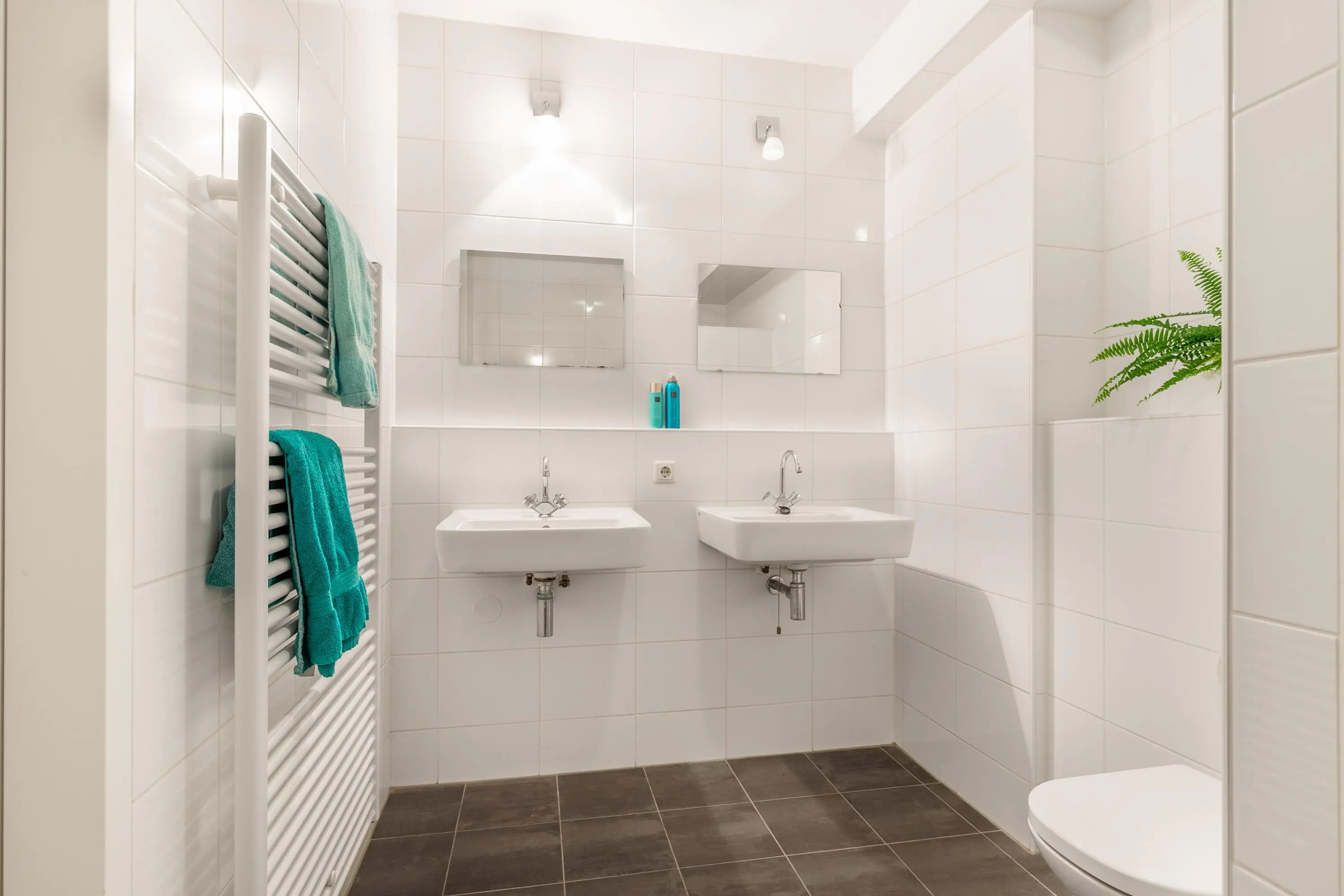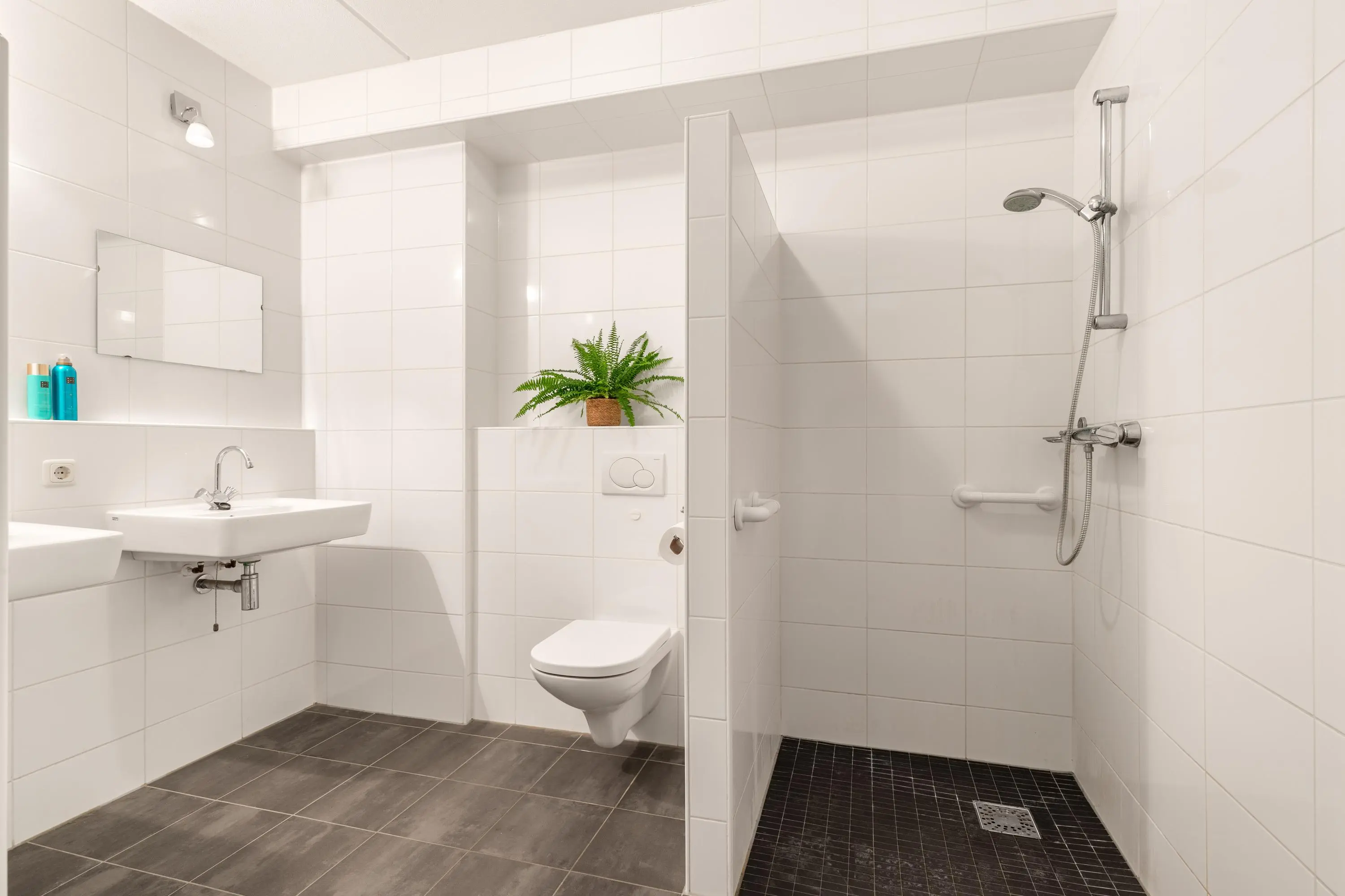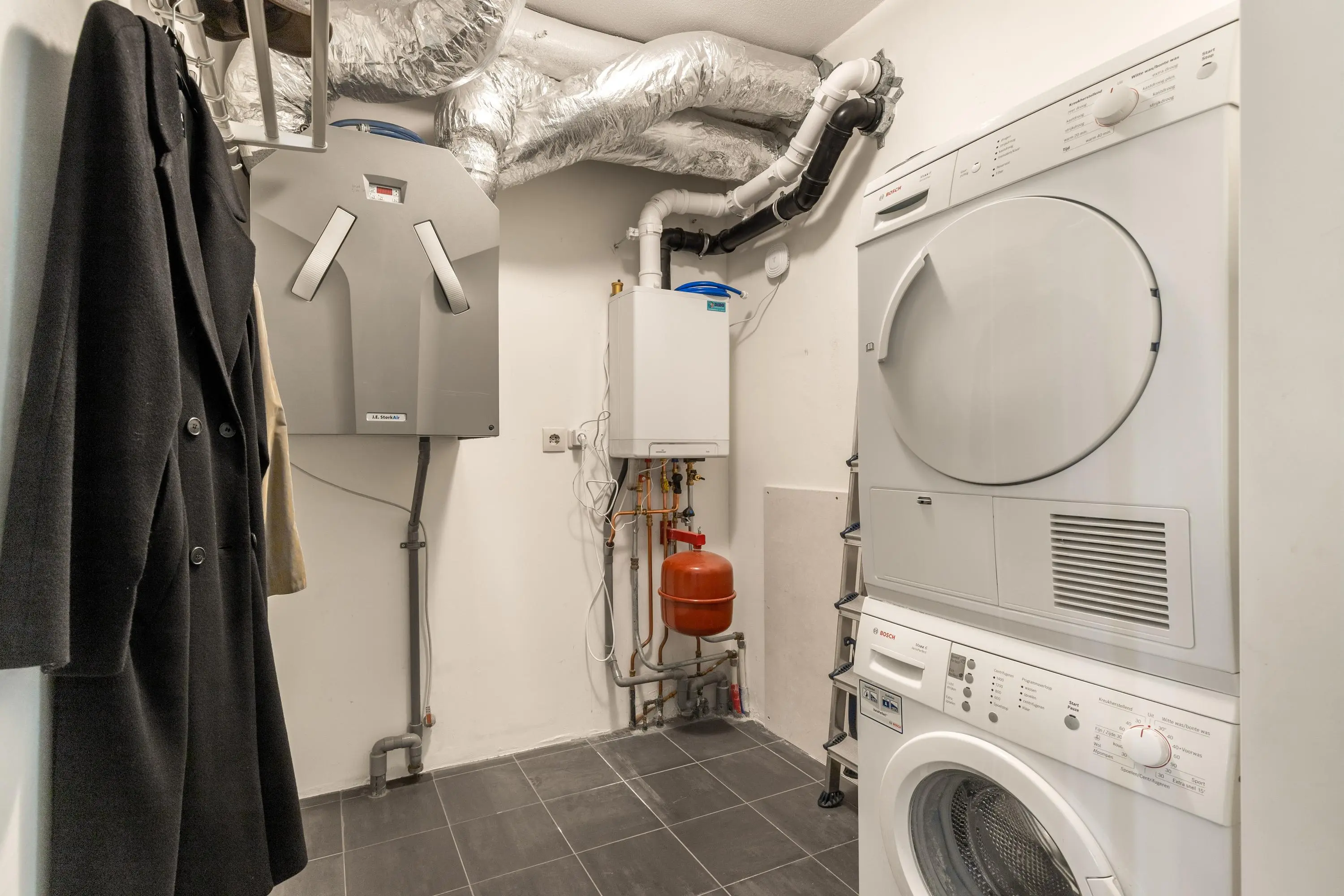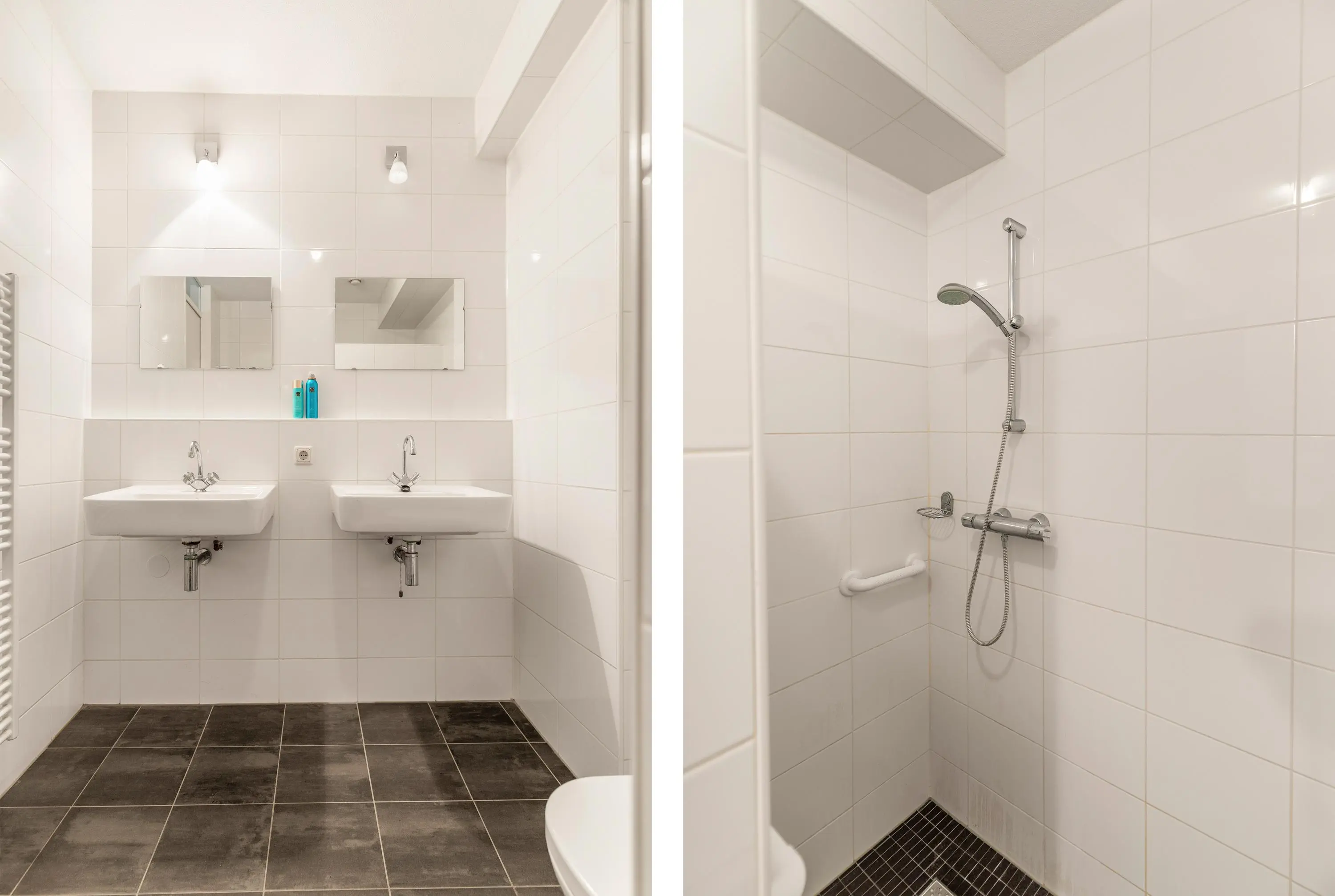 De badkamer is modern en eveneens in neutrale kleuren stijl uitgevoerd. De badkamer beschikt over een inloopdouche, tweede toilet en twee wastafels. Naast de badkamer is nog een extra ruimte aanwezig met de wasmachine aansluiting, de warmte terugwininstallatie en de CV-ketel (2024). Tevens is in de parkeerkelder een eigen parkeerplaats en een eigen berging aanwezig.