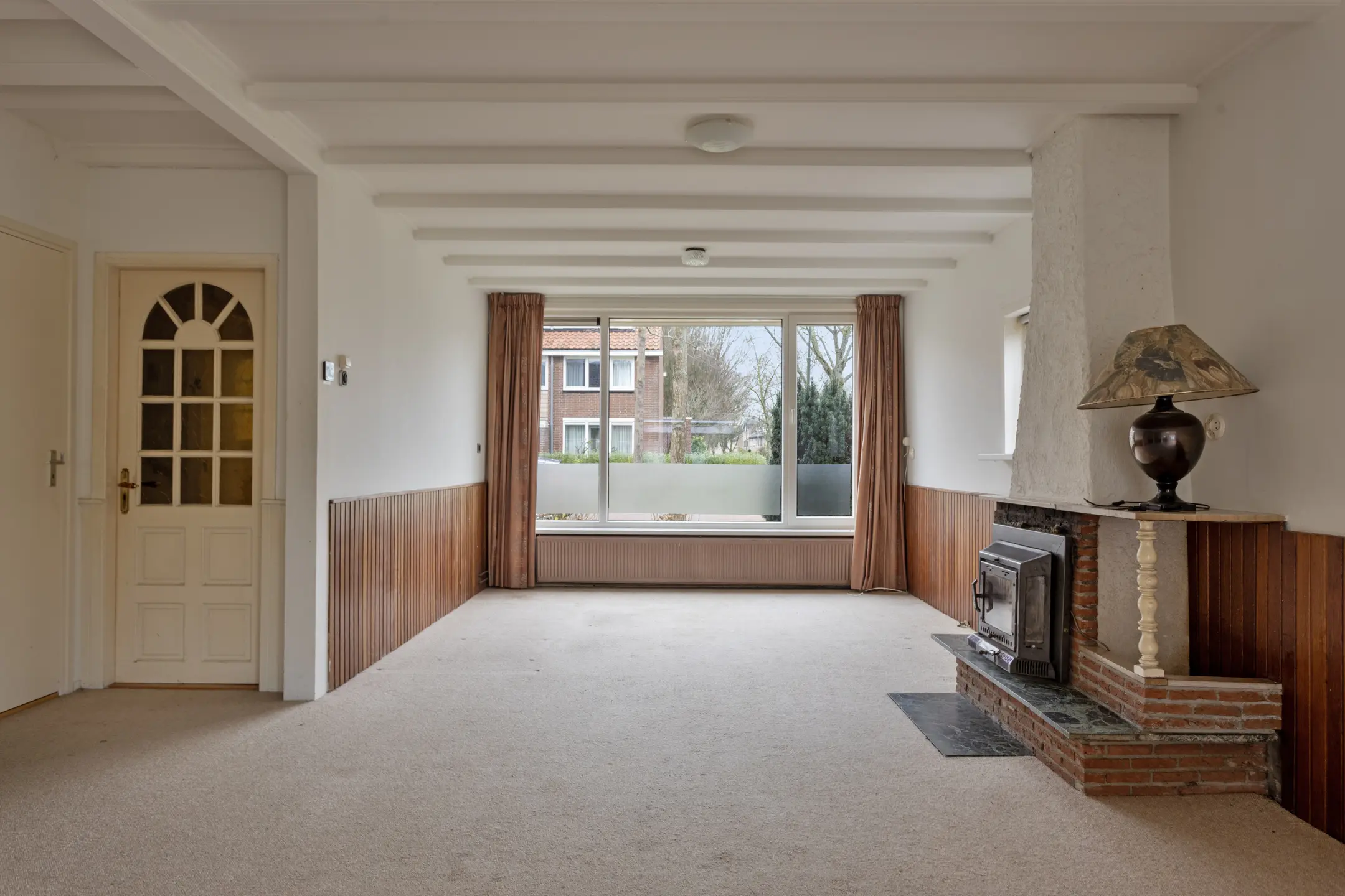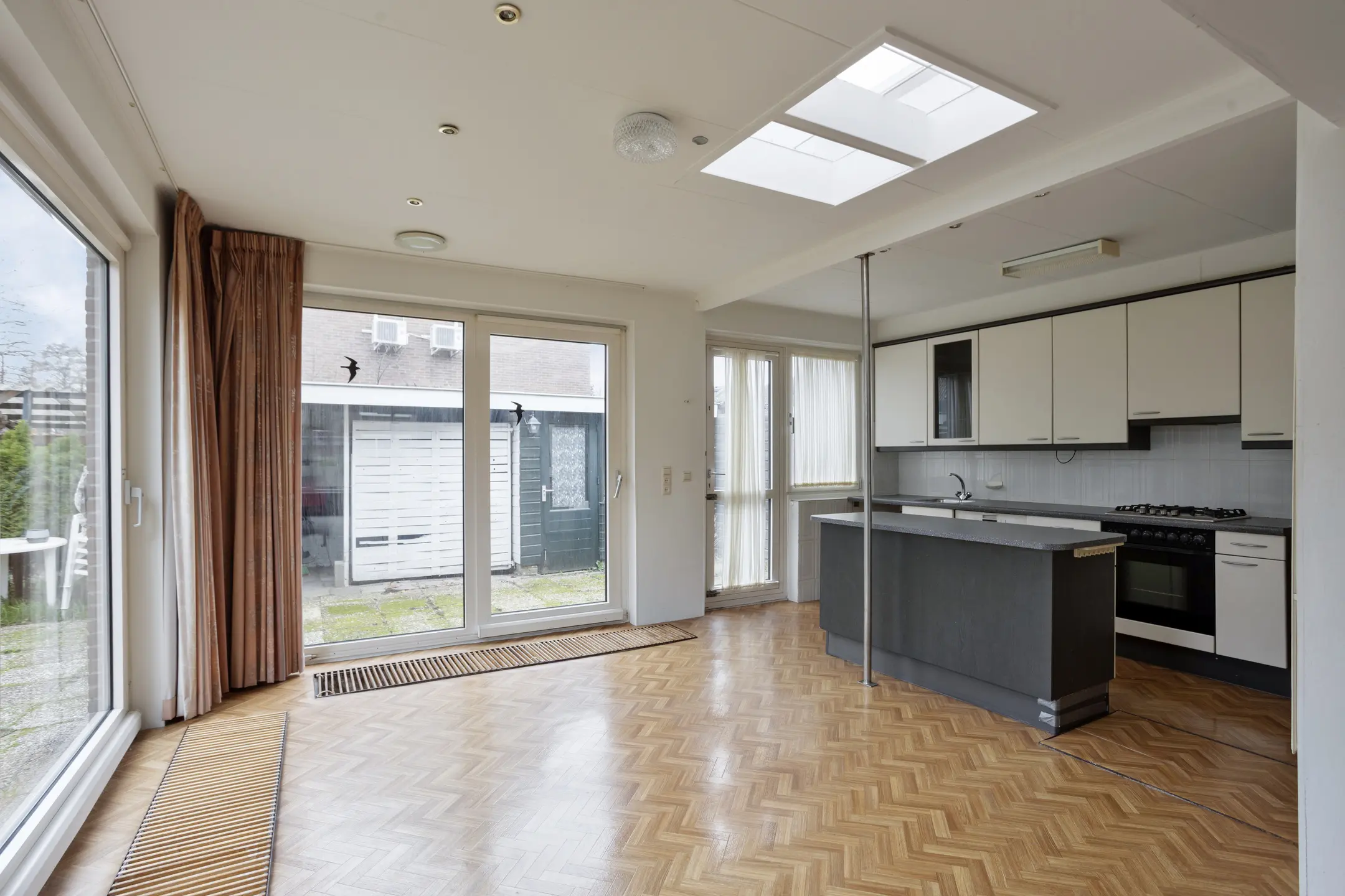 Bij binnenkomst valt direct de ruime en lichte woonkamer op. De uitbouw over de gehele breedte aan de achterzijde zorgt voor een zee van ruimte, geschikt voor een prachtige open keuken en fijne eethoek. Er zijn twee schuifpuien aanwezig die toegang verschaffen tot de achter- en zijtuin. Dit draagt bij aan het gevoel van ruimte en tevens is hierdoor de aansluiting met het buitenleven optimaal. De woonkamer biedt voldoende plek voor een royale zithoek en vormt een prettige basis voor een modernisering naar eigen wens, al dan niet met een openhaard.